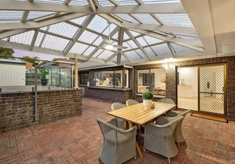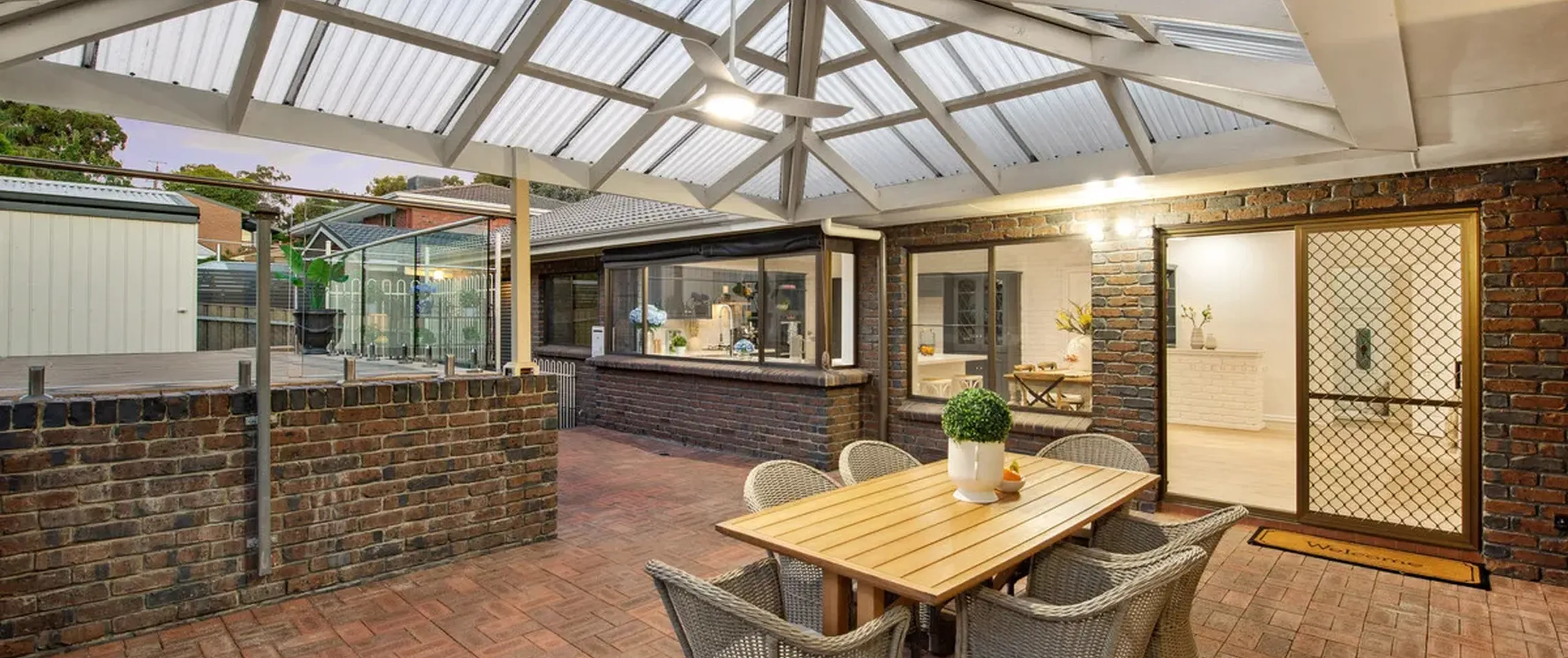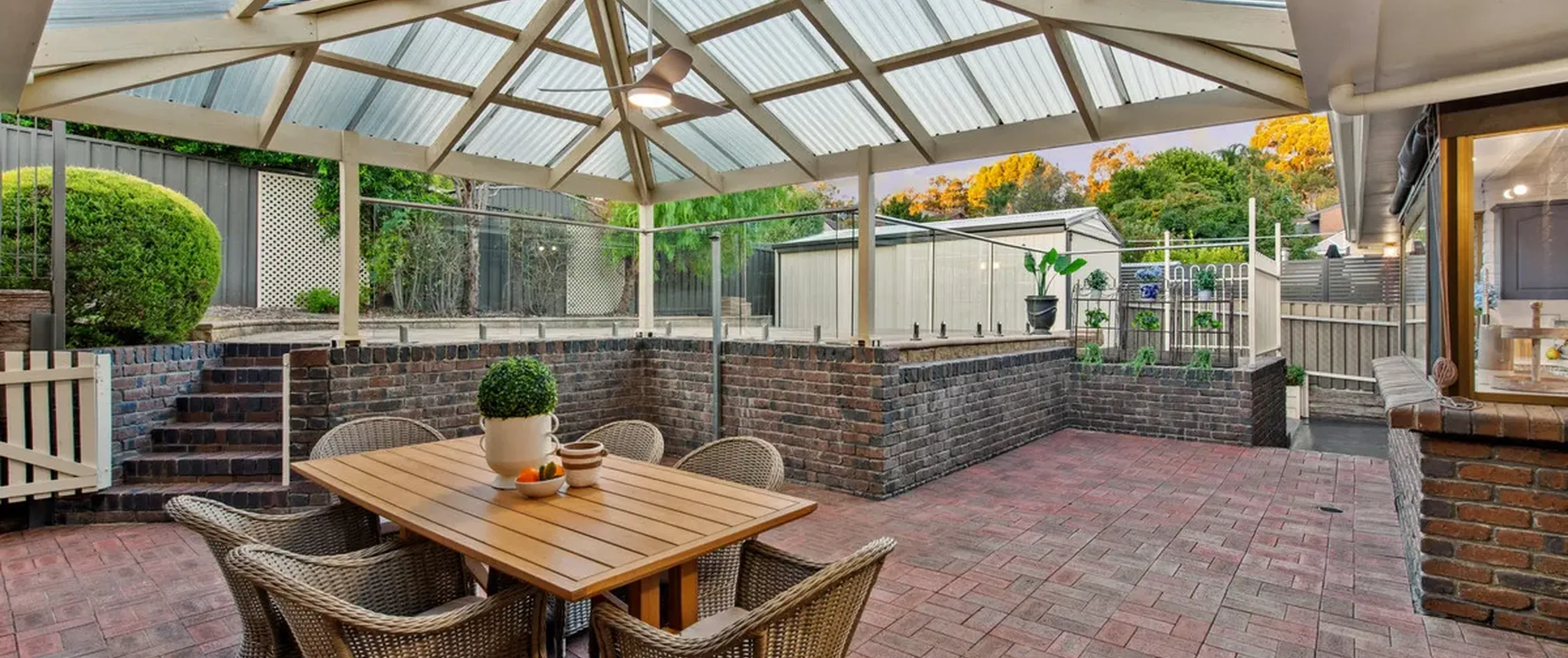 - Brick paved outdoor entertaining with a pitched-roof pergola and r/c ceiling fan and LED lighting