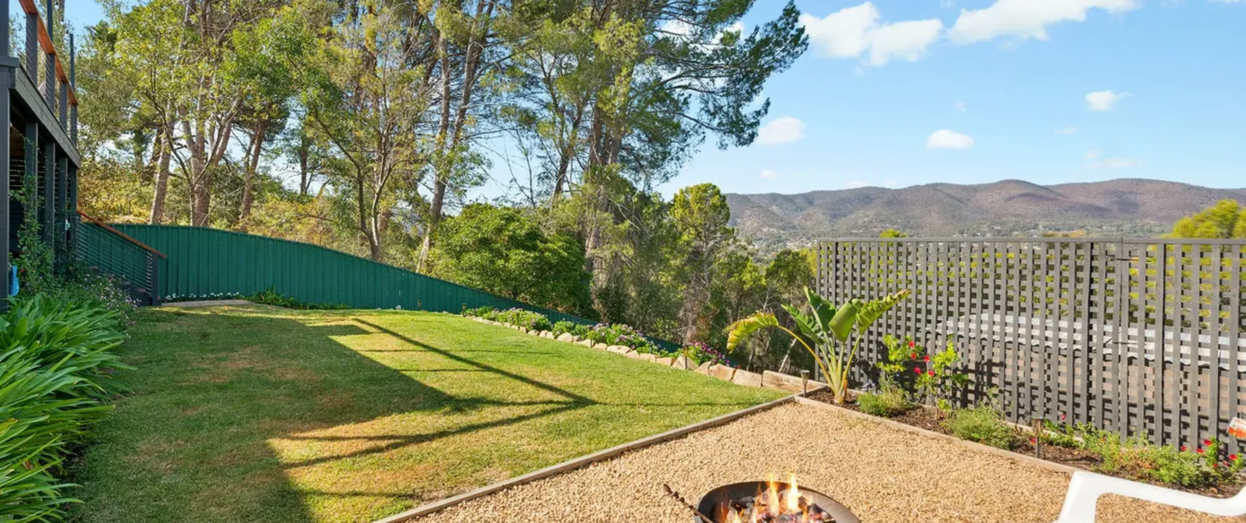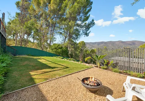 Venture into the expansive backyard to discover a meticulously maintained garden oasis, offering lush greenery, creating an idyllic setting for relaxation and cozy evenings by the fire.