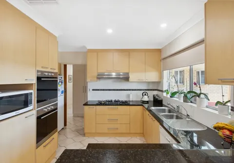 - Modern kitchen with 900mm gas cooktop, double oven and dishwasher, sweeping benchtops walk-in pantry and ample storage space
