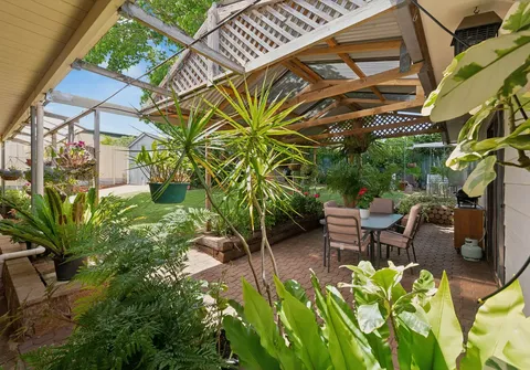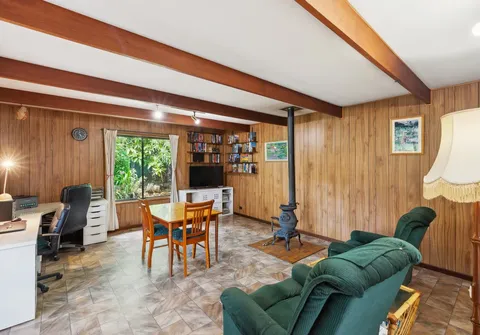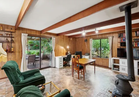 Step outdoors to discover an impressive entertaining area, featuring a pergola that overlooks the meticulously maintained garden. With access to a large shed and an additional pitched-roof pergola, this outdoor space is perfect for daily relaxation. The fully equipped rumpus room, showcasing timber beams, a combustion heater, and air-conditioning, adds both charm and functionality.