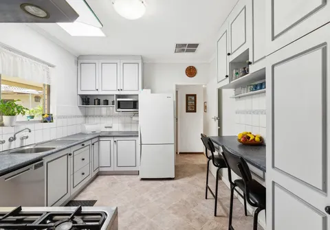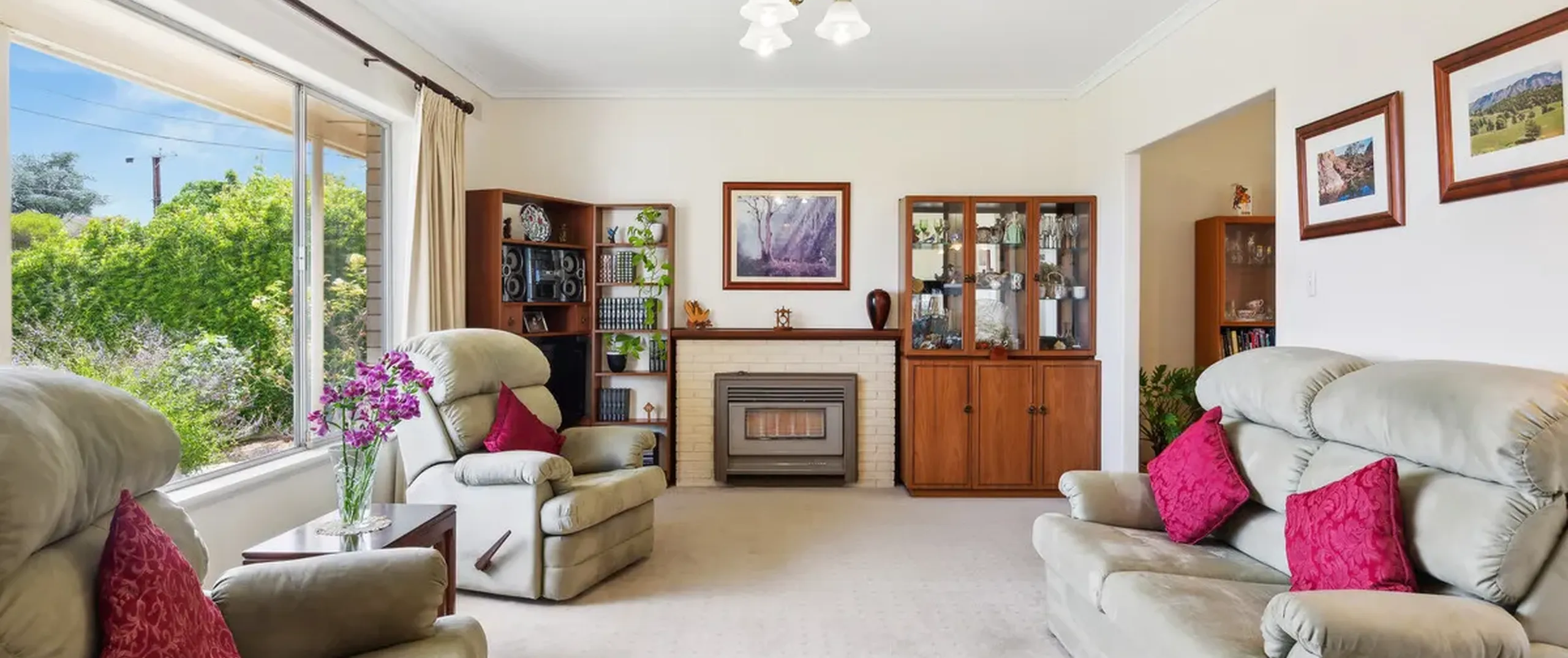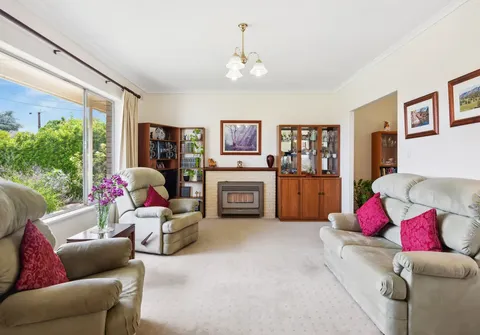 A light-filled lounge room welcomes you, complete with a heater for added comfort, leading into the dining room. The well-appointed kitchen is equipped with a gas cooktop, ample storage, and a convenient breakfast bar.