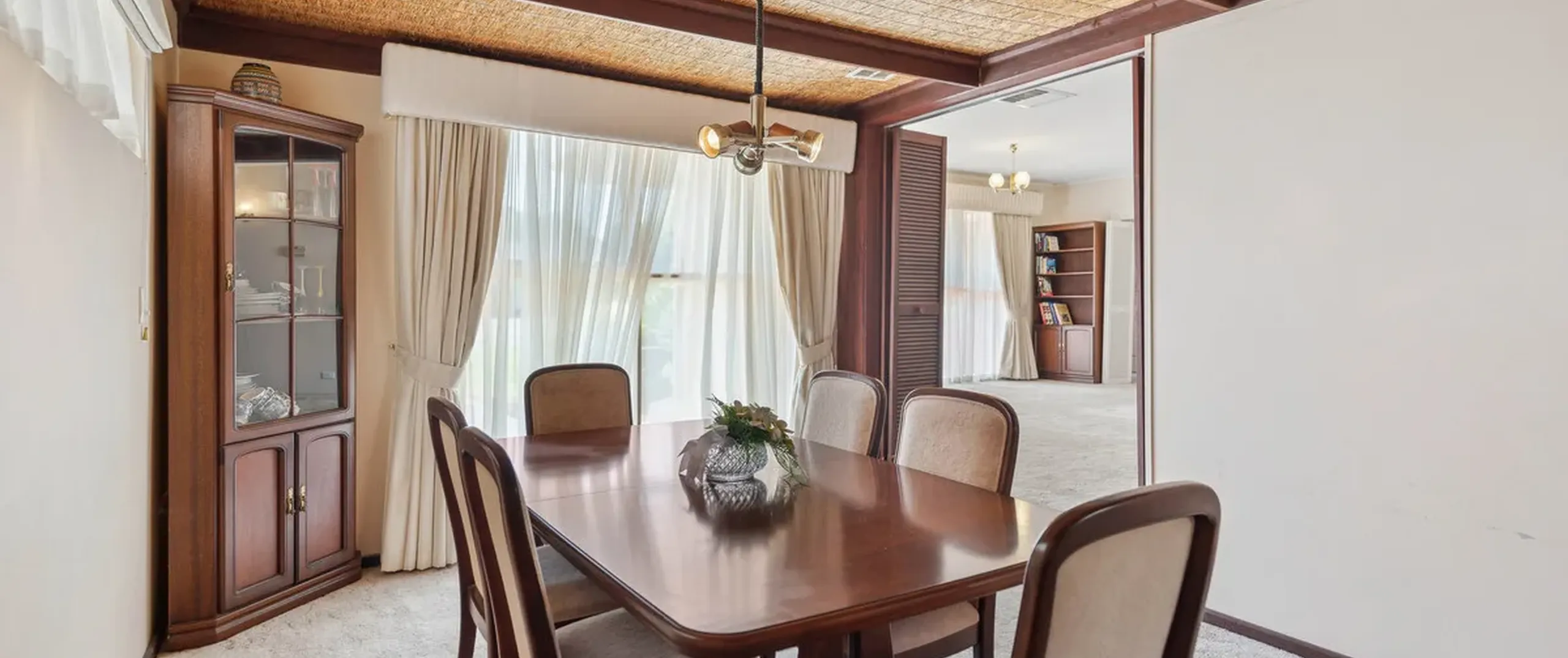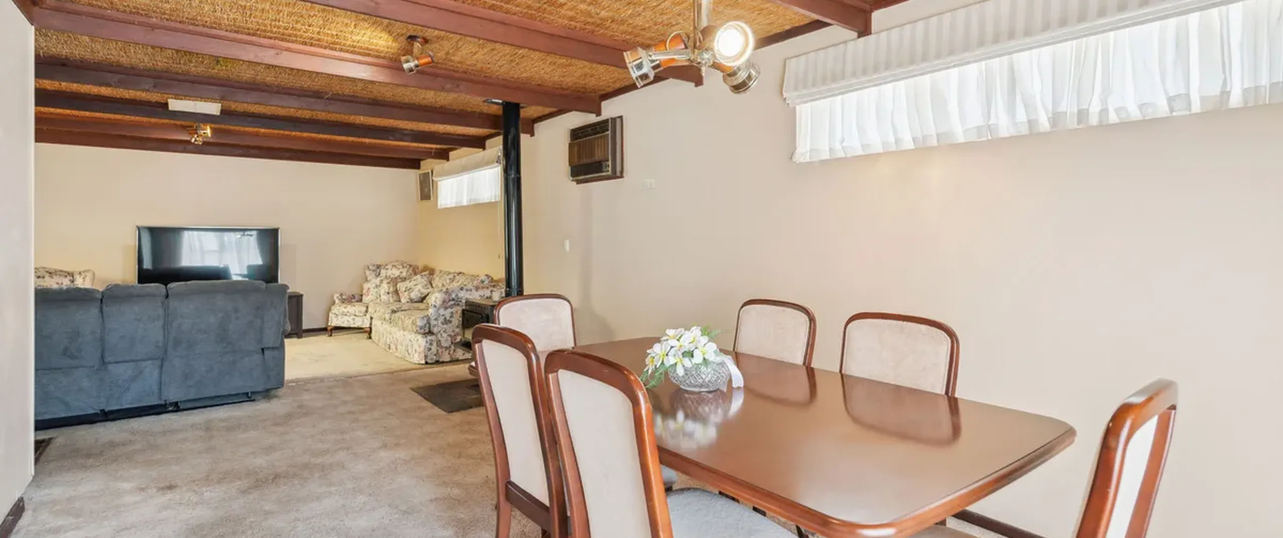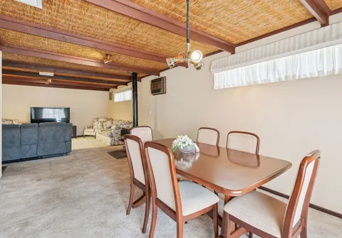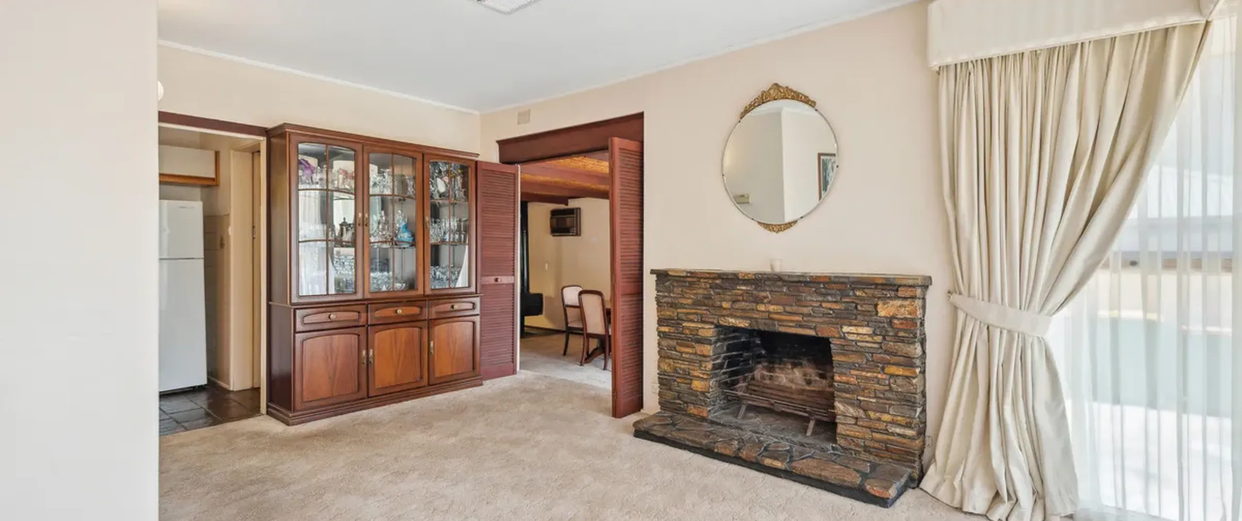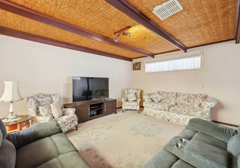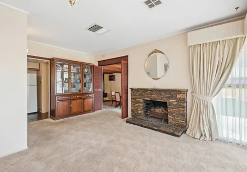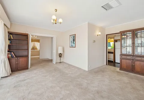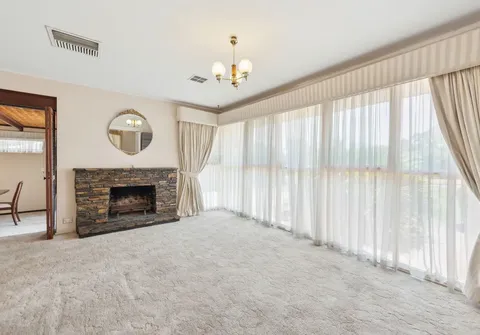 Step inside to a spacious lounge room, where plush carpets, elegant curtains, a charming light fixture, and a cozy fireplace create a warm and inviting atmosphere. The seamless flow leads into the dining area, family room, and neutral-toned kitchen, which boasts ample storage and a picturesque view of the expansive backyard. The home also features an original main bathroom, a separate toilet, and a laundry for added convenience.