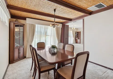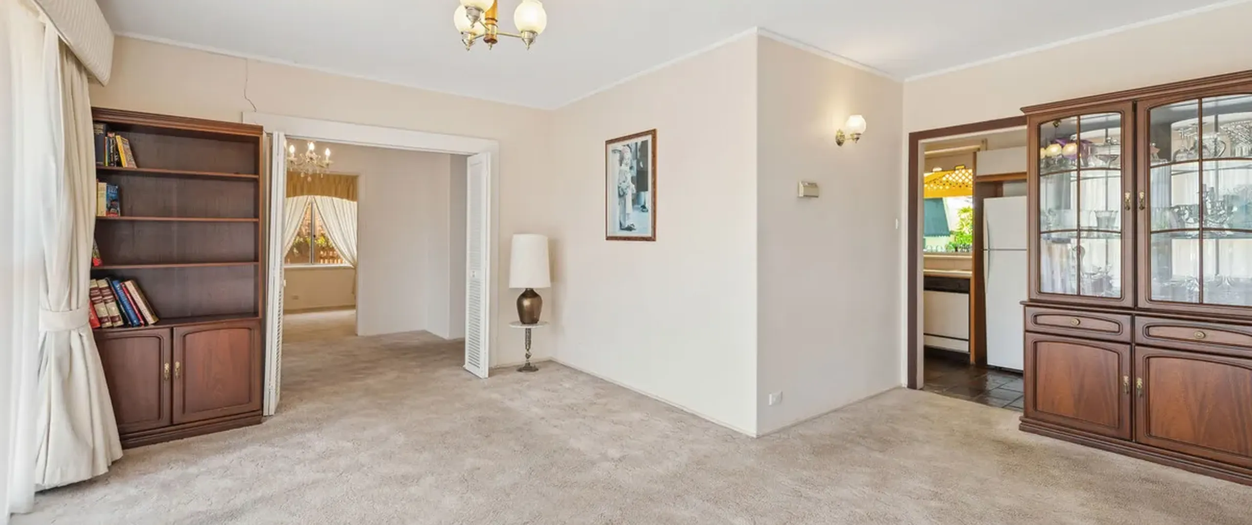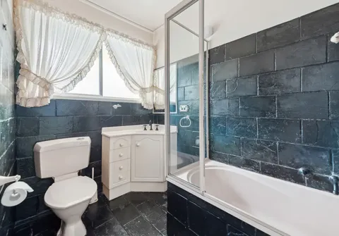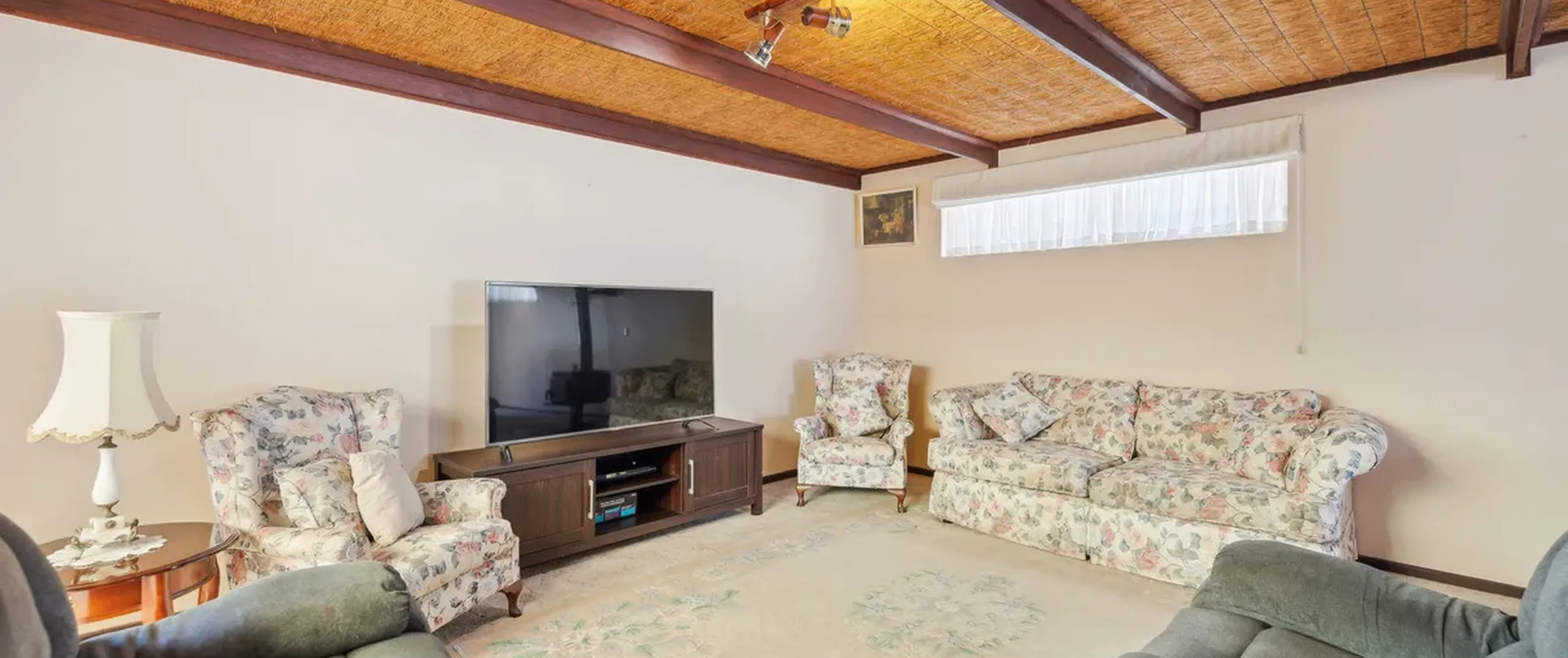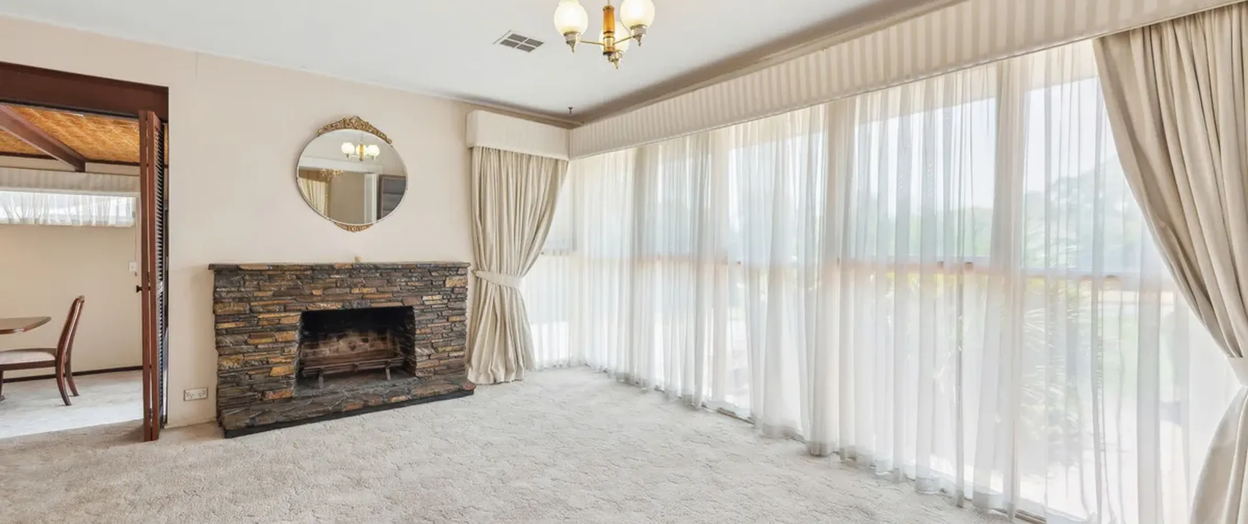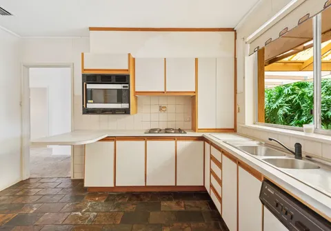Step inside to a spacious lounge room, where plush carpets, elegant curtains, a charming light fixture, and a cozy fireplace create a warm and inviting atmosphere. The seamless flow leads into the dining area, family room, and neutral-toned kitchen, which boasts ample storage and a picturesque view of the expansive backyard. The home also features an original main bathroom, a separate toilet, and a laundry for added convenience.