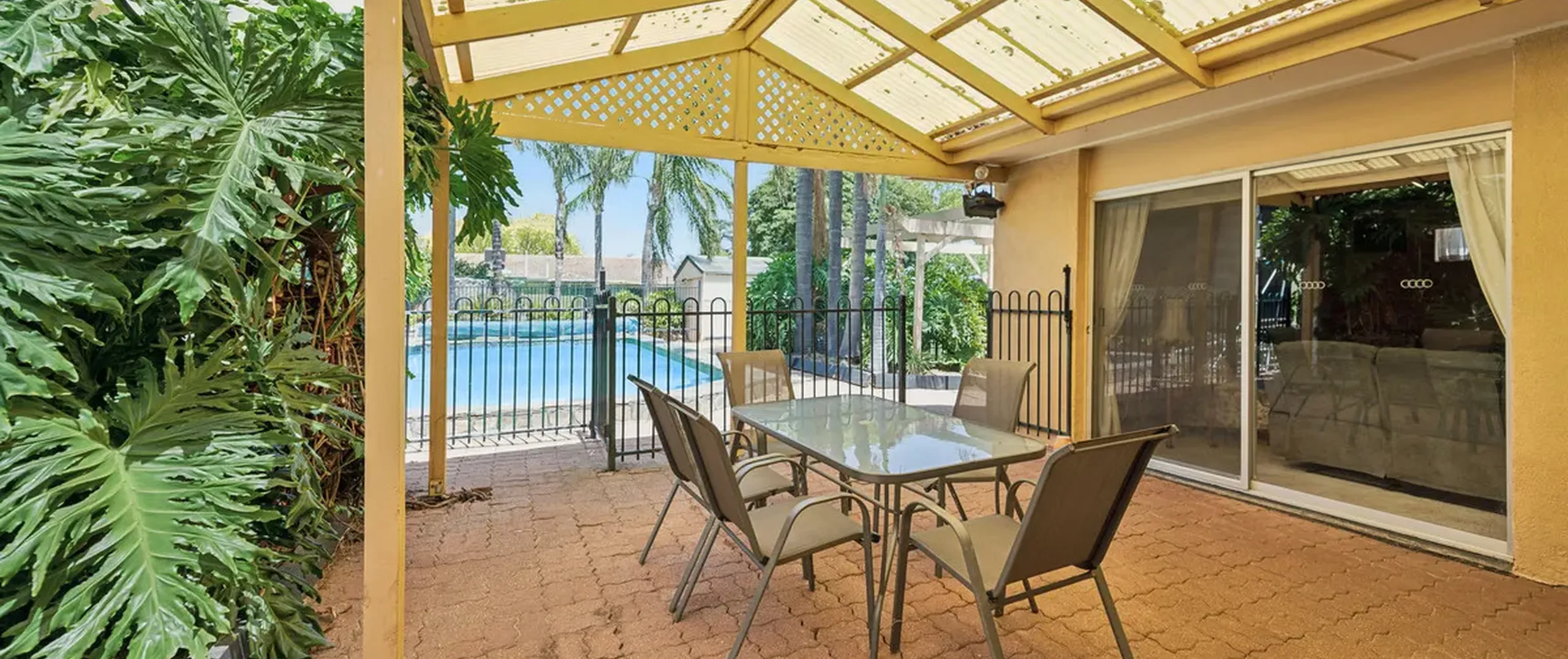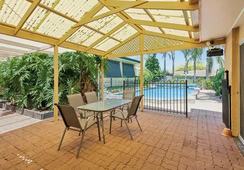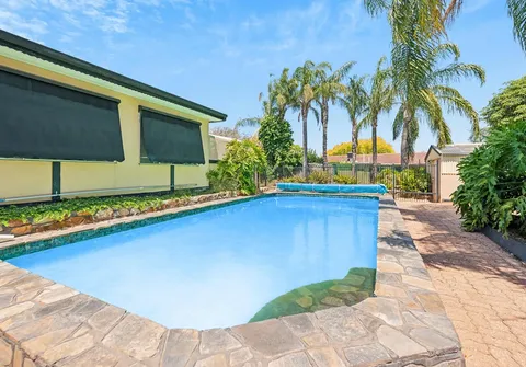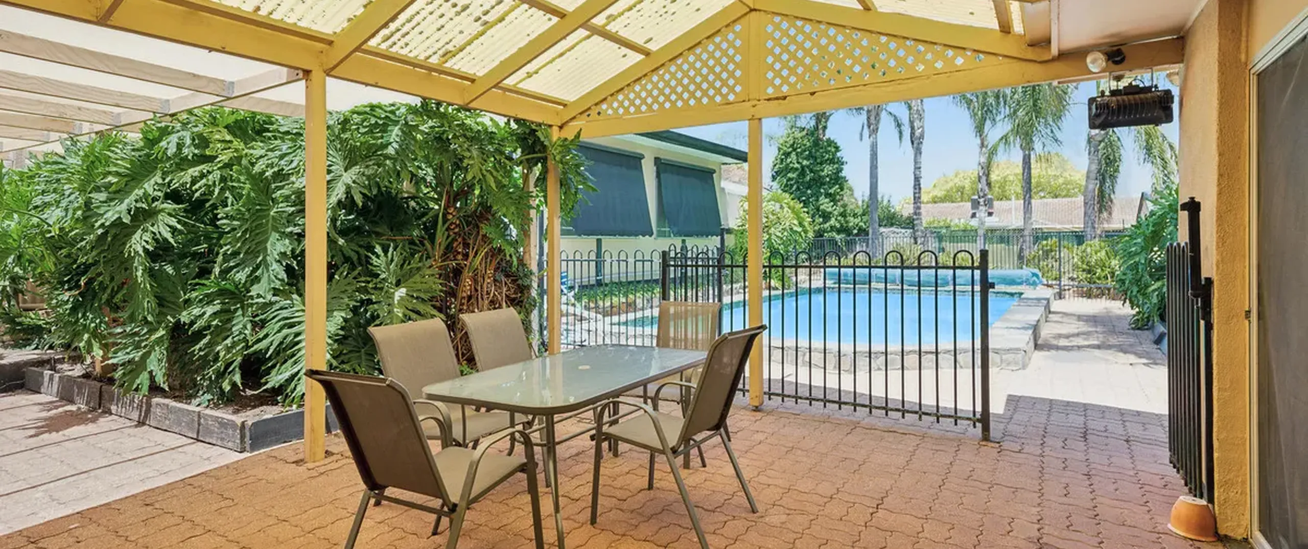 - Expansive backyard, complemented by a pitched-roof pergola for outdoor entertaining and an inground swimming pool