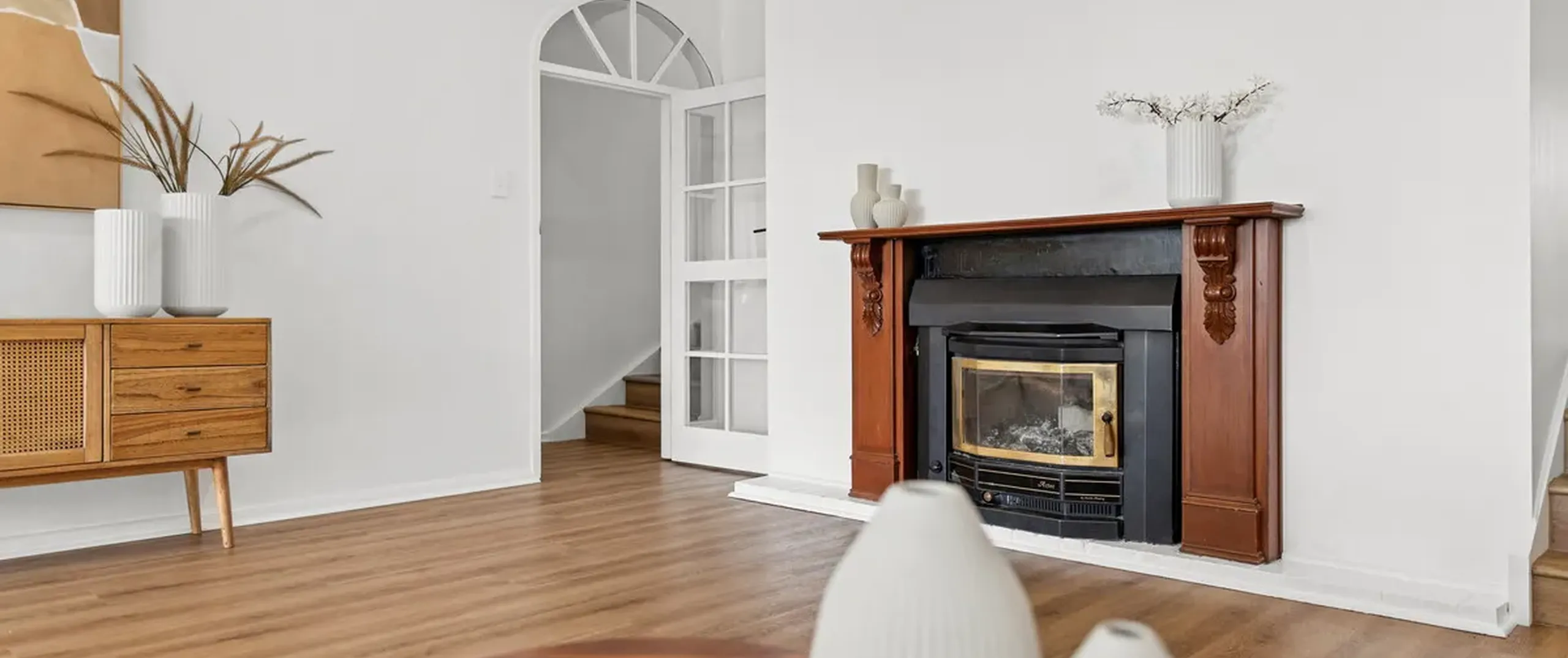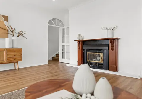 - Spacious living area showcasing stylish flooring and a feature fireplace