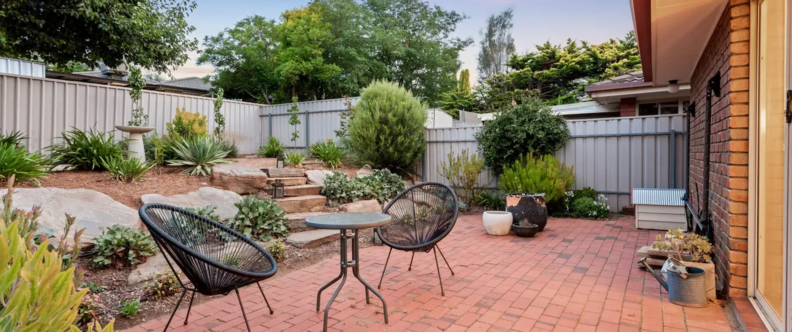 - Paved rear courtyard with landscaped garden surrounds