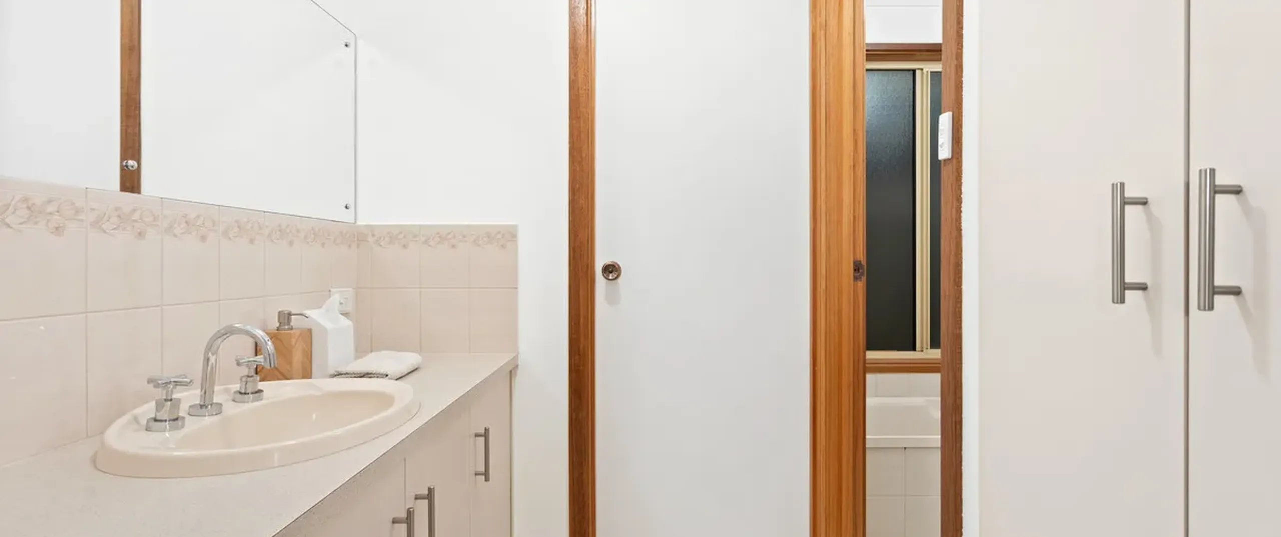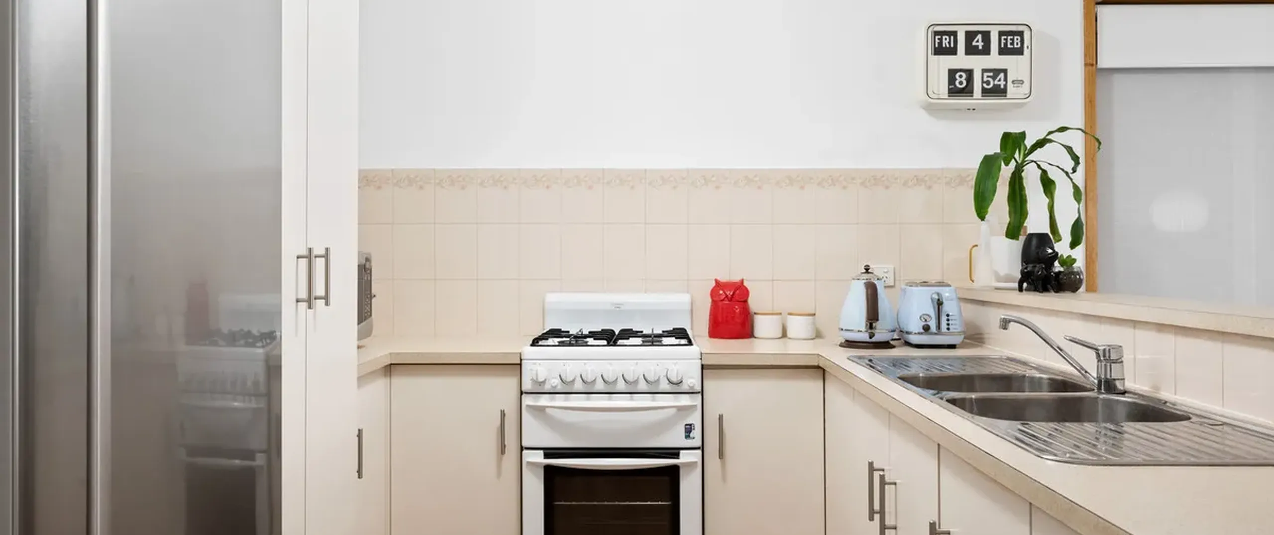 - Functional kitchen with double sink, gas cook top and ample cupboard space