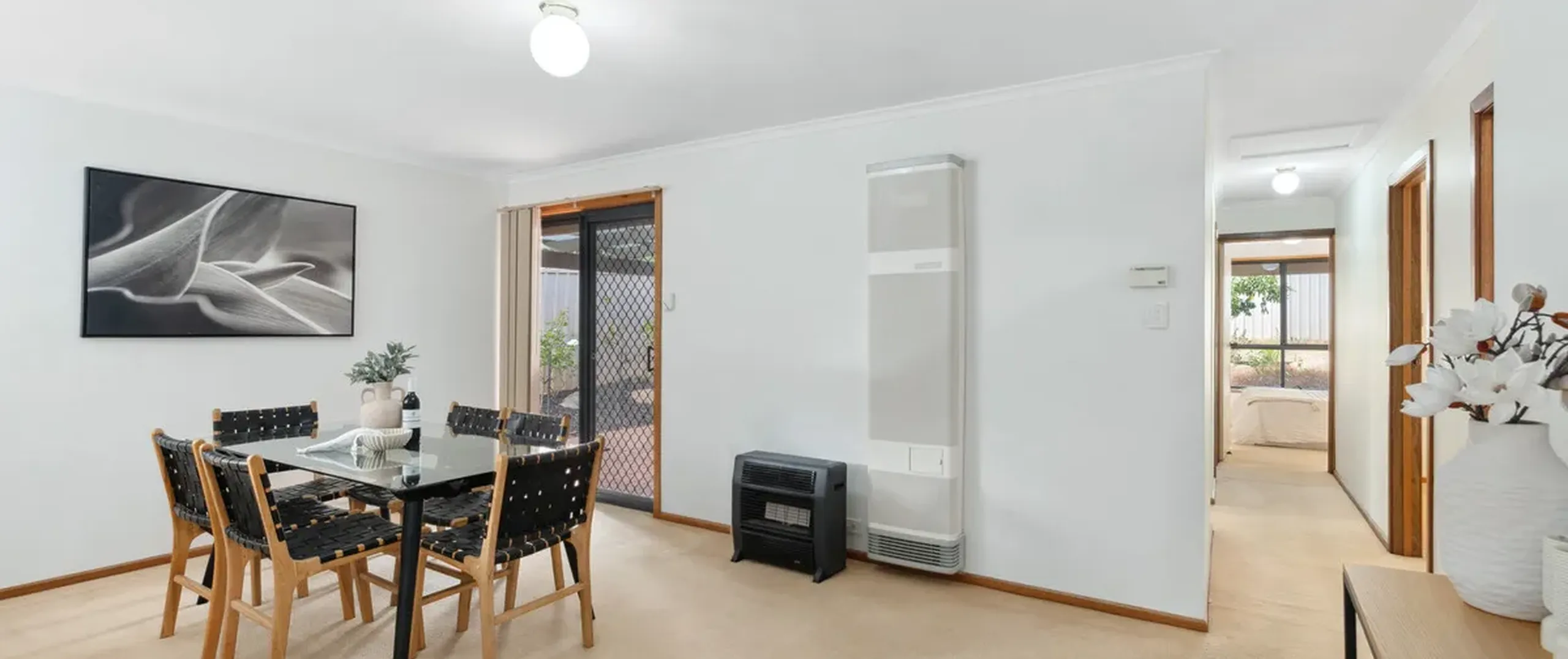 - Open plan living/dining includes heater and flows smoothly to the outdoors