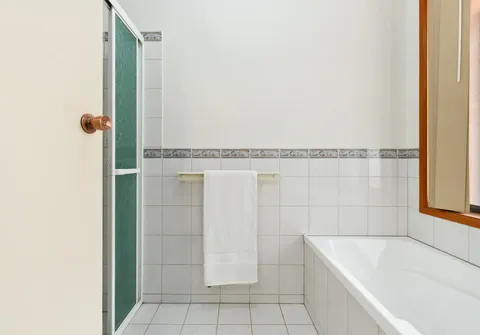 - Central main three-way bathroom with bath and shower, separate toilet and vanity
