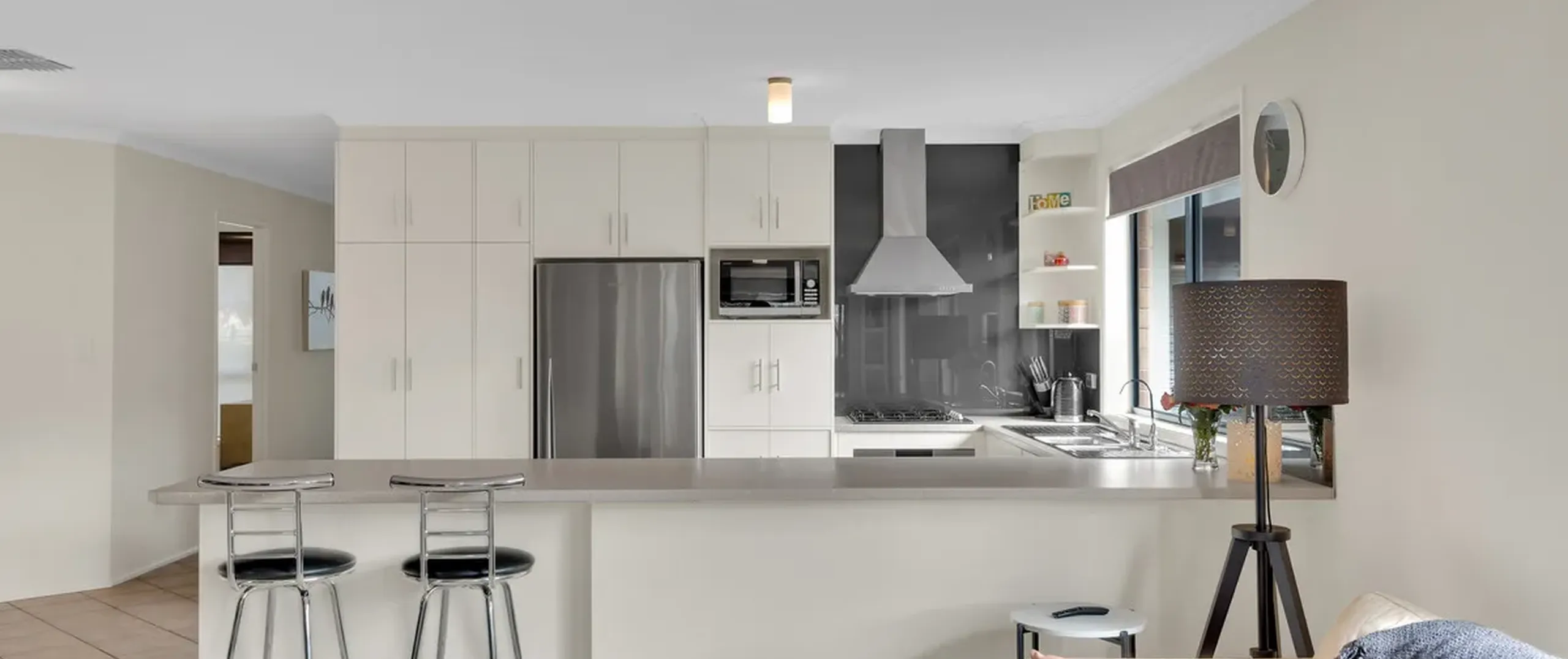 - Practical kitchen featuring breakfast bar, ample cupboard and bench space and stainless steel appliances including dishwasher and gas cooktop