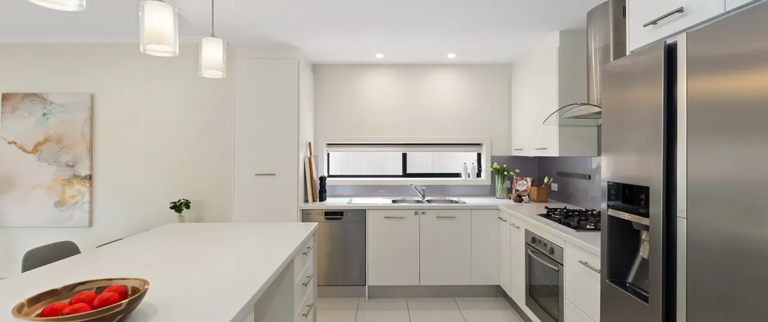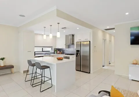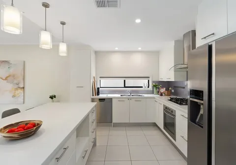 - Stylish kitchen with ample cupboard space, island bench with breakfast bar and stainless steel appliances including dishwasher