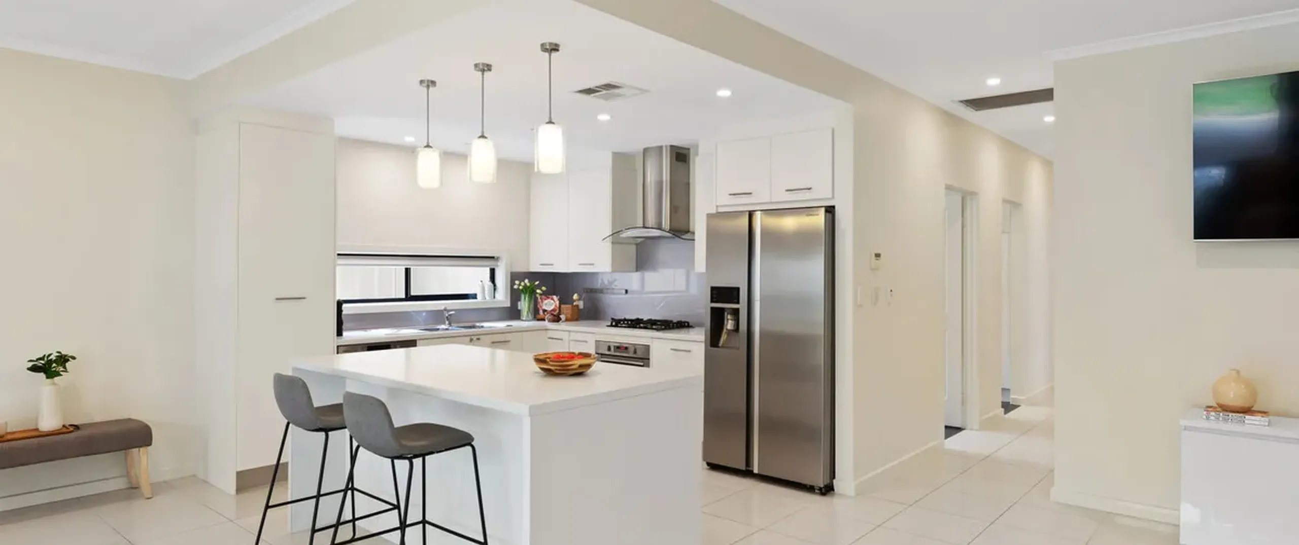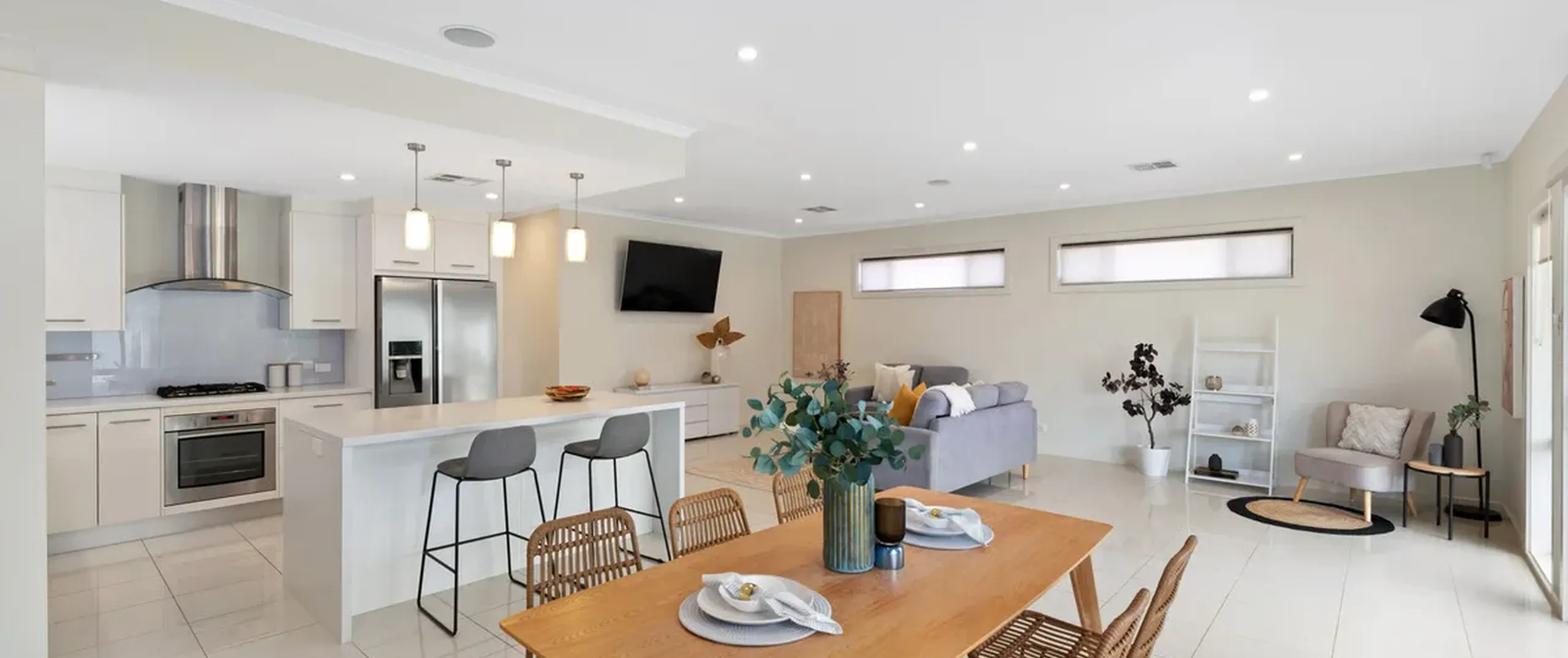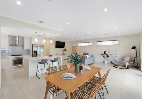 - Light filled open plan family and dining area with sleek easy-care flooring