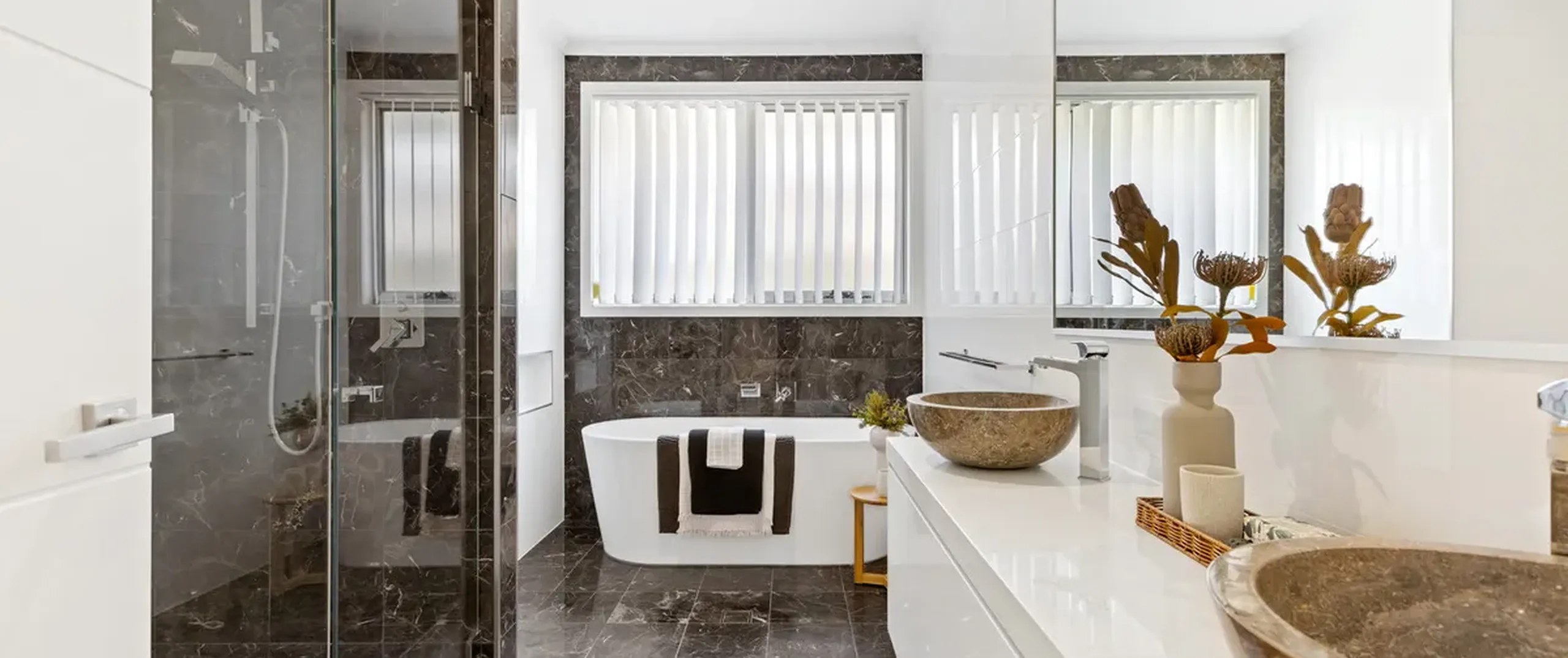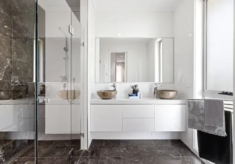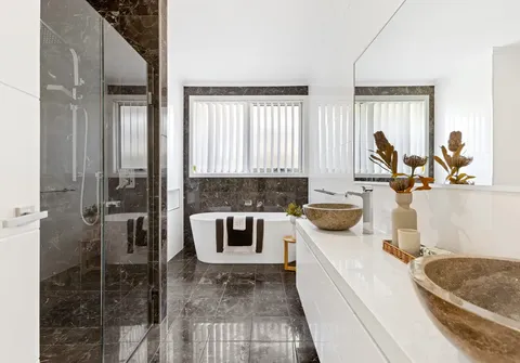 - Gorgeous main bathroom with marble basins, free standing bath and frameless shower
