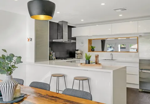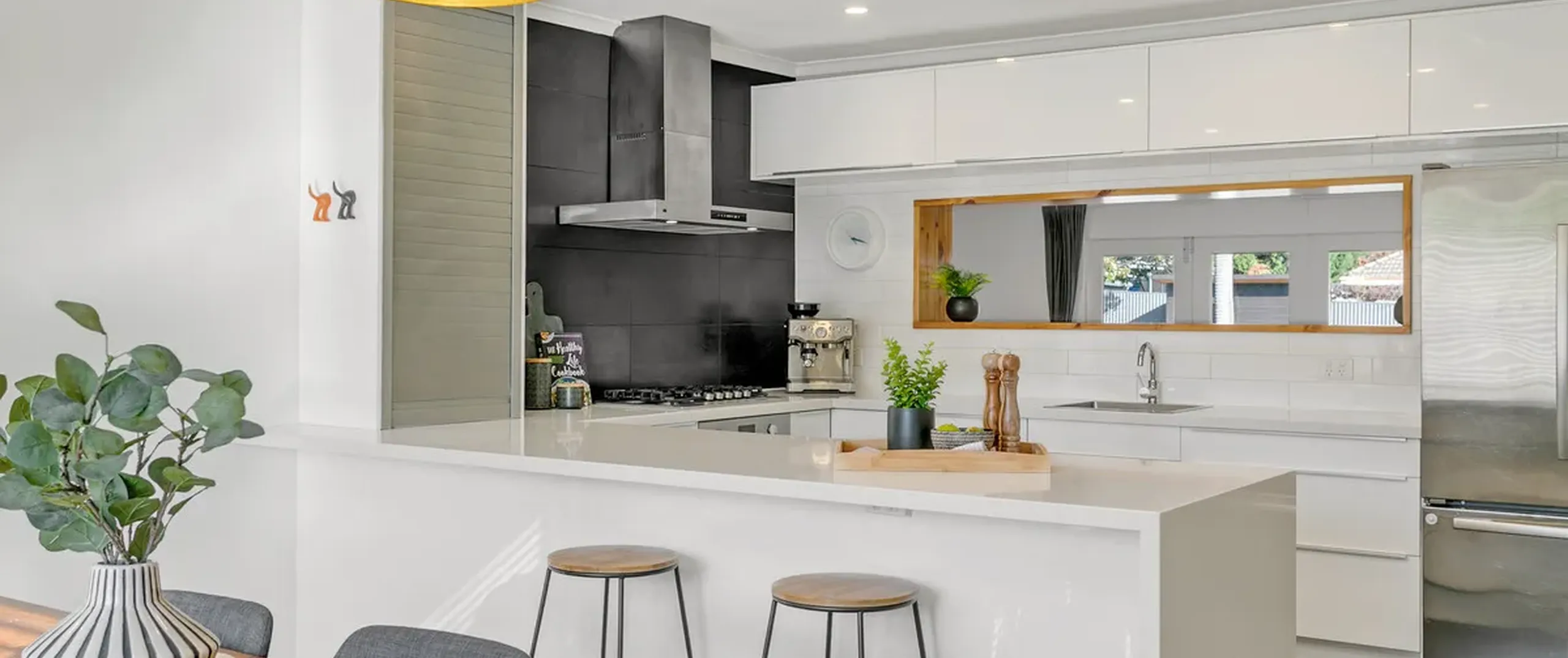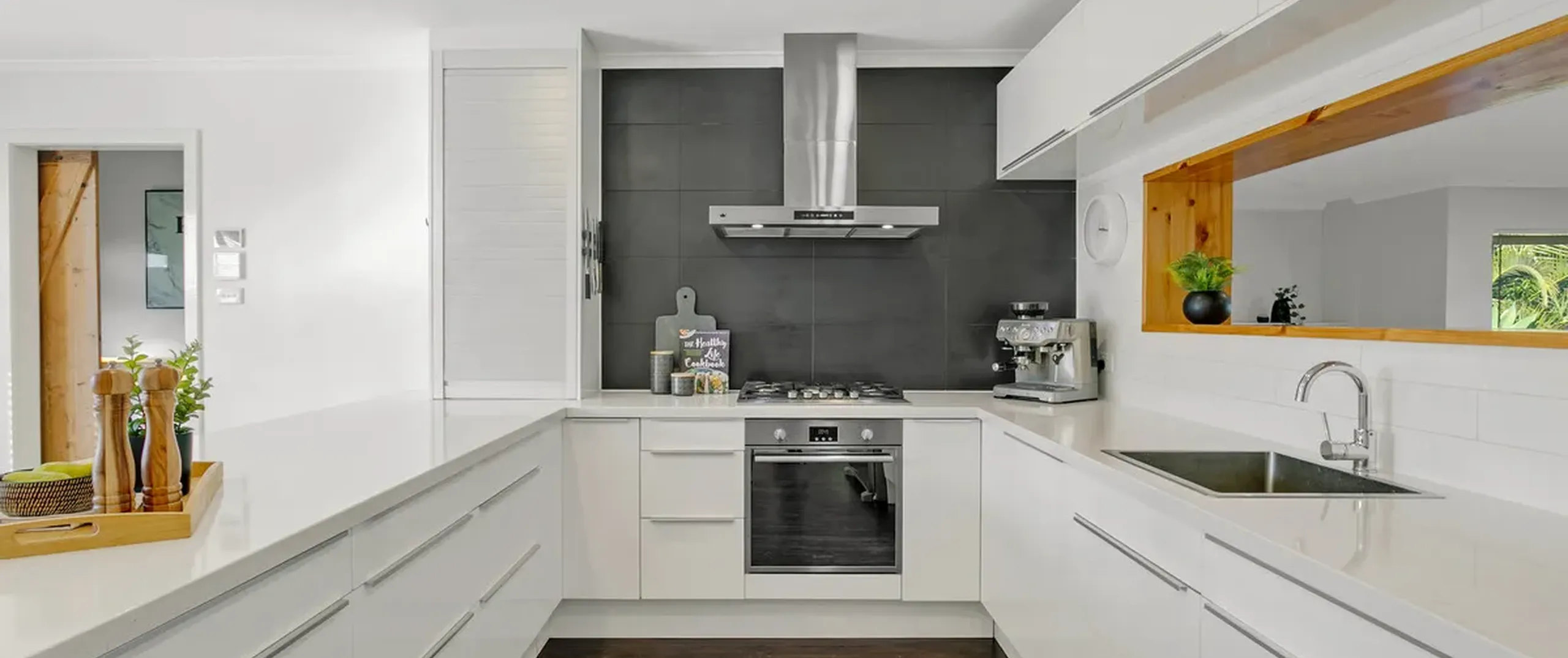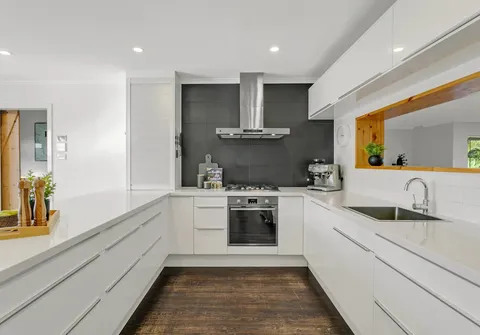 - Kitchen with Caesor stone bench tops, integrated dishwasher and 900mm gas cooktop