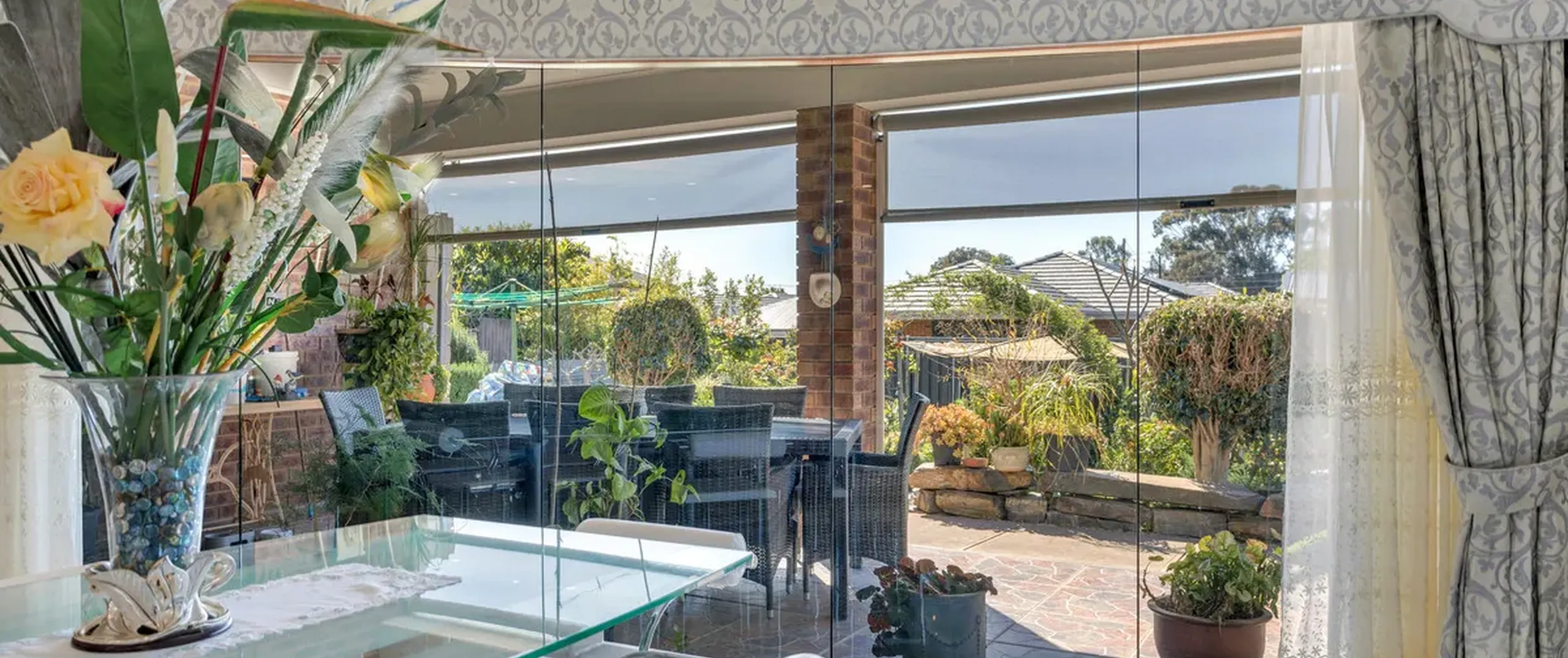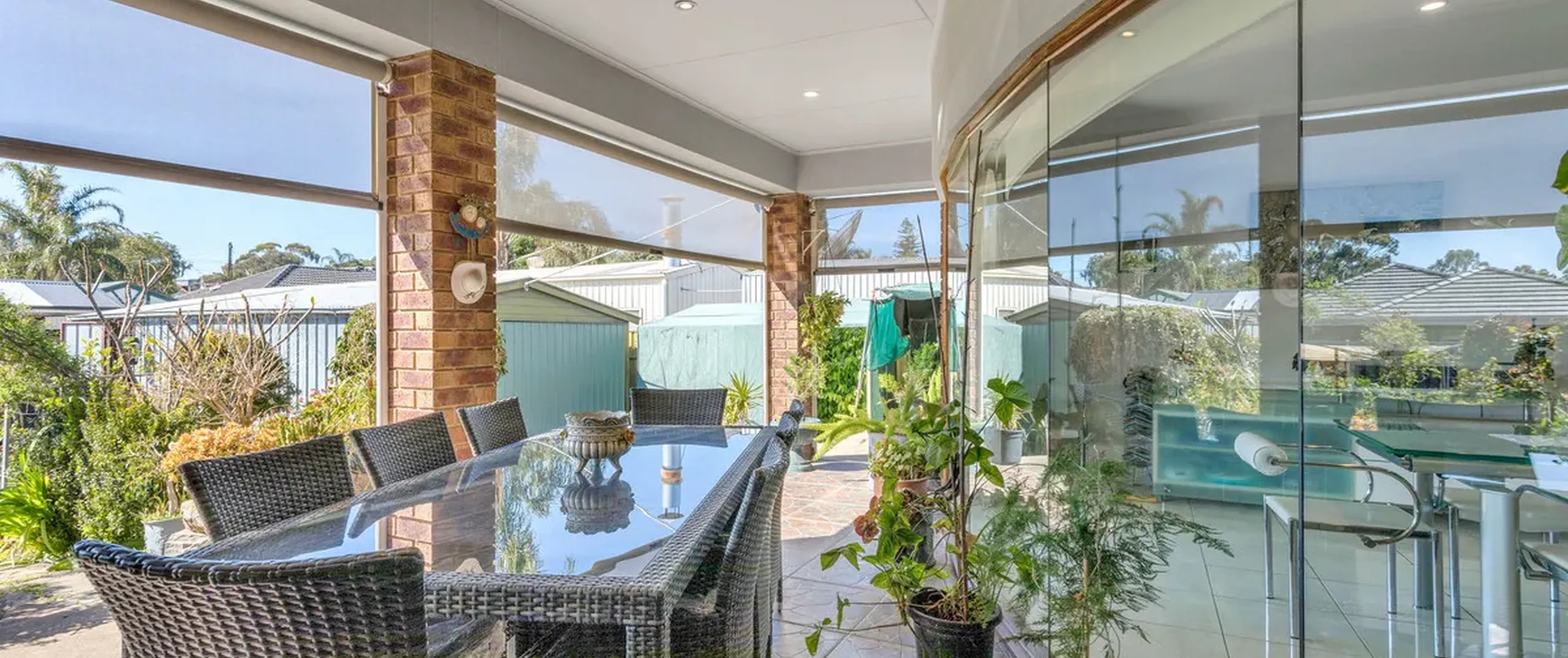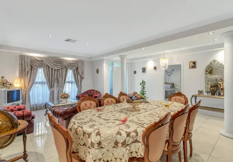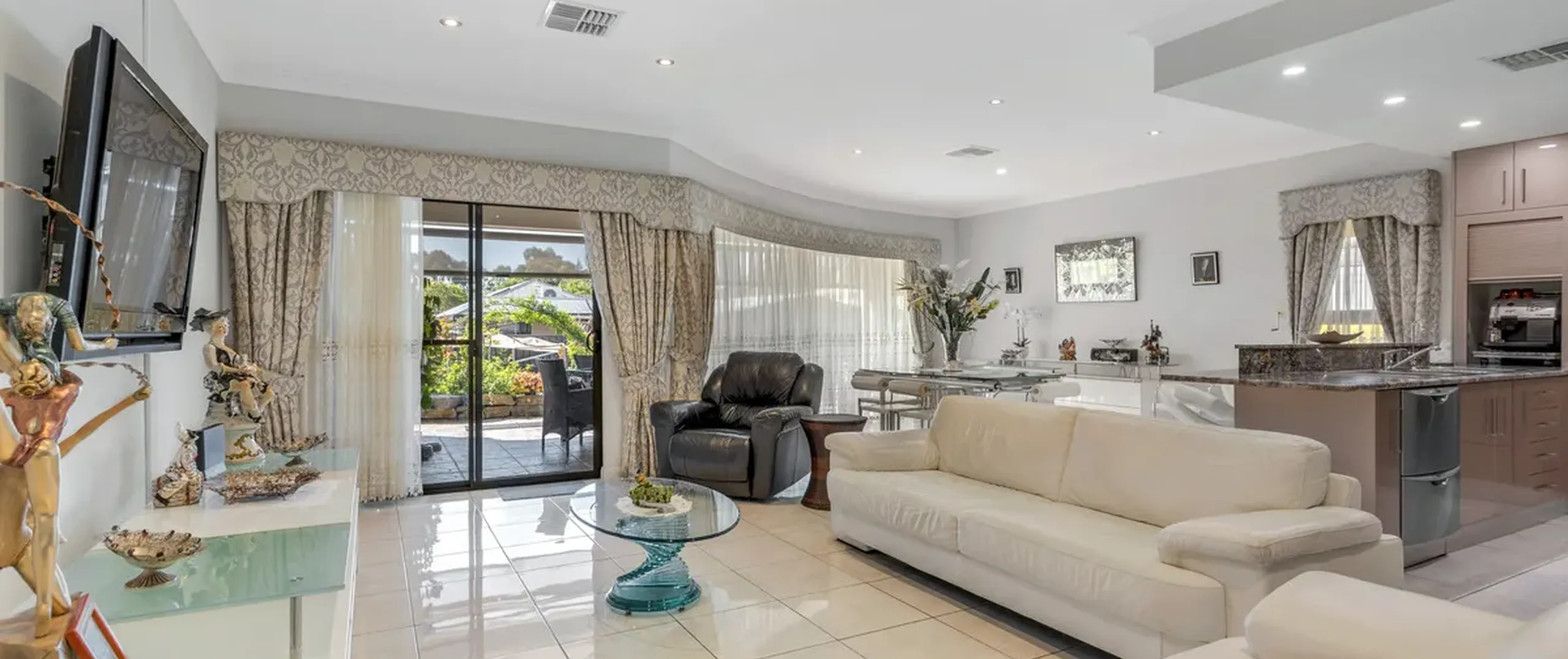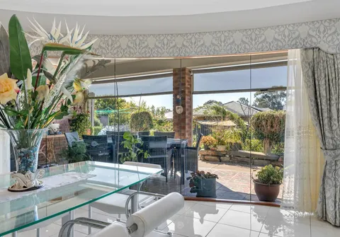 - Light filled open plan family and dining with fire place and stunning curved window overlooking backyard