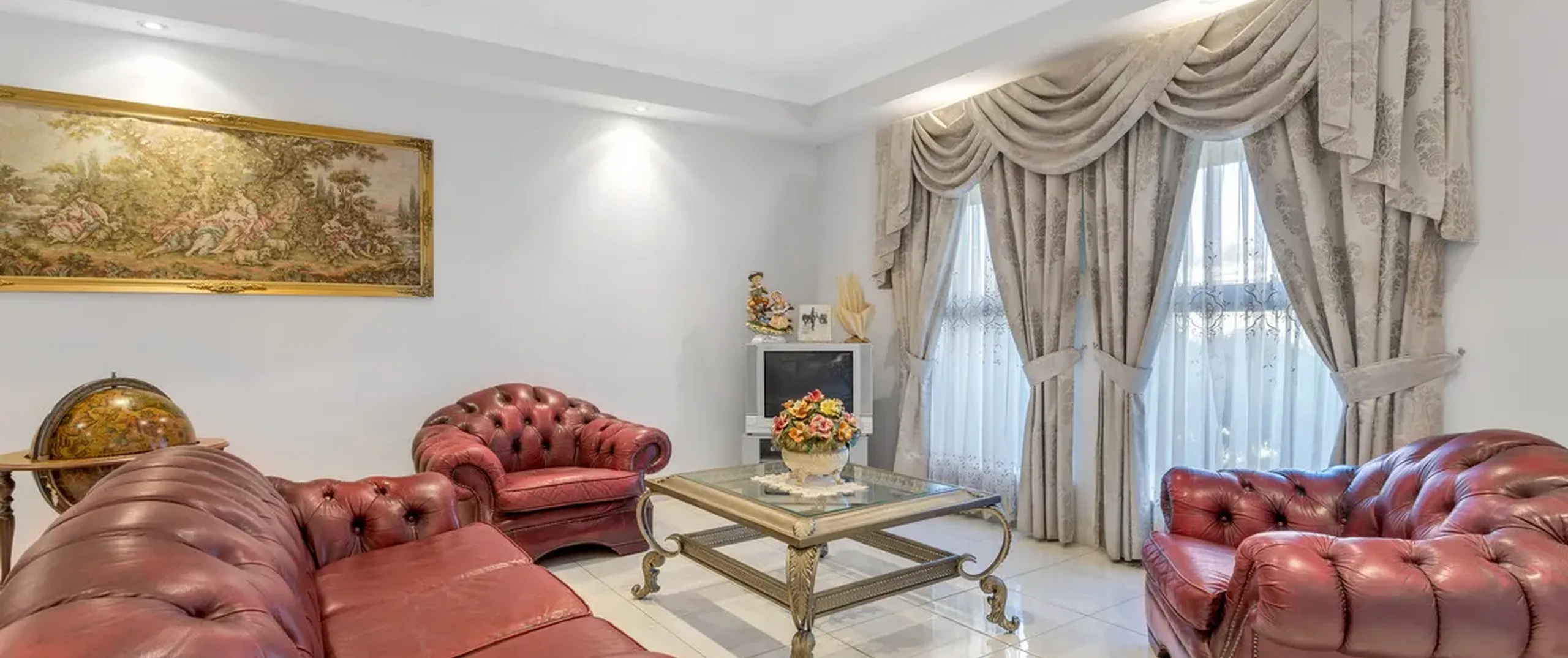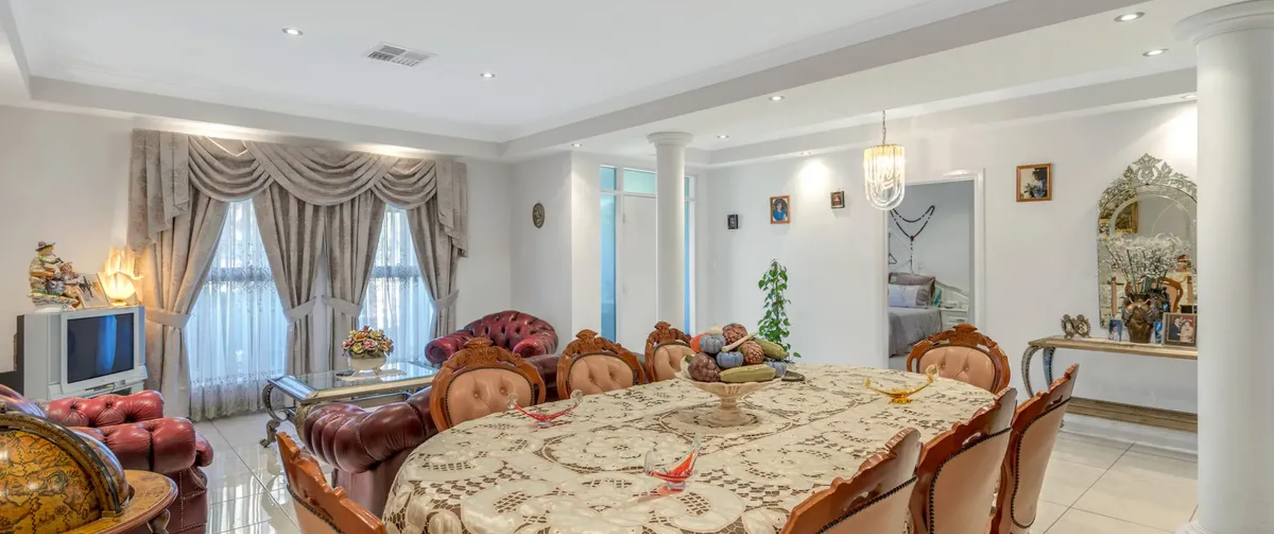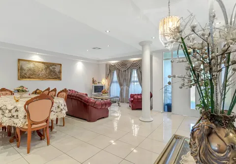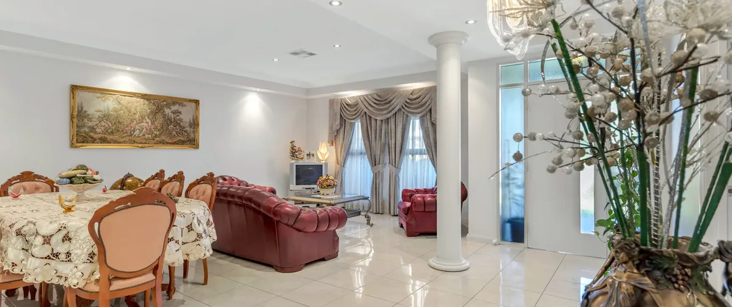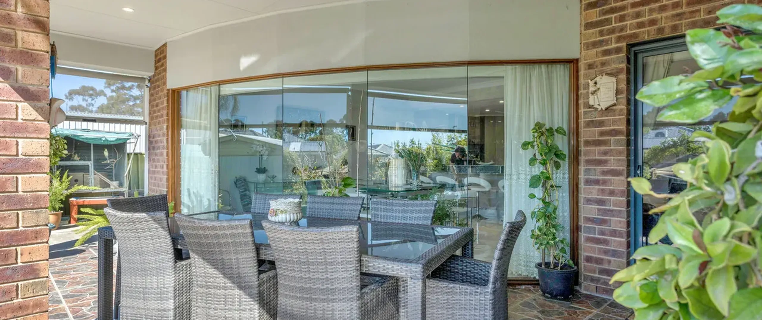 - Light filled open plan family and dining with fire place and stunning curved window overlooking backyard