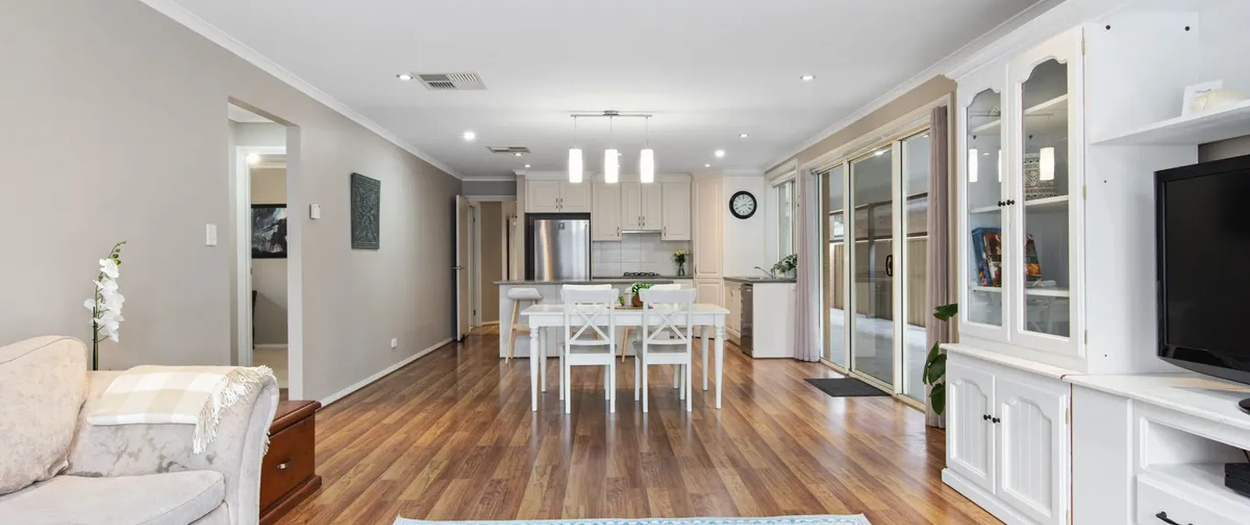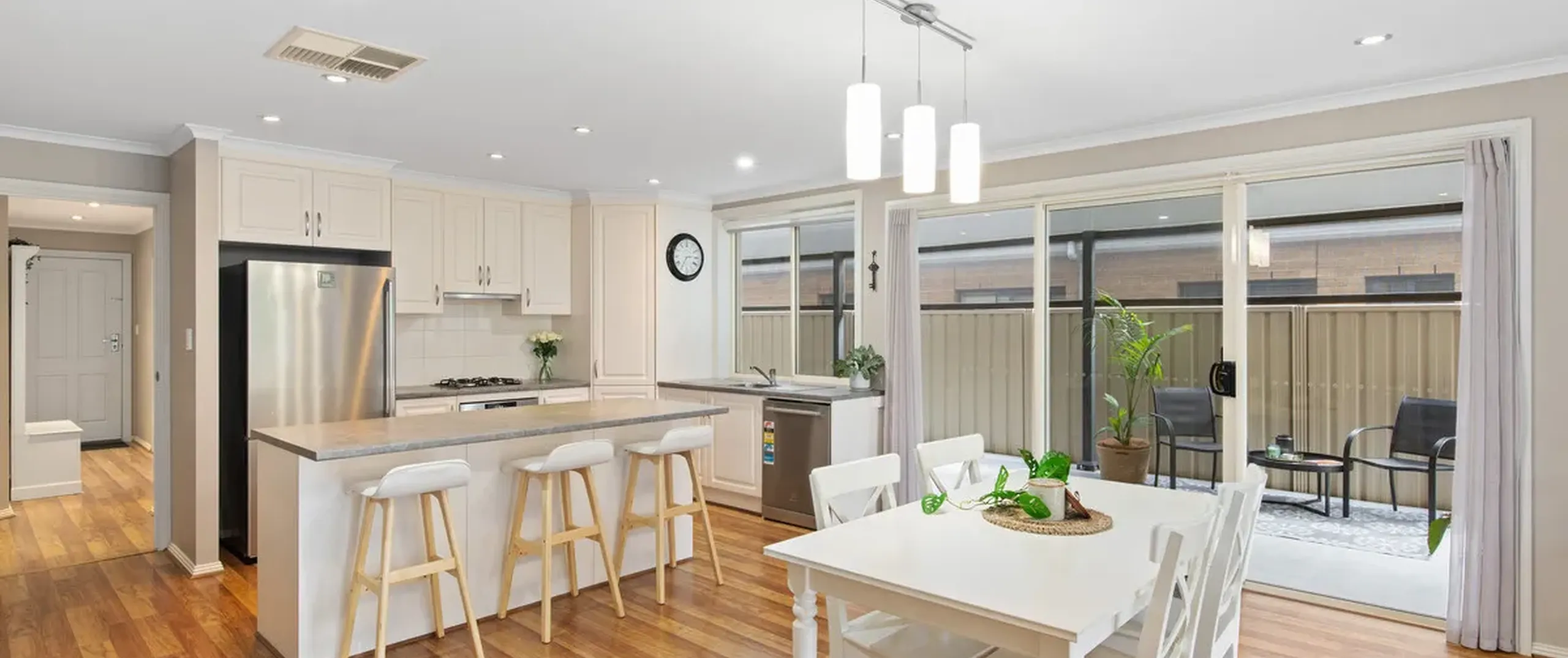 - Light-filled open-plan family, meals and kitchen area with gas heater and sliding doors opening to the outdoor entertaining area