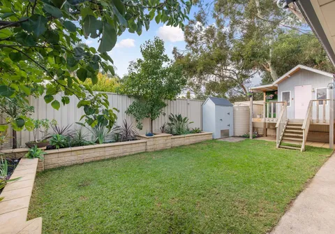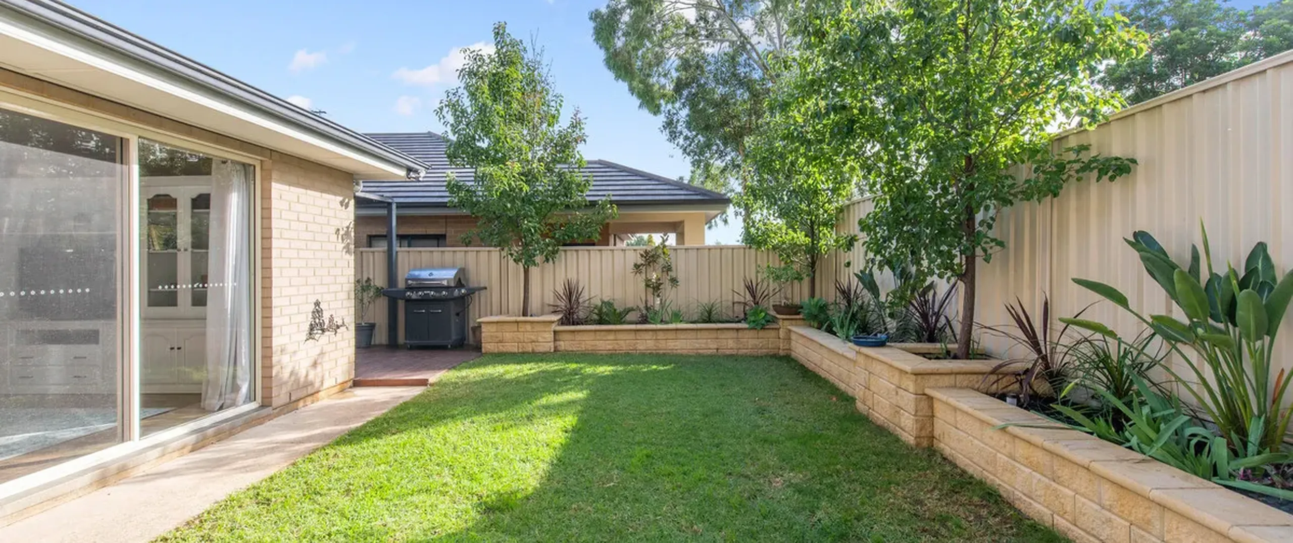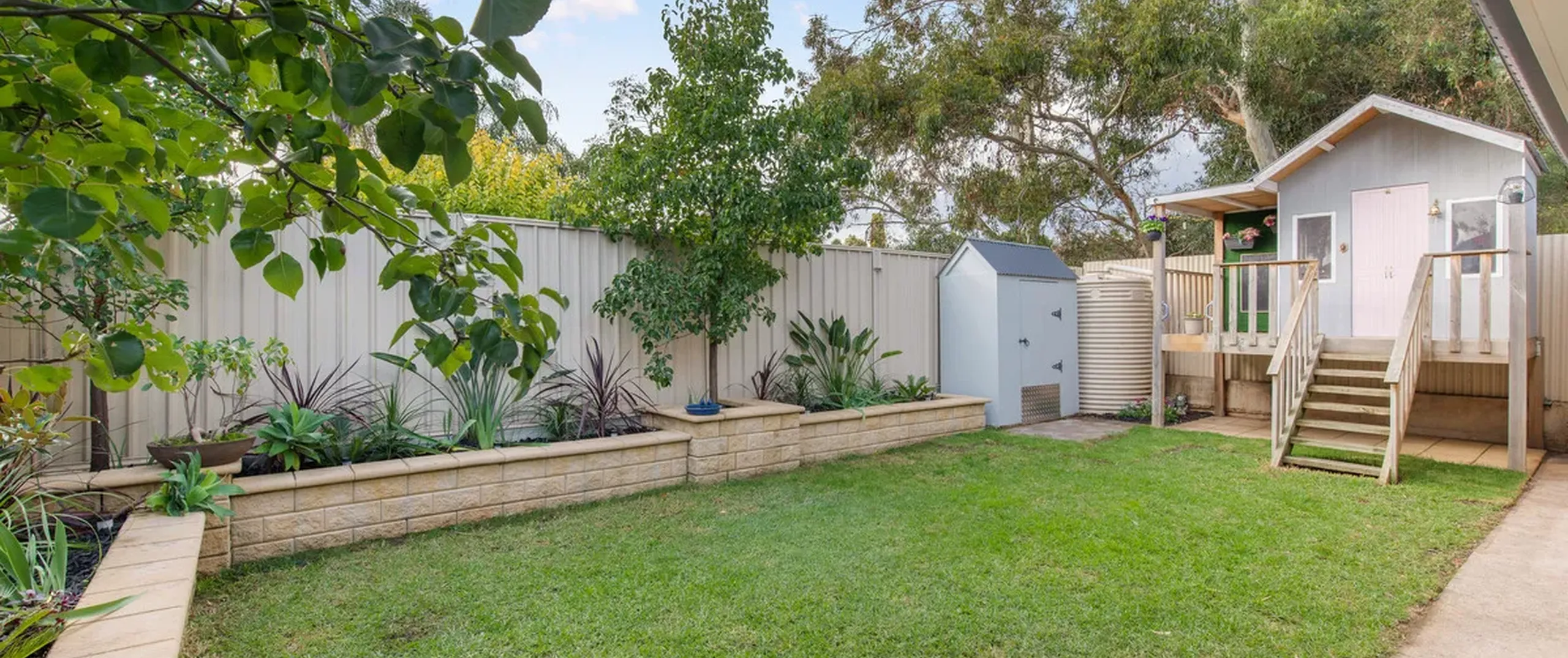 - Low maintenance backyard with well-established gardens and shed with grassed area for pets and kids to enjoy