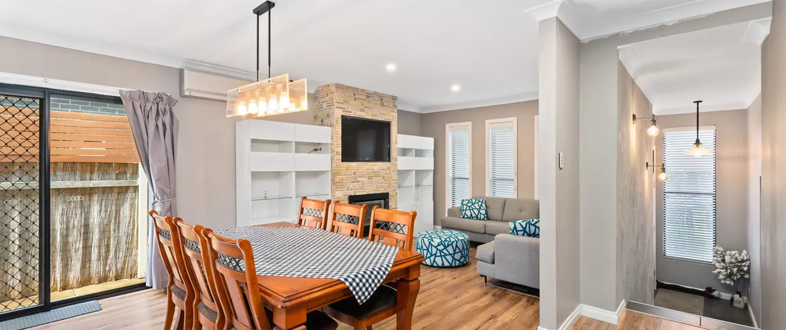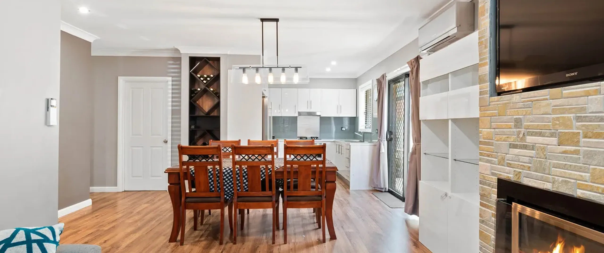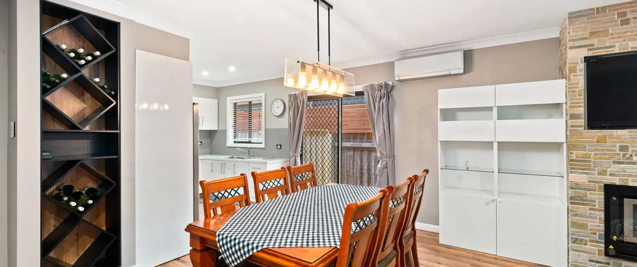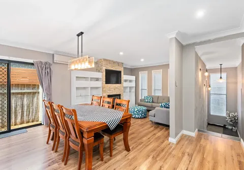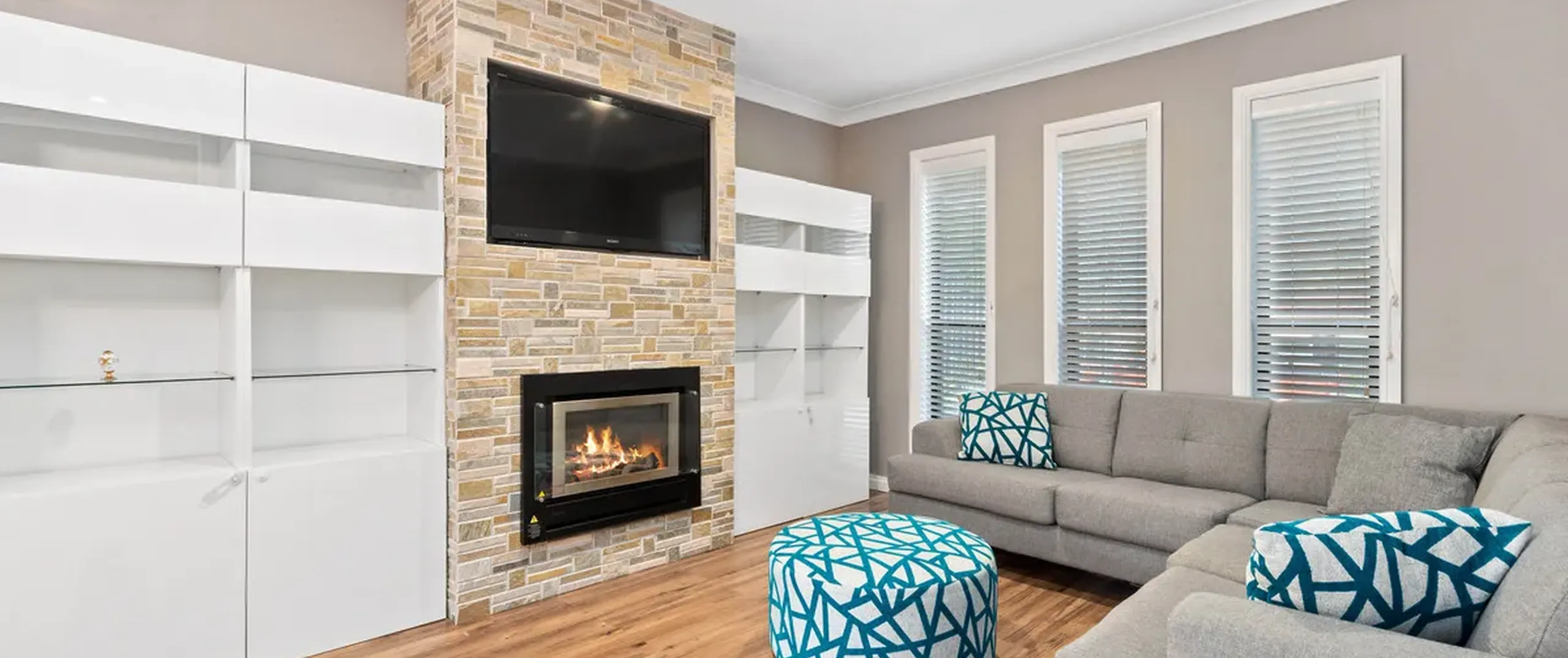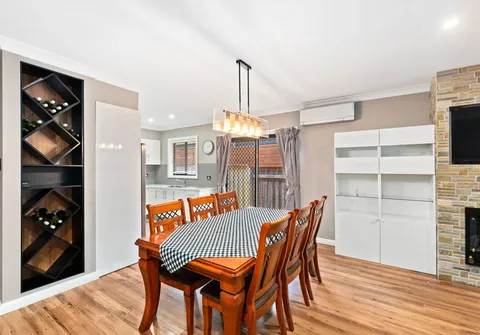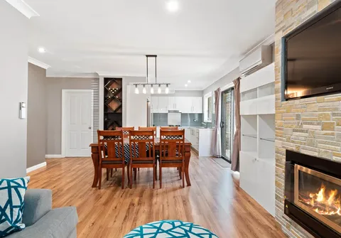 - Light-filled open-plan meals and lounge with a split system air conditioner, built-in cabinets and stone feature mantel with heater and TV niche