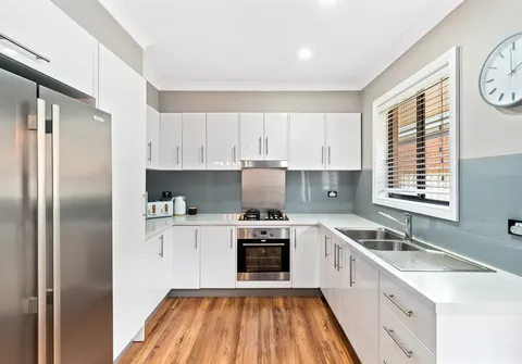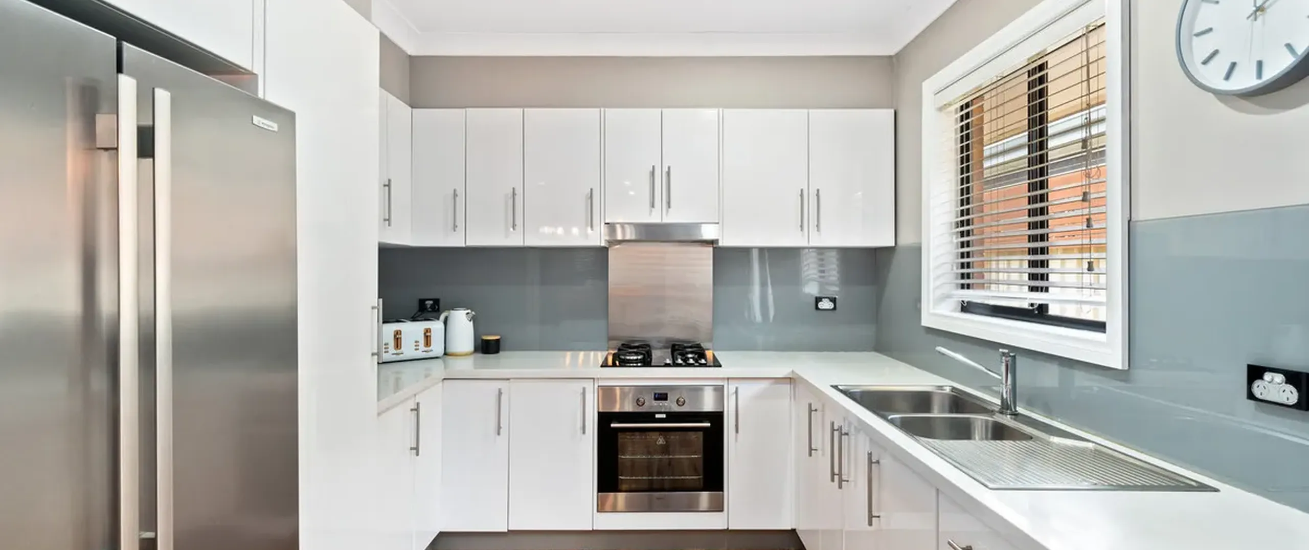 - Modern kitchen with stainless steel oven and gas cooktop, complete with ample cupboard and bench space