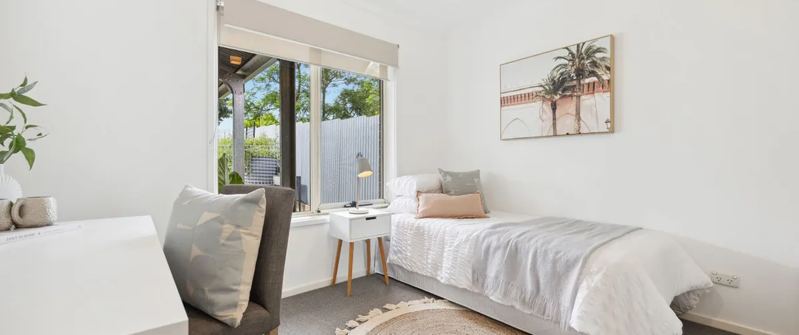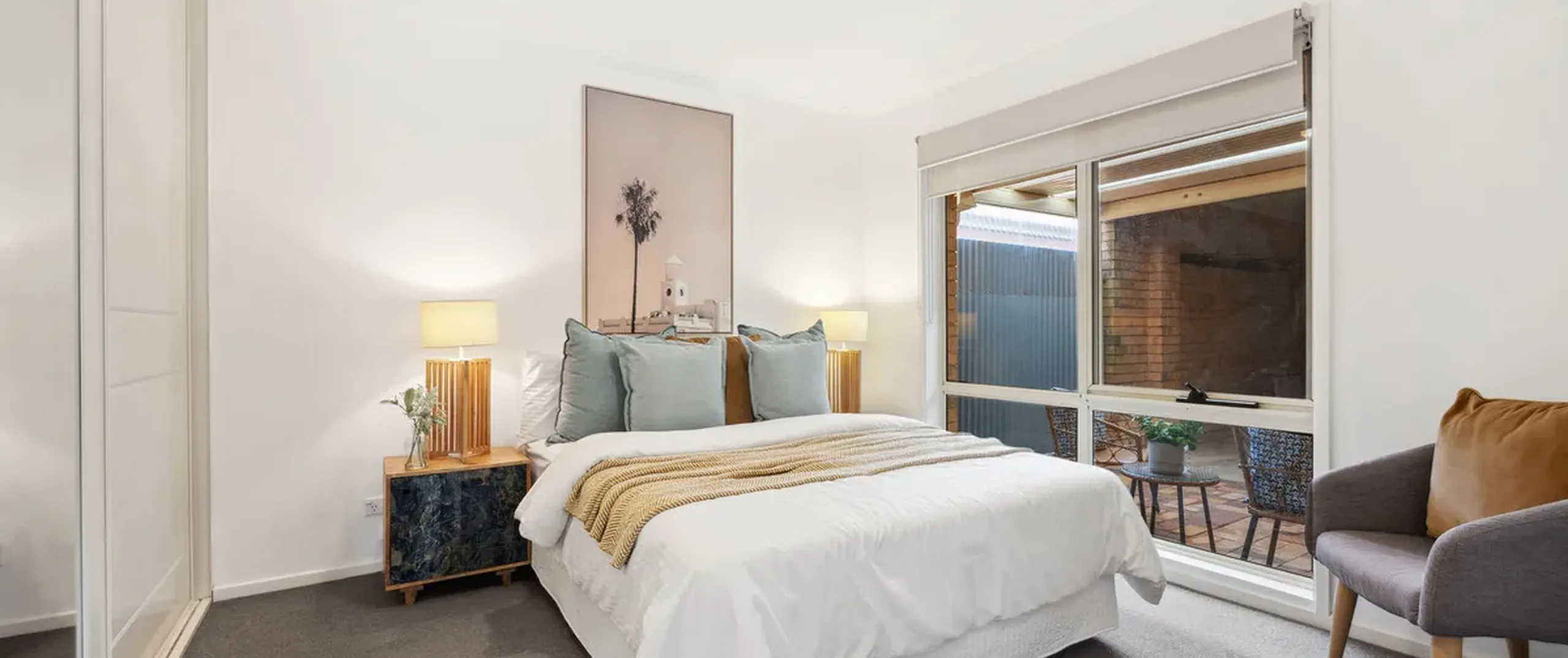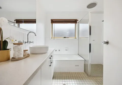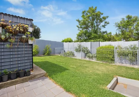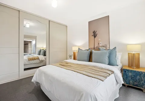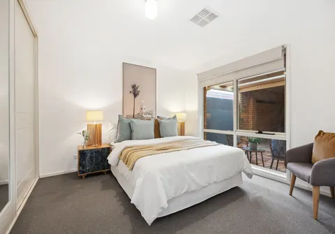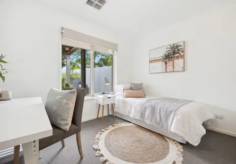 Both bedrooms are well-proportioned and are equipped with built-in robes. The master bedroom features a large window overlooking a central courtyard, while bedroom two offers a view of the rear yard. A spacious bathroom with a separate bath and shower, along with a separate toilet and walk-through laundry, completes the interior layout.