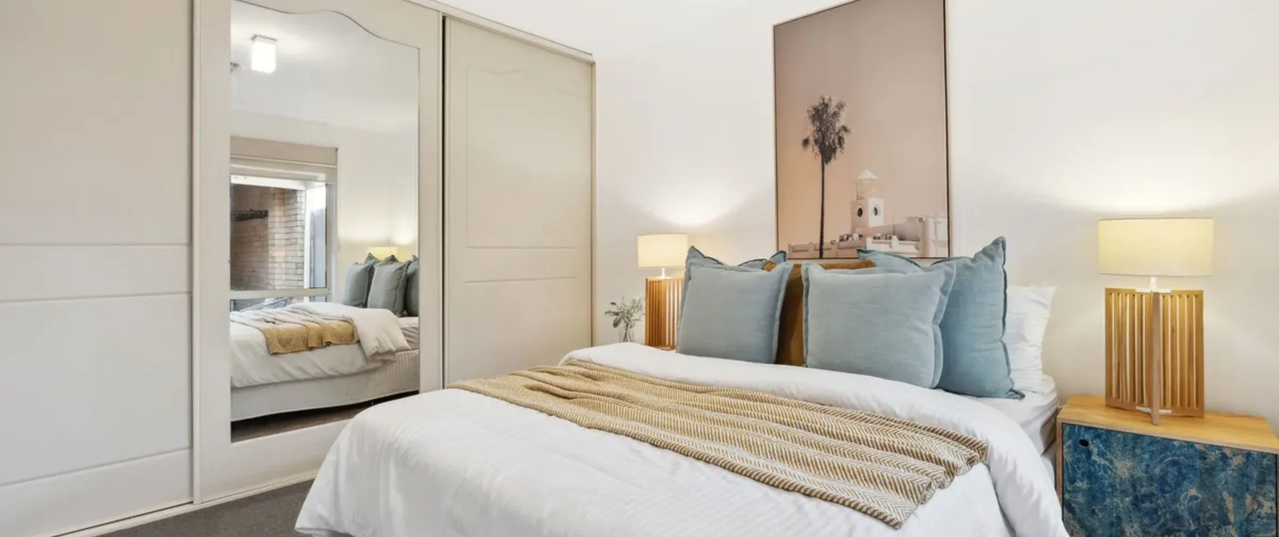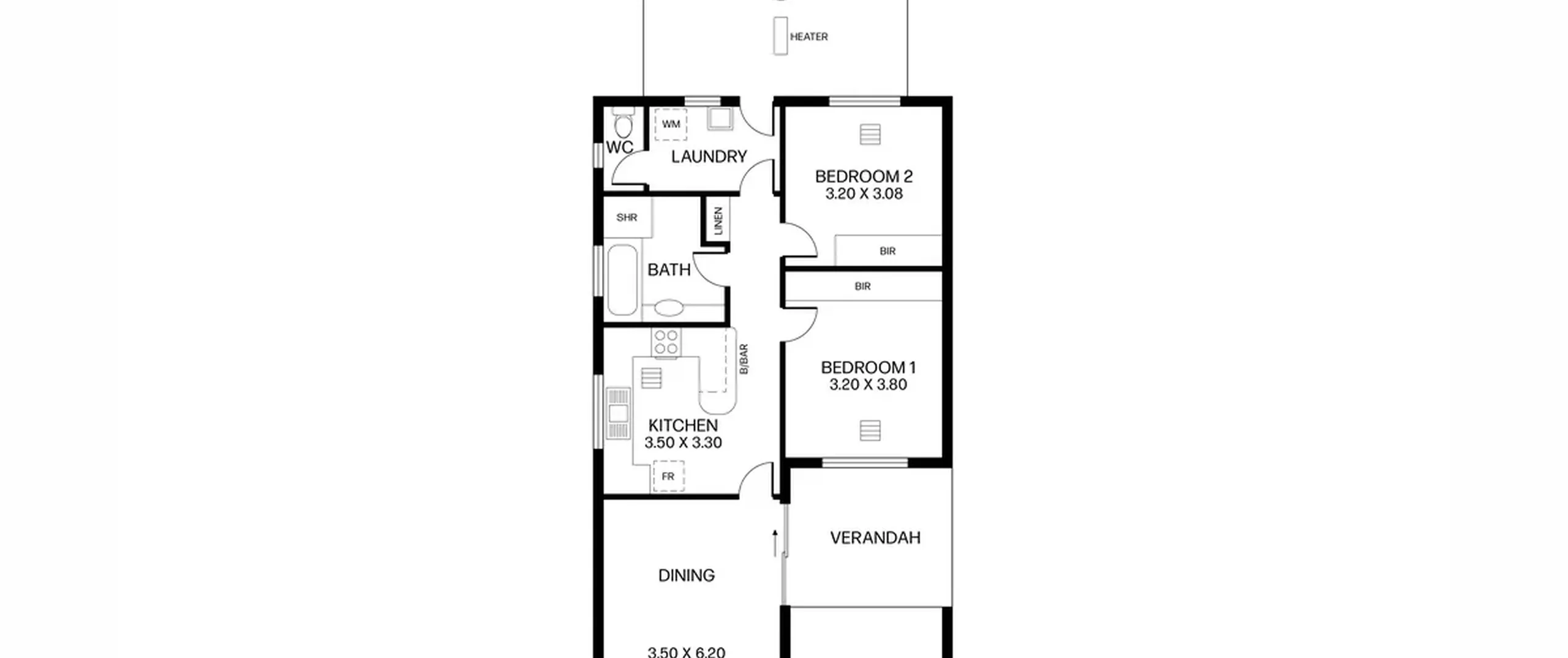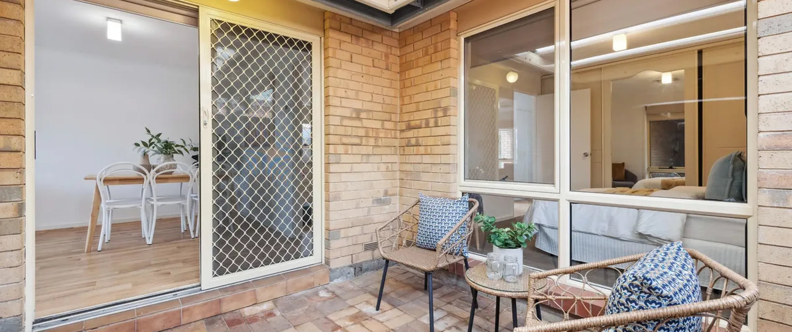 Both bedrooms are well-proportioned and are equipped with built-in robes. The master bedroom features a large window overlooking a central courtyard, while bedroom two offers a view of the rear yard. A spacious bathroom with a separate bath and shower, along with a separate toilet and walk-through laundry, completes the interior layout.