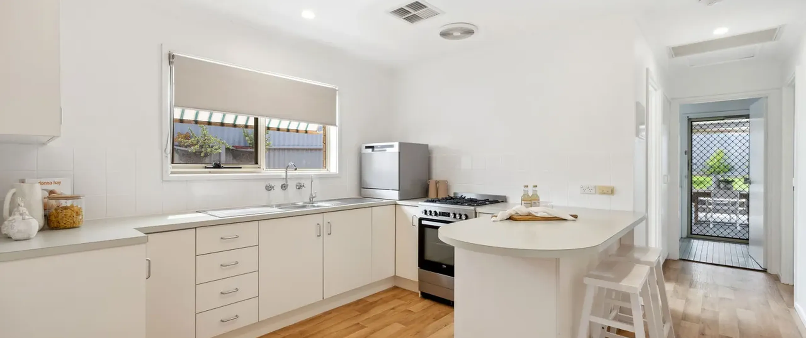 - Timeless kitchen with gas cooktop, tiled splash back, breakfast bar and ample storage