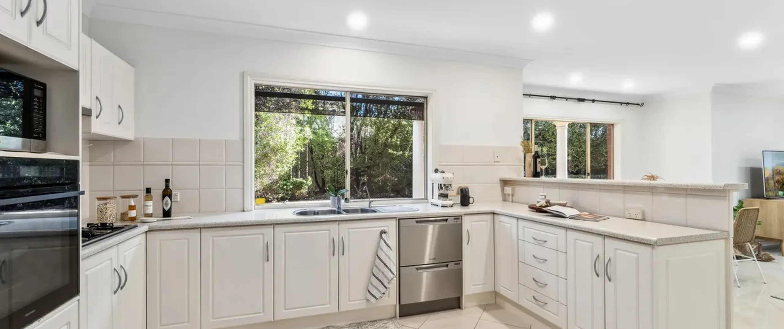 - Large kitchen with gas cooktop, oven, dual drawer dishwasher, breakfast bar and ample bench and cupboard space