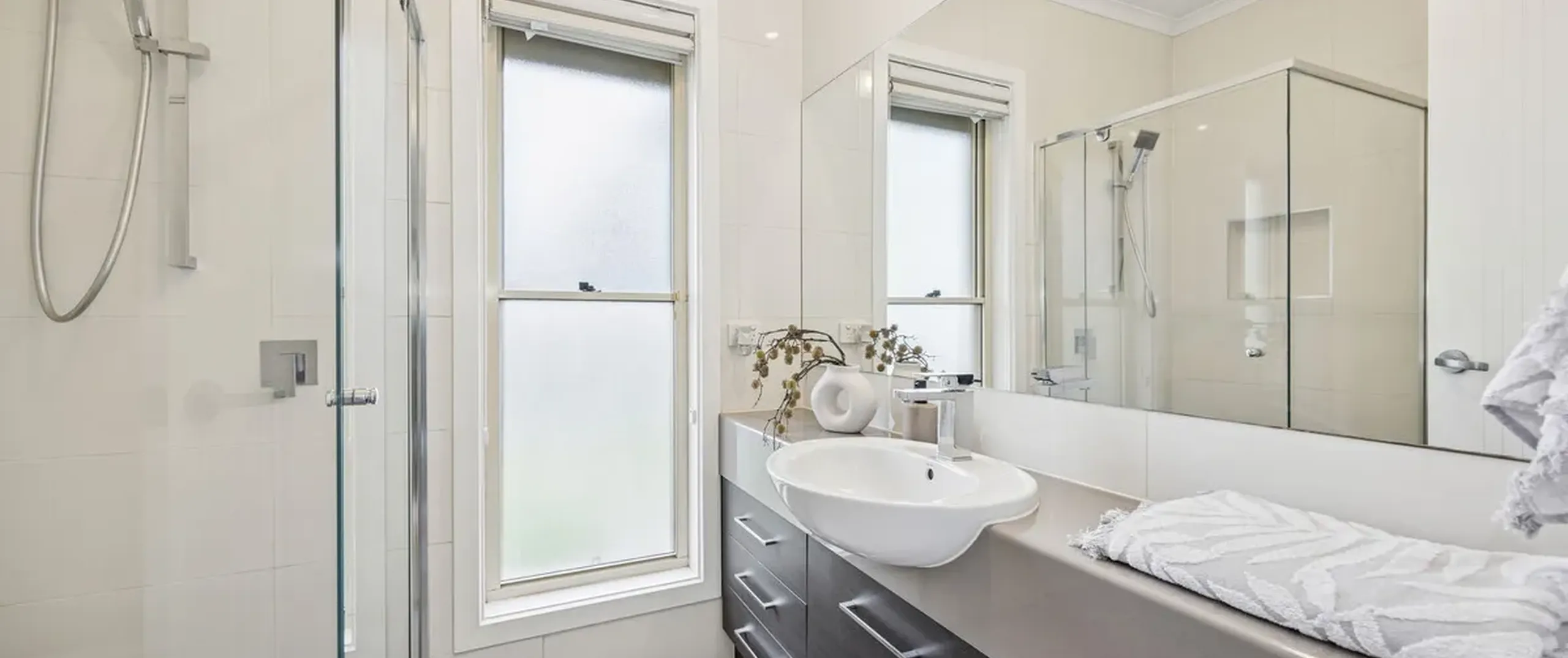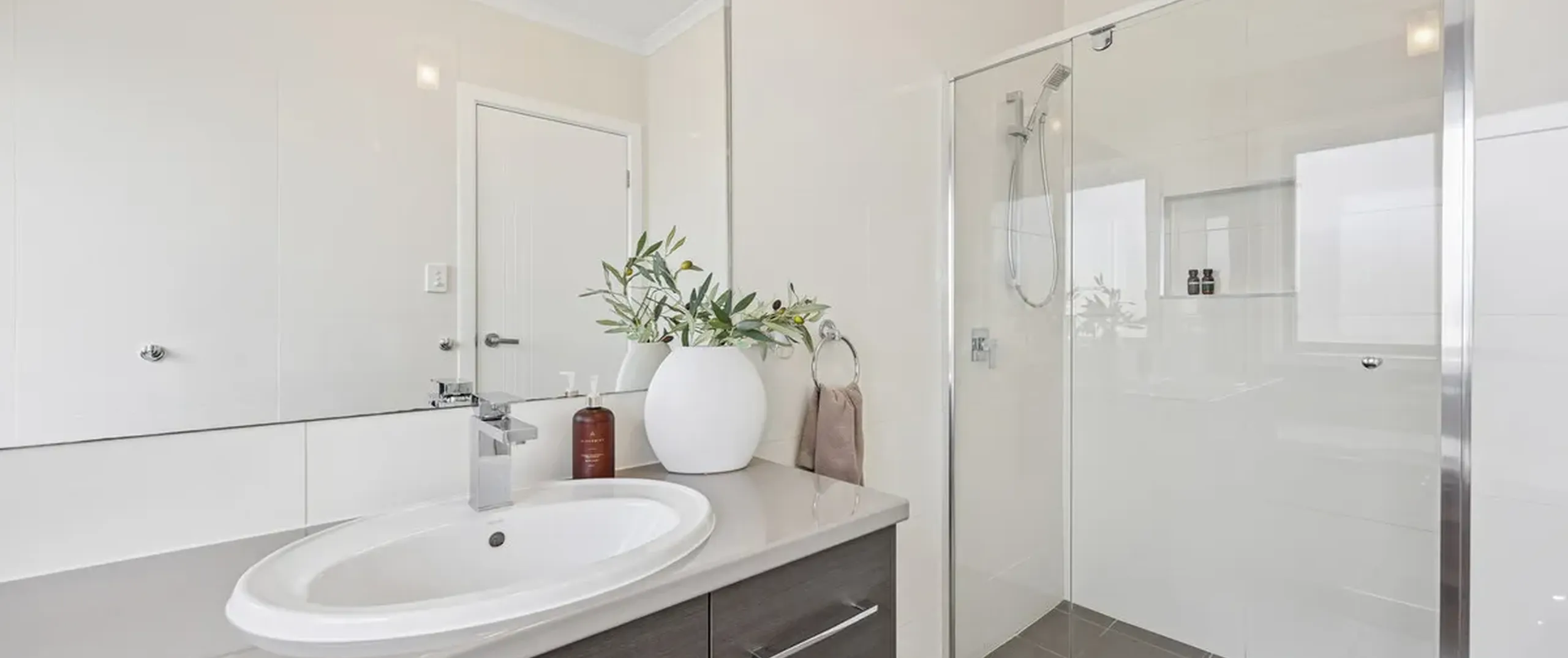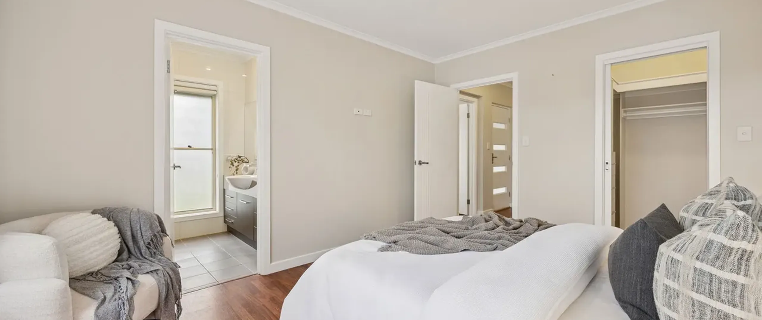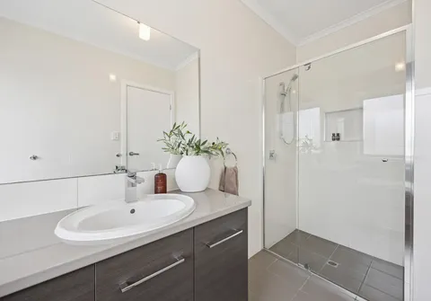 A luxurious master suite awaits, featuring a neutral palette, floor to ceiling tiled ensuite and a frameless shower with niche. Additional bedrooms include electric roller shutters, ensuring comfort and privacy for all members of the household.