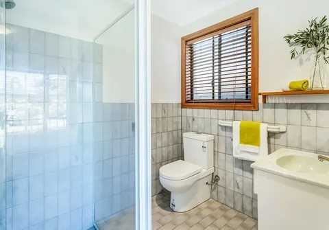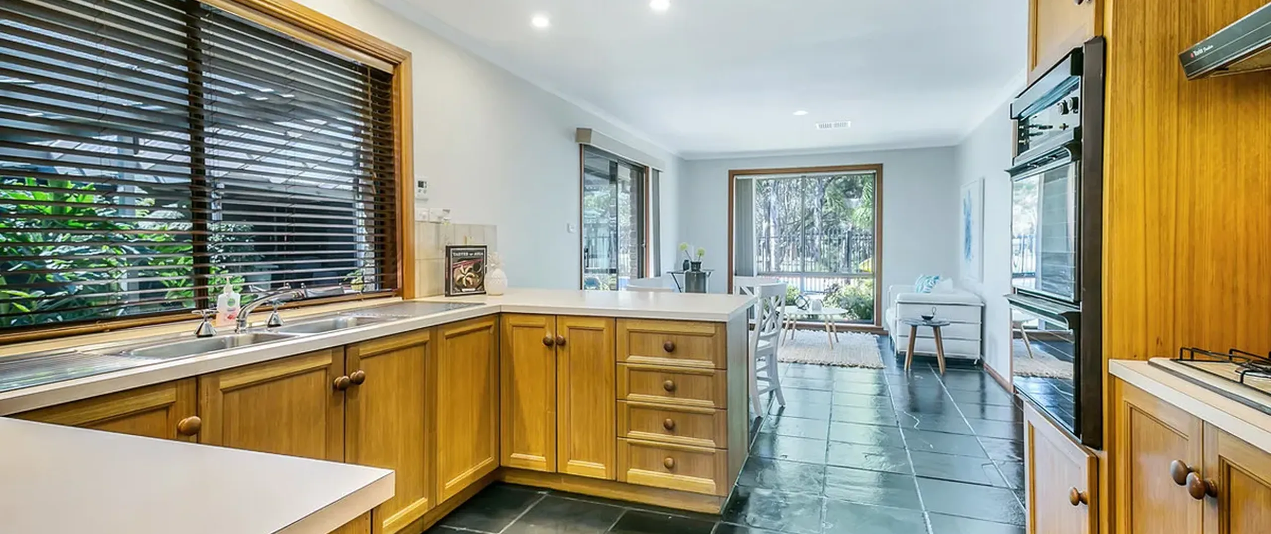 - Timber kitchen with gas cooktop and ample bench and cupboard space