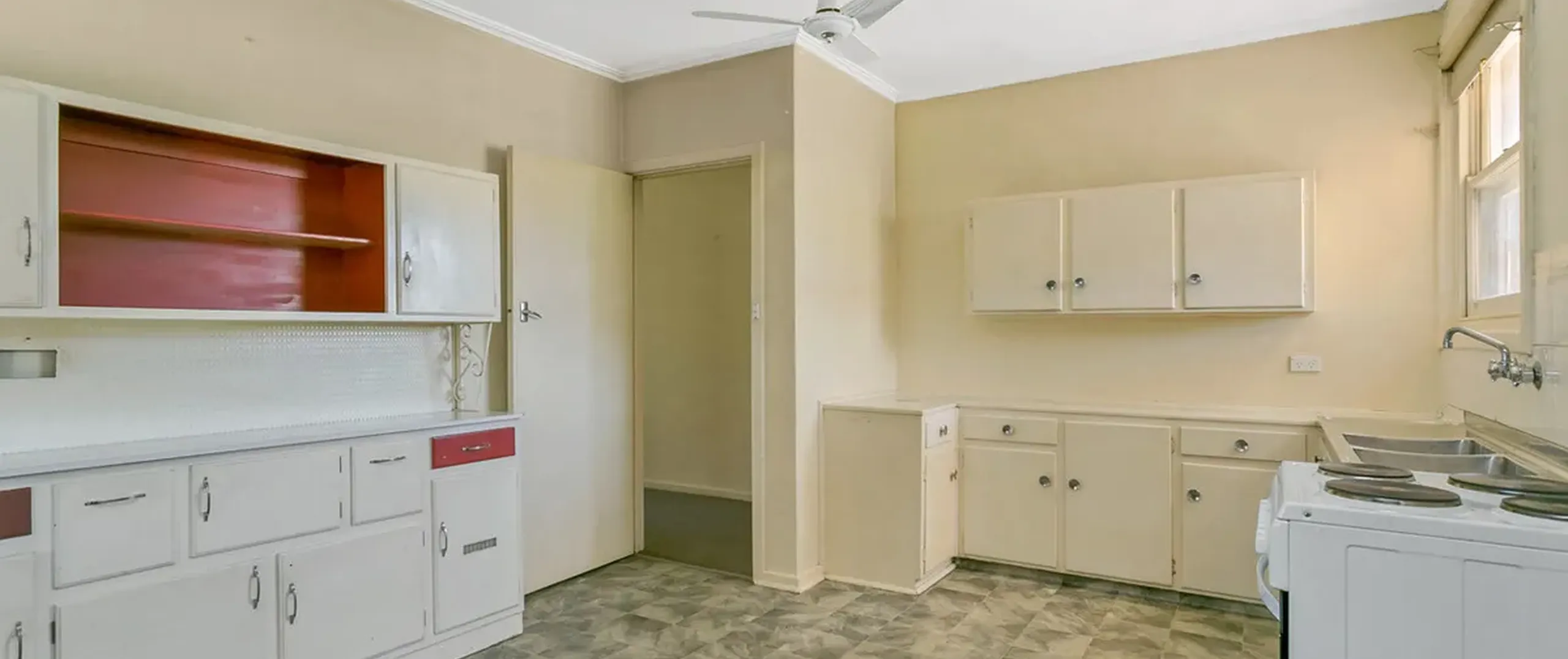 - Combined kitchen and meals area with ceiling fan
