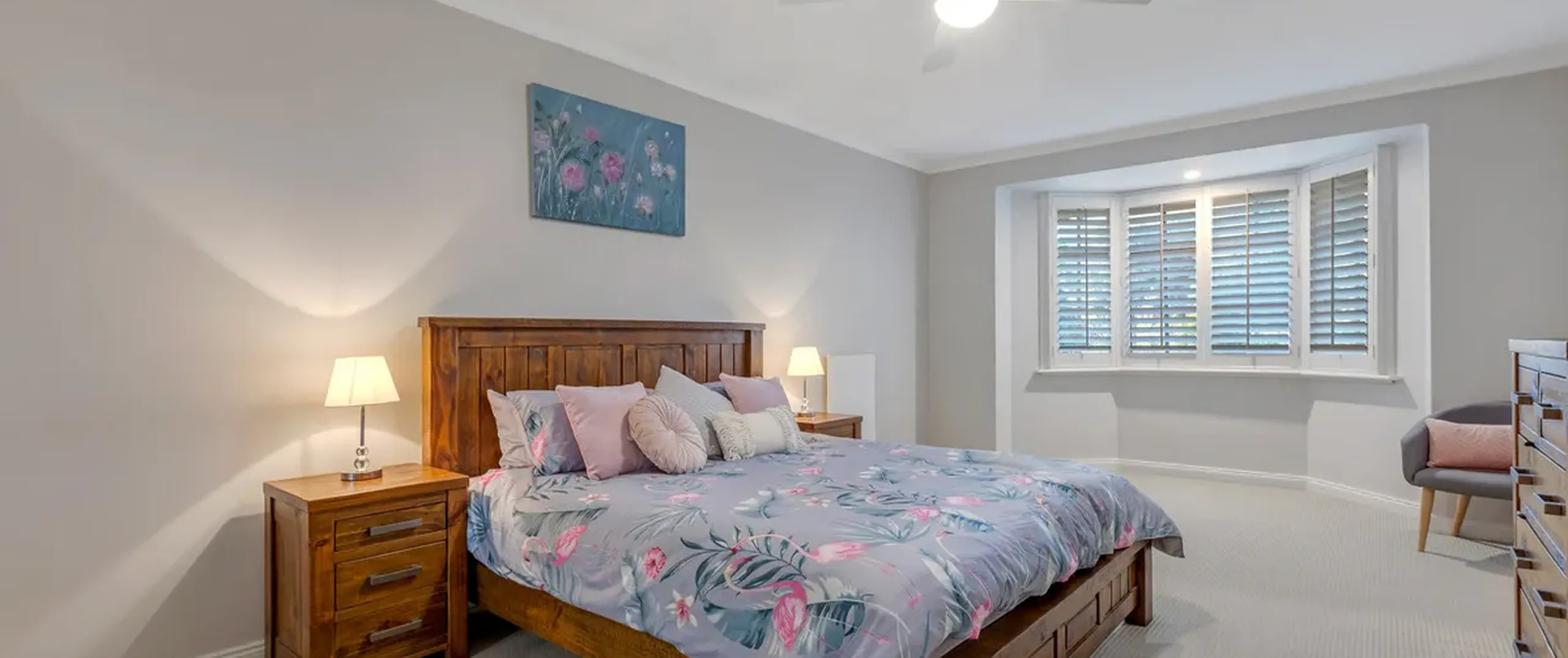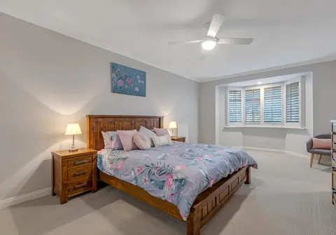 - Luxurious master retreat with built-in robe, ceiling fan, wall heater, plantation shutters and ensuite offering a spa bath