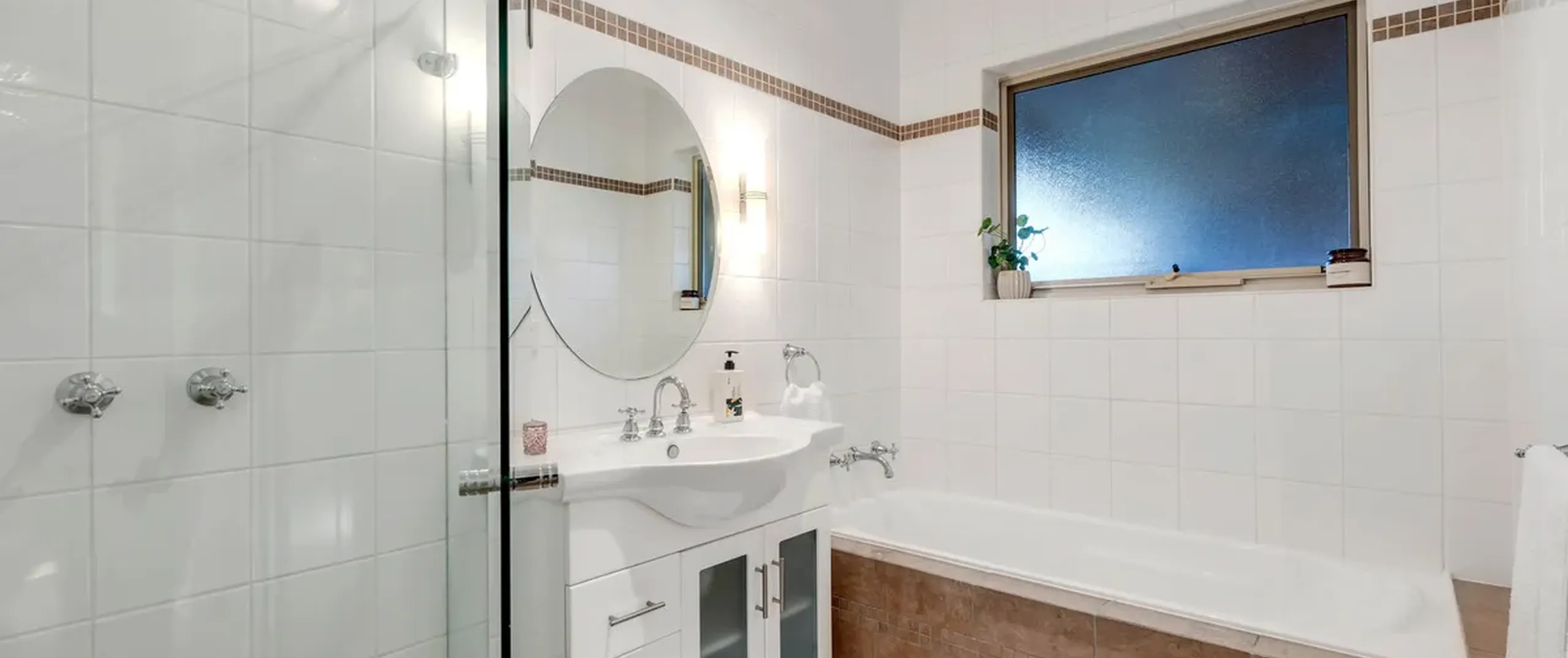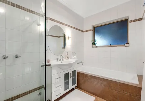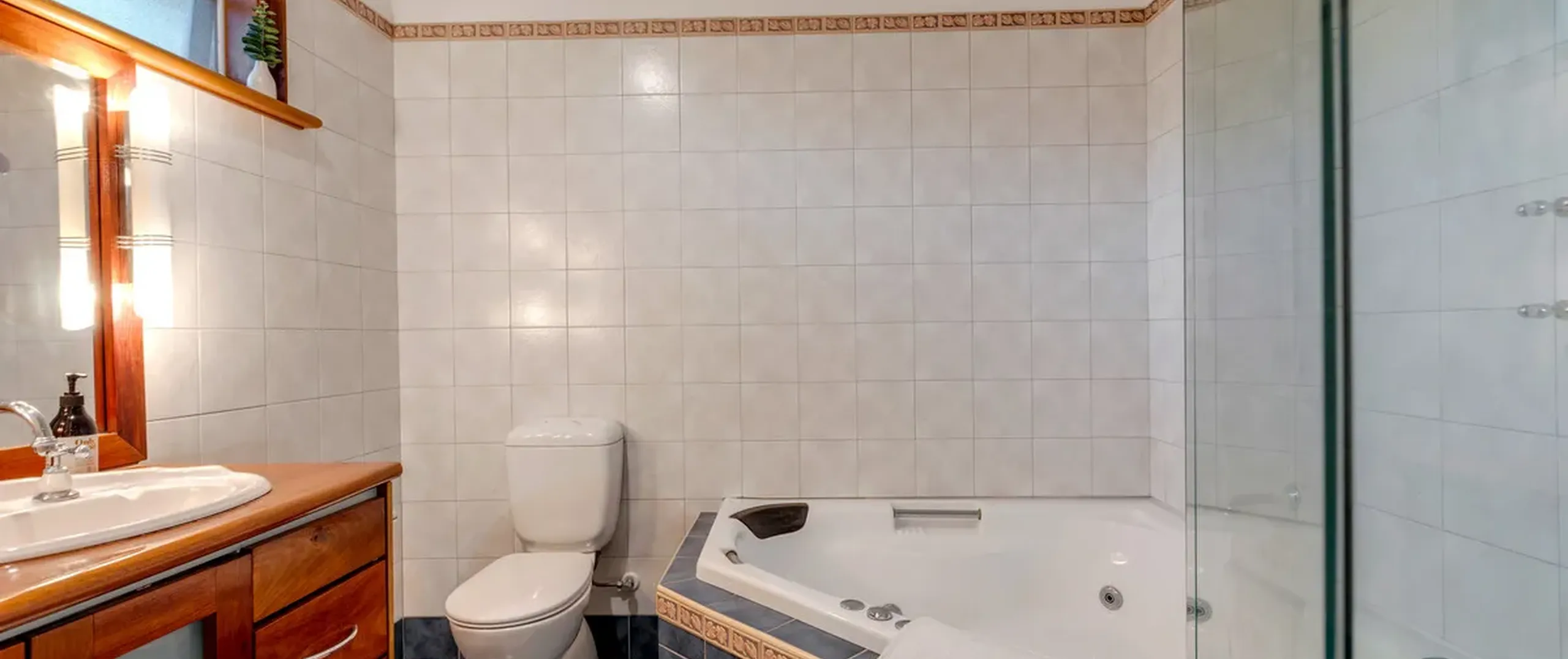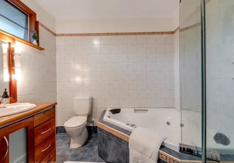 - Main bathroom with separate bath and shower + separate toilet, featuring floor to ceiling tiles