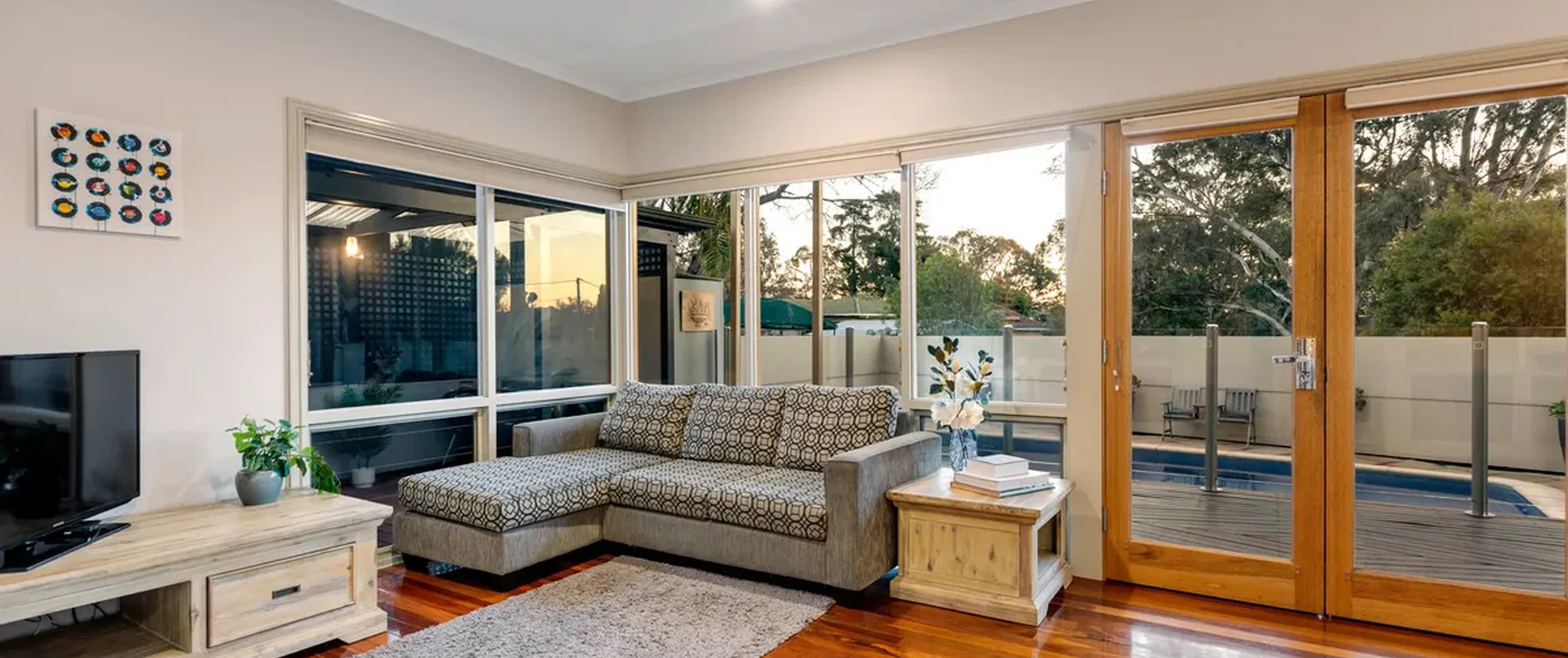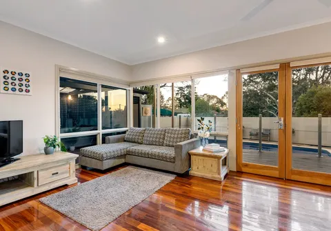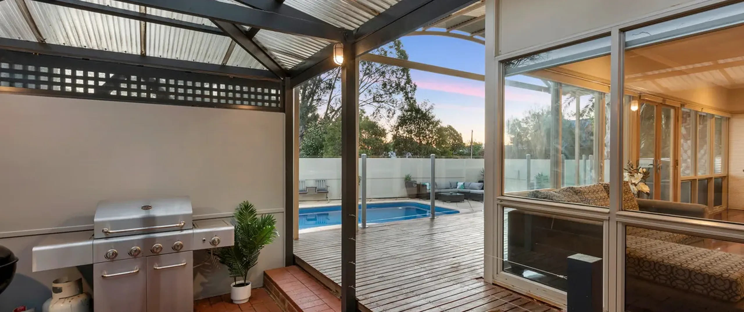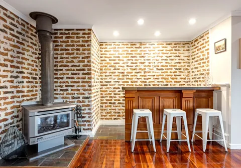 - Beautiful light filled open plan living area with bar, wood fire, split system air conditioner, ceiling fan and glass windows overlooking the entertaining area and pool