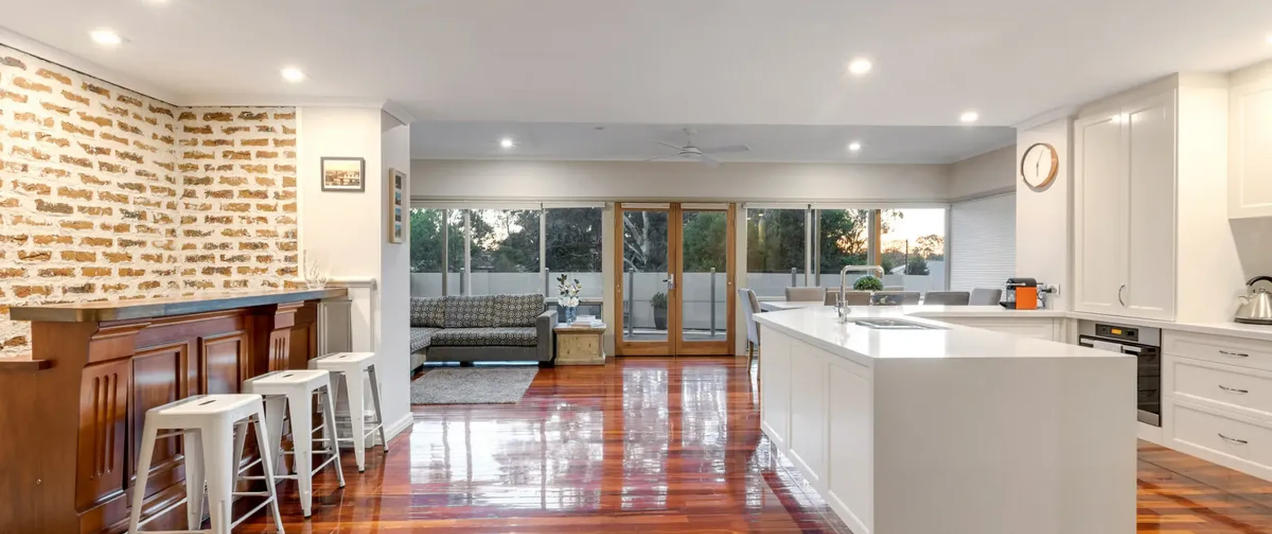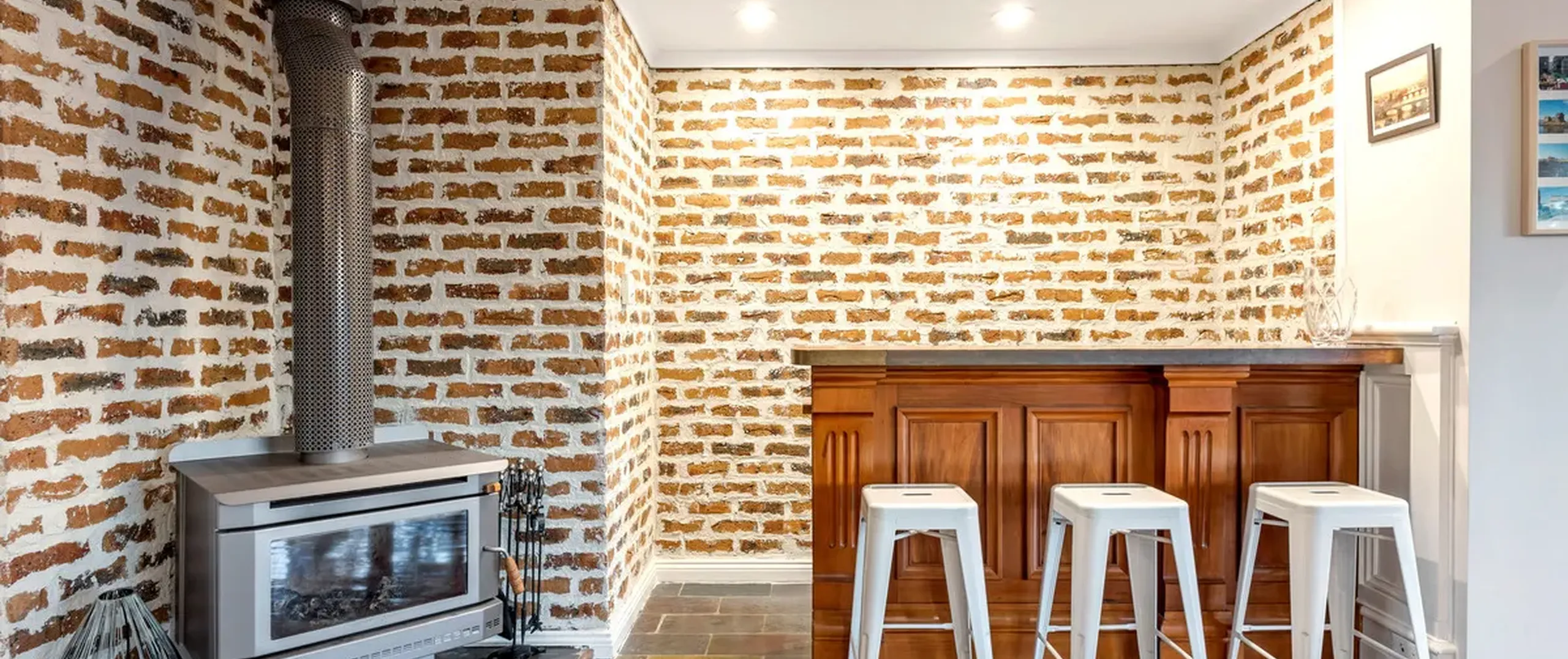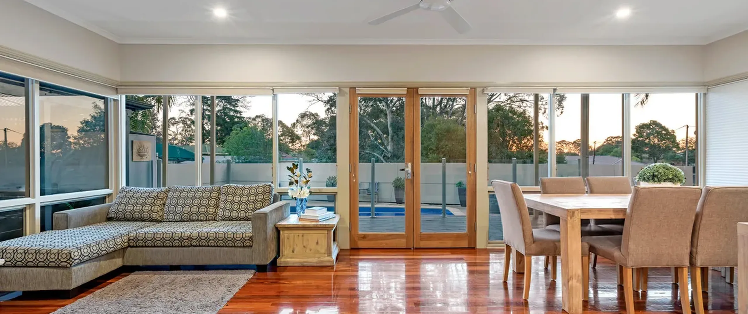 - Beautiful light filled open plan living area with bar, wood fire, split system air conditioner, ceiling fan and glass windows overlooking the entertaining area and pool