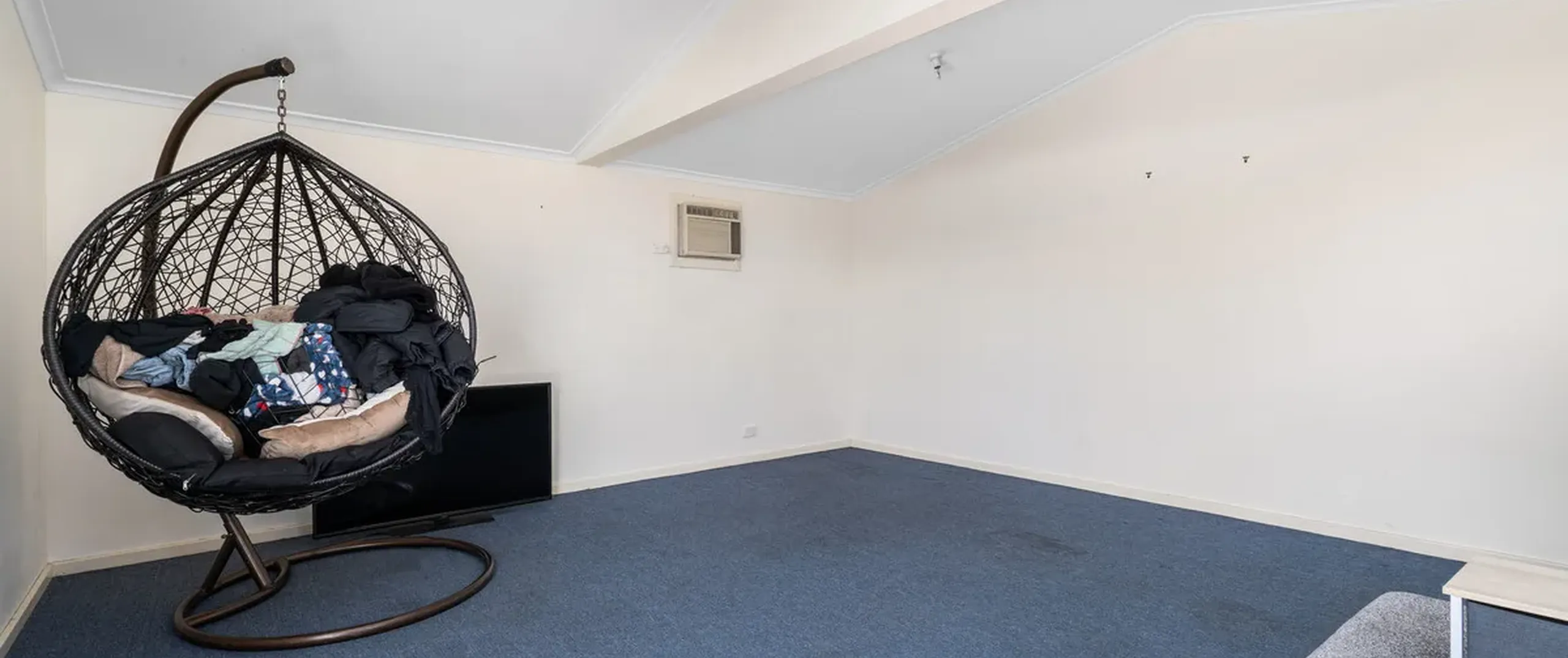 - Lined shed disposed as studio with split system air conditioner