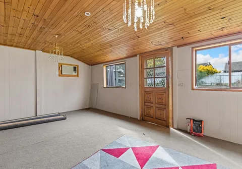 - Detached rumpus room with air conditioner and striking timber ceiling