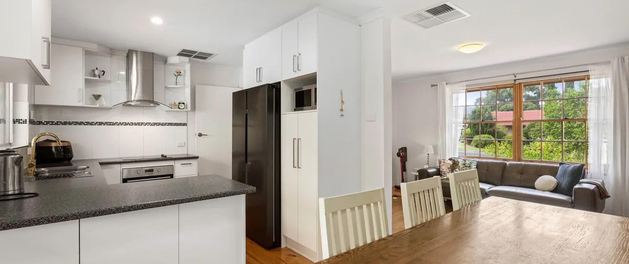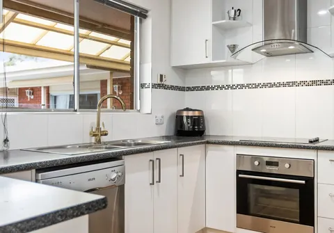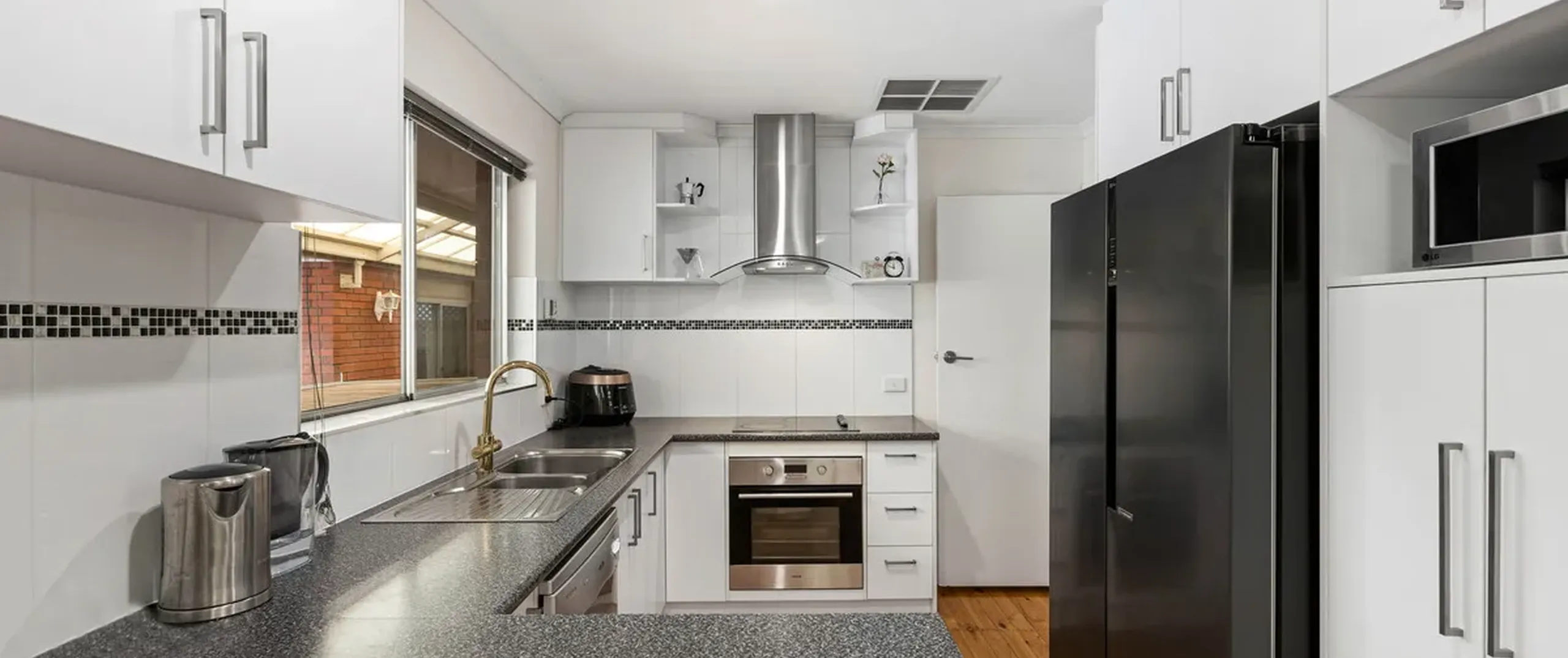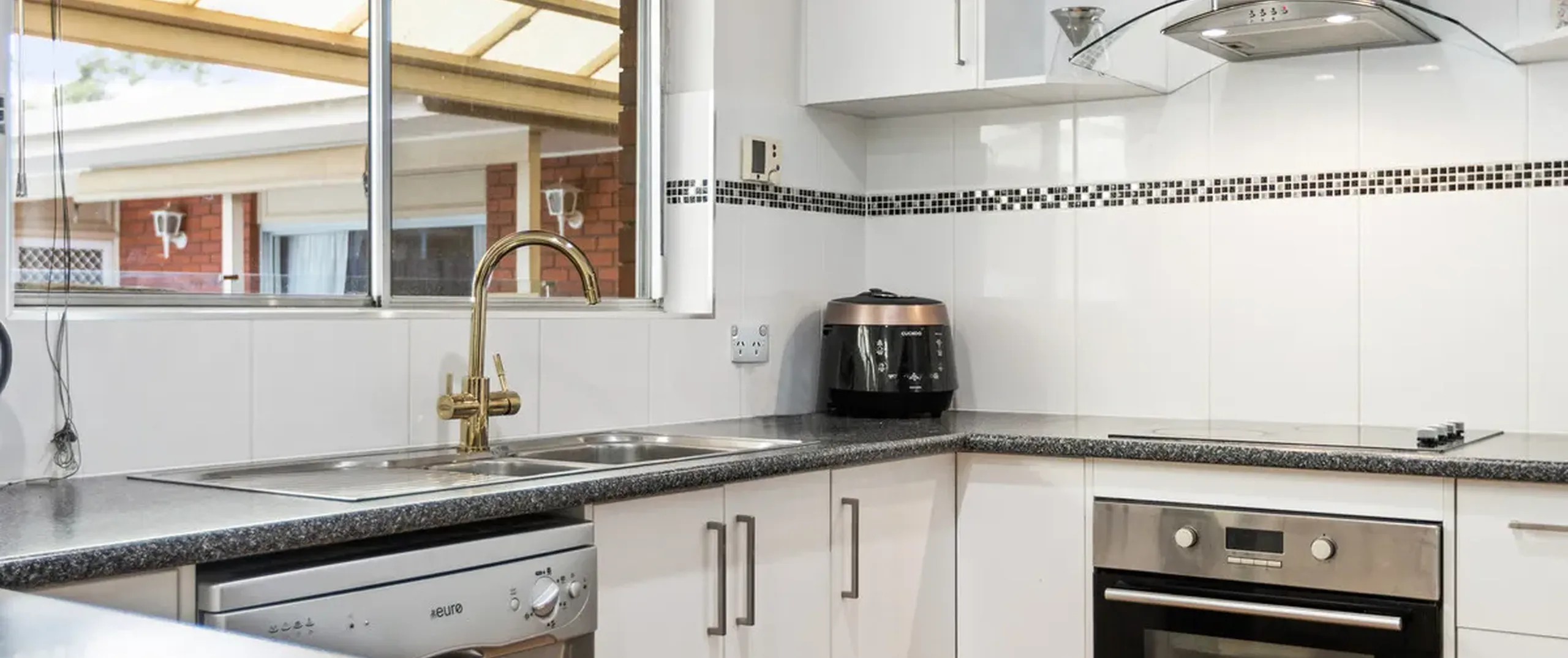 Offering a simple and stylish kitchen with views of the decking and shiny in-ground pool complete with stainless steel appliances and plenty of cupboard and bench space.