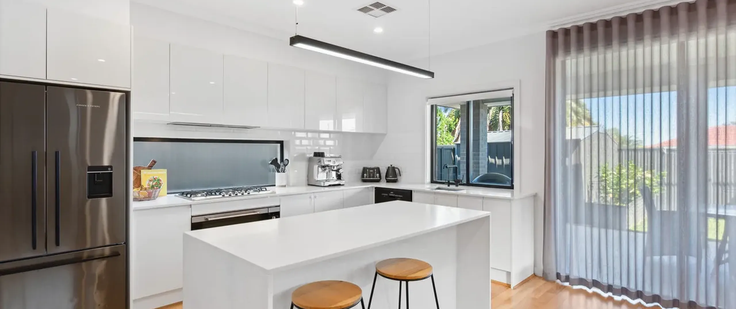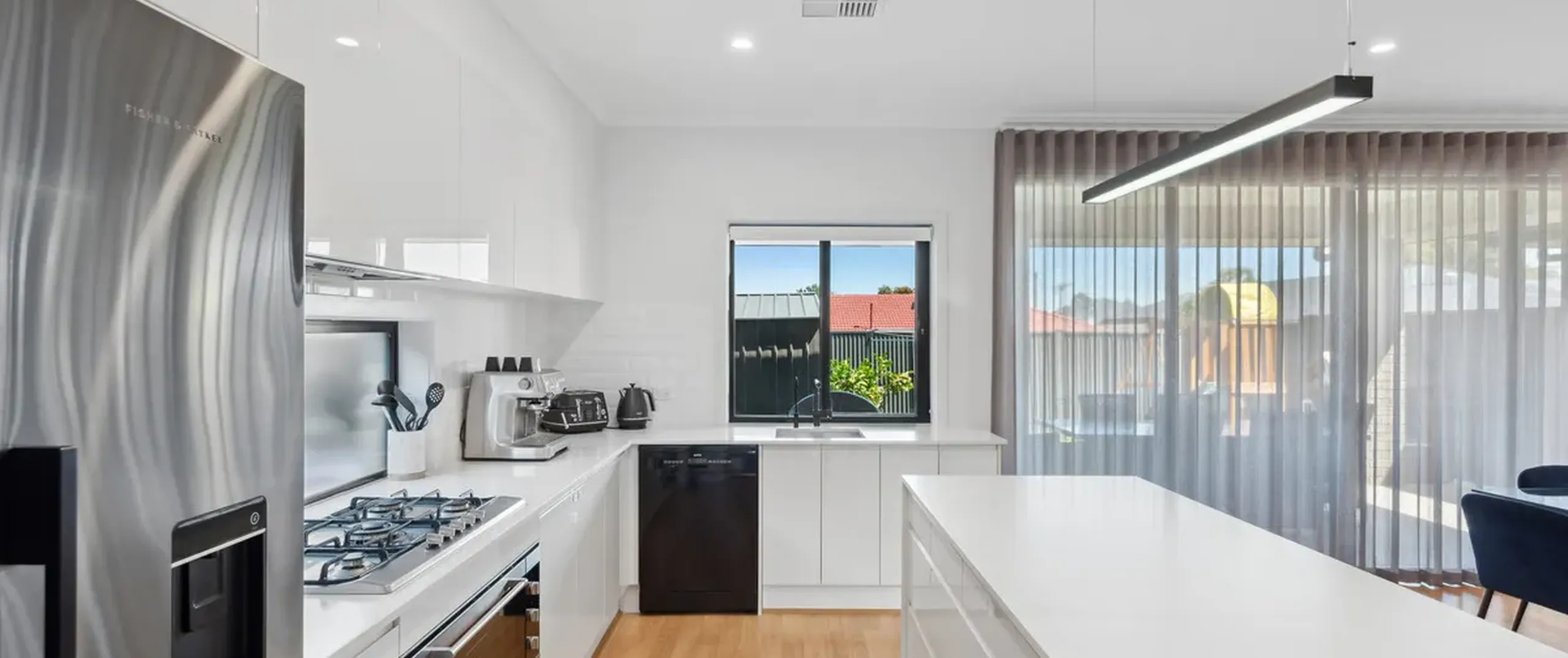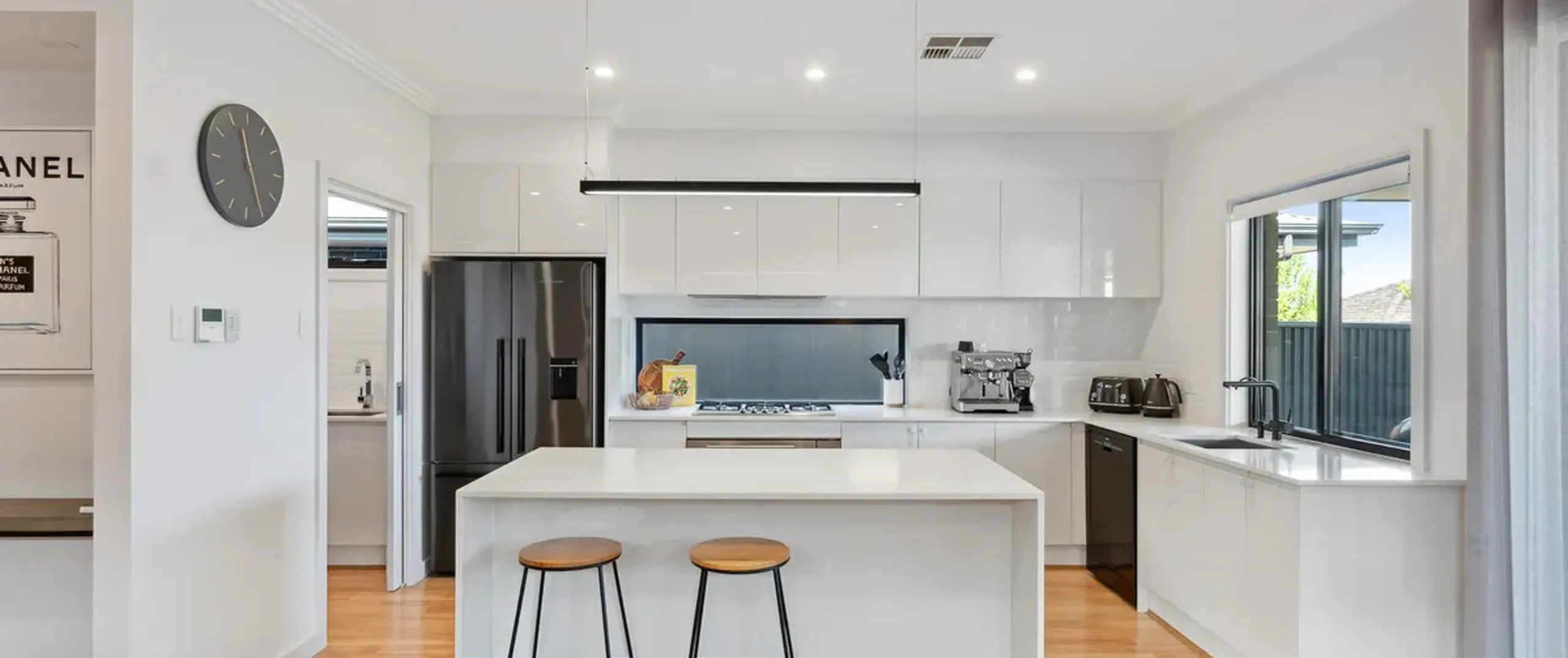 - Spotless, modern white kitchen fully equipped with dishwasher, gas cooktop, butler’s pantry, large island bench with breakfast bar and feature lighting