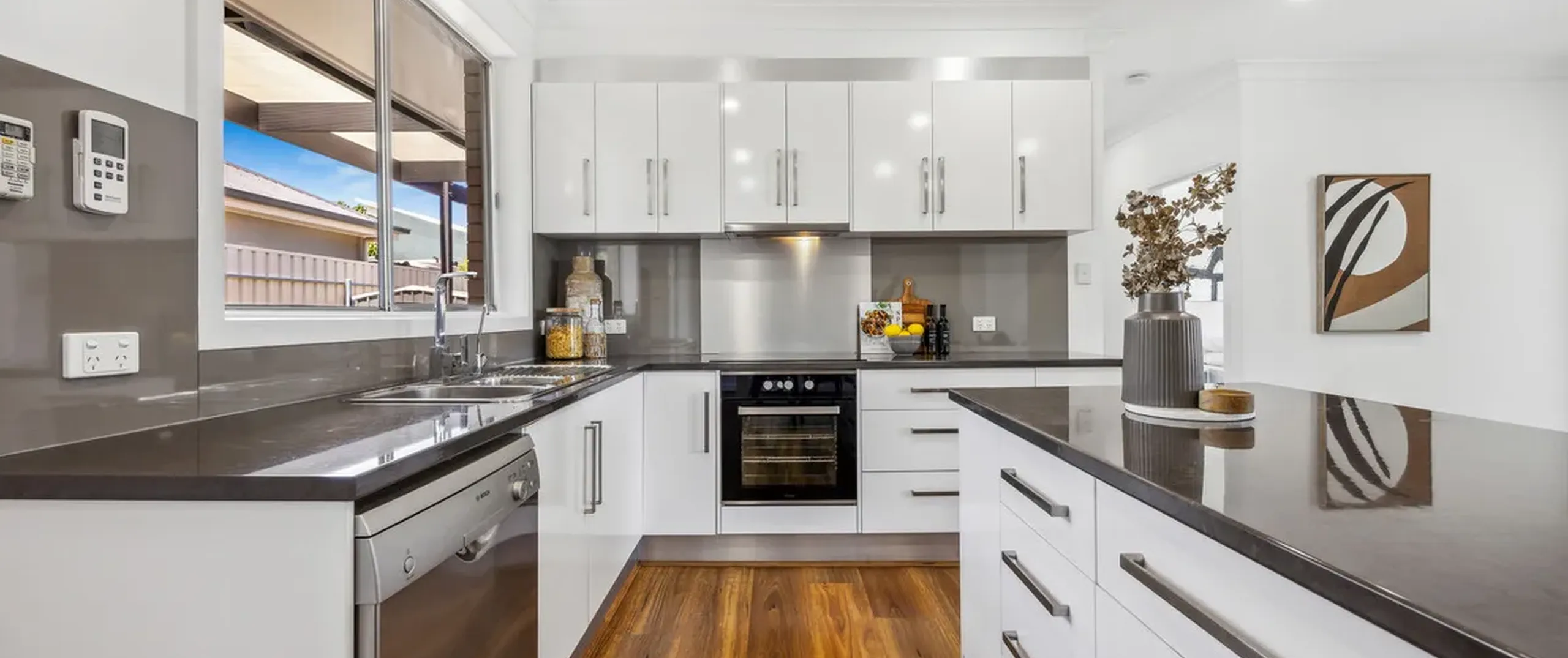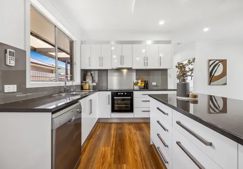 - Classic white kitchen with stainless steel appliances including dishwasher, island breakfast bar and ample cupboard and bench space