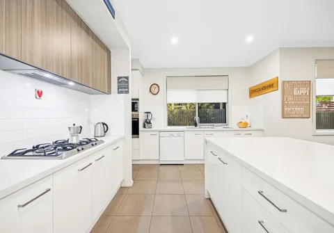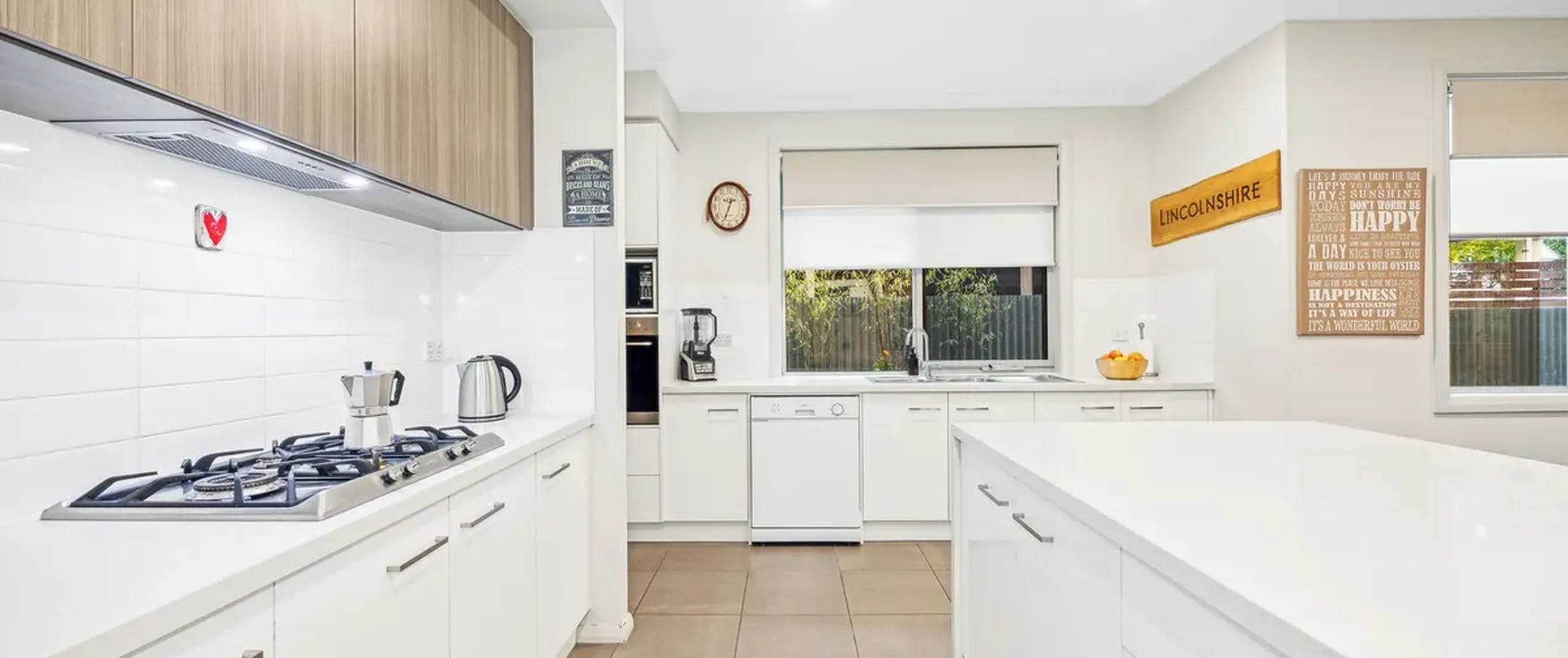 - Classic white kitchen with gas cooktop, Bellini dishwasher, walk-in pantry and island bench breakfast bar being the centre piece, with all benchtops finished with a 40mm stone