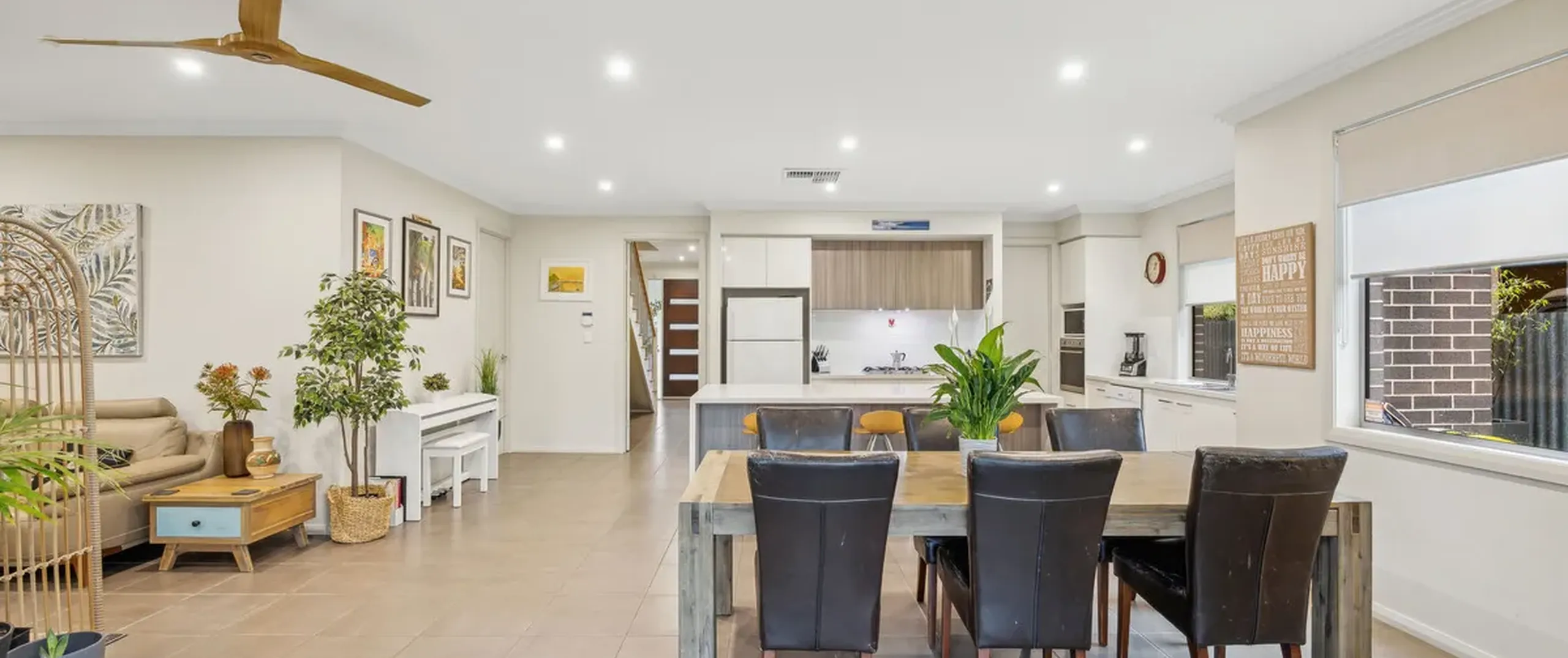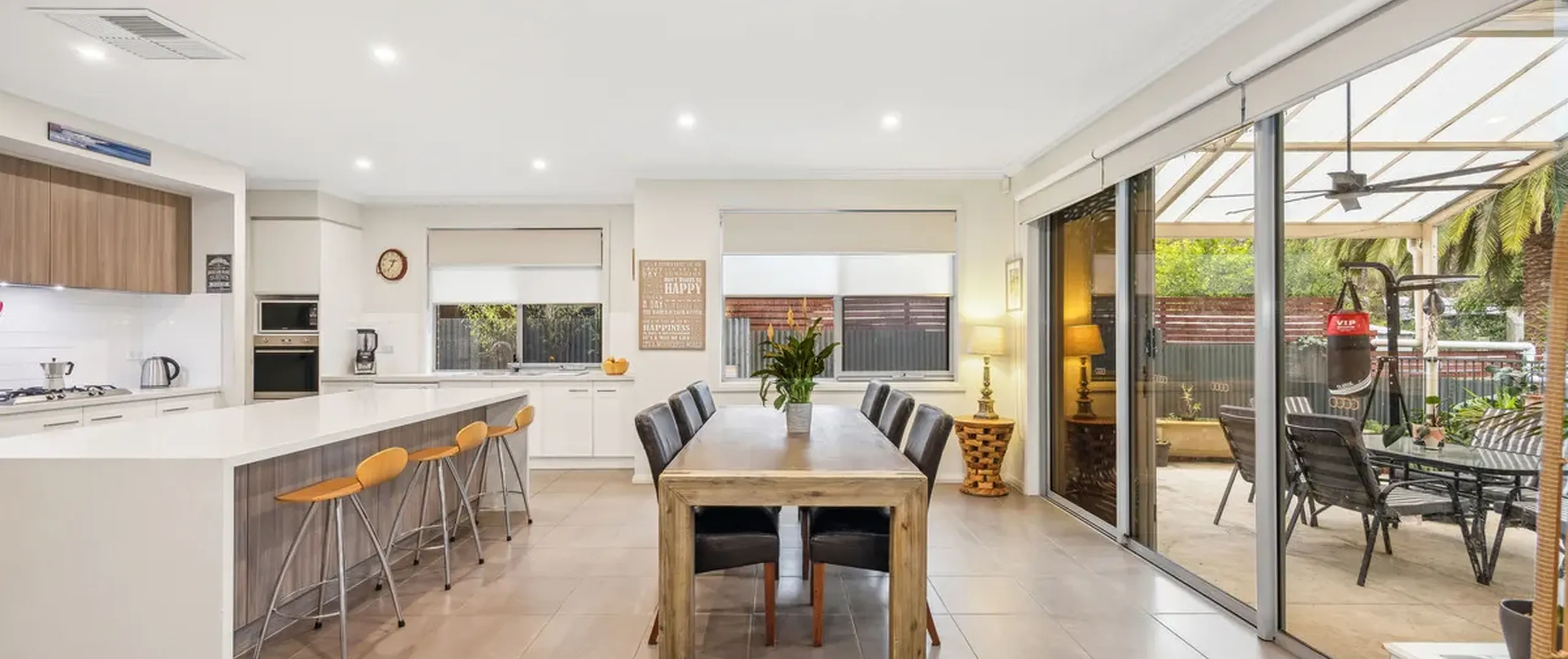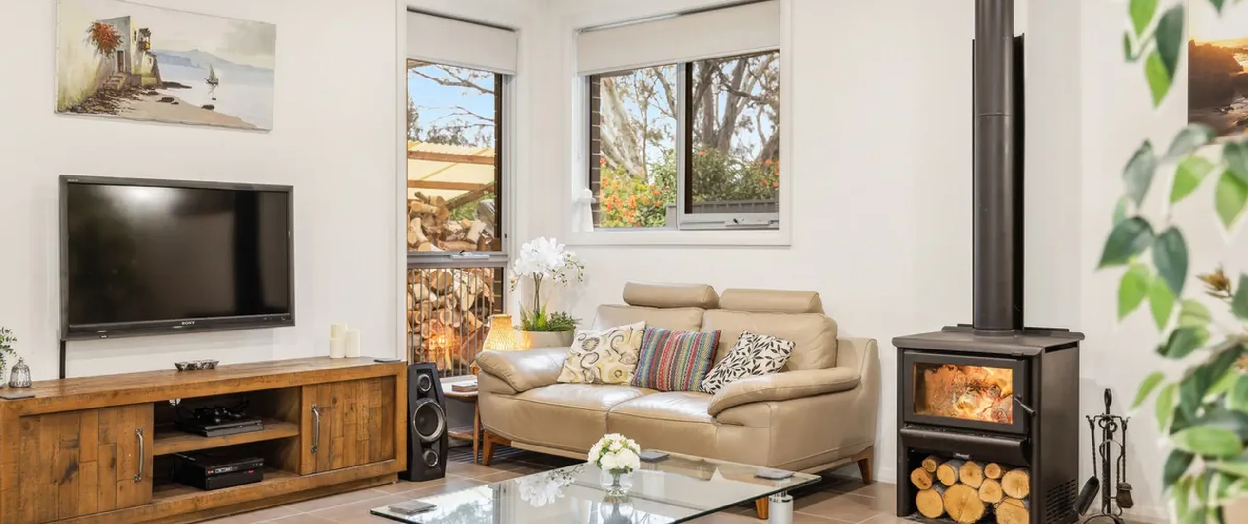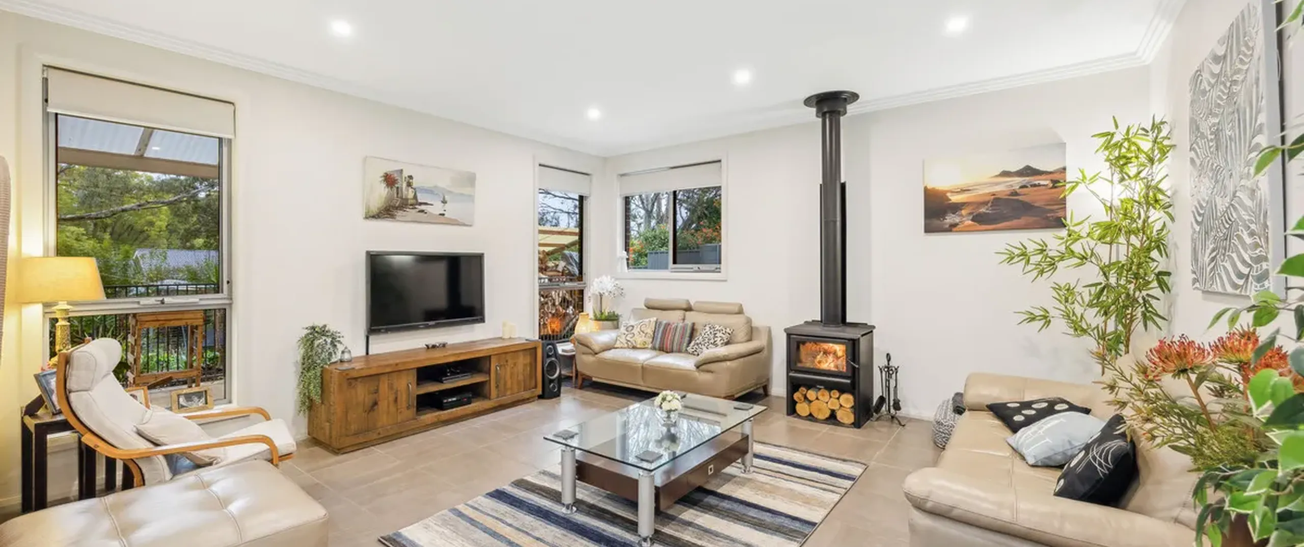 - Beautiful light filled family, dining and kitchen area with ceiling fan and wood fire heater, with dual sliding doors leading outside