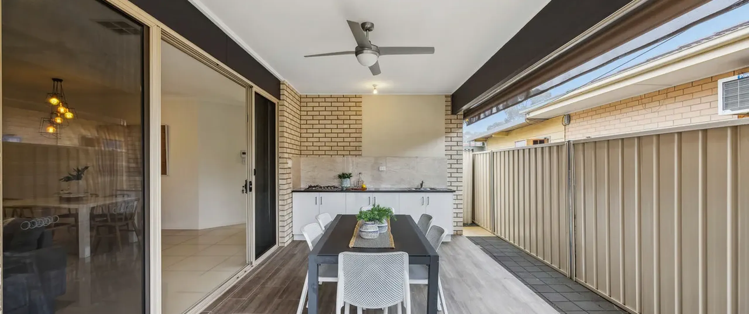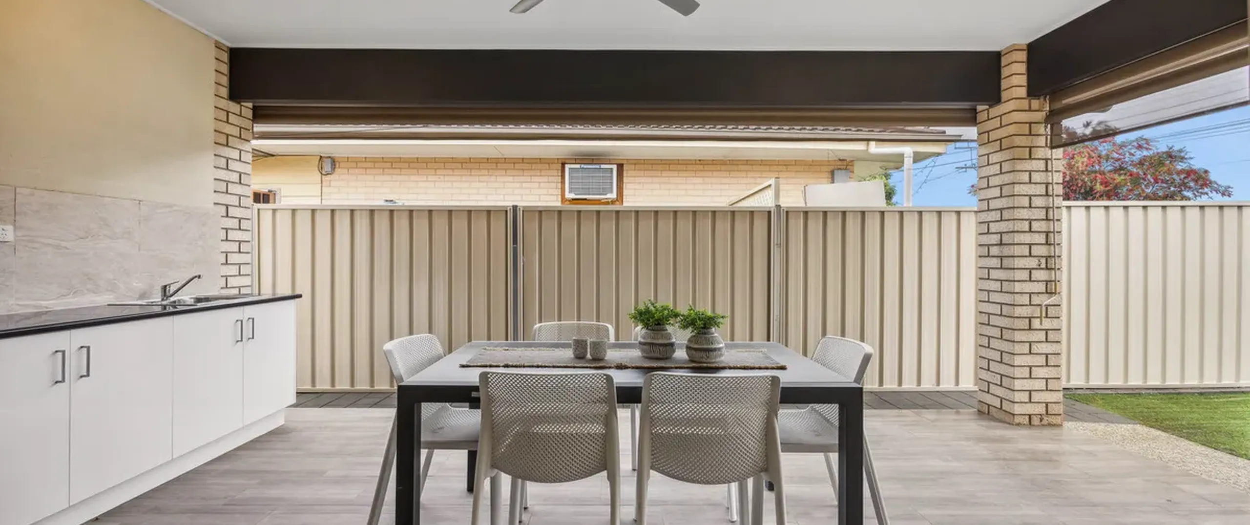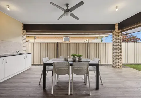 Unwind or entertain with ease in the exceptional outdoor entertaining area, complete with a ceiling fan and a built-in kitchen featuring a gas cooktop, sink, ample bench space and cupboards. This versatile space can be enclosed with café blinds or left open to overlook the lawn area, where kids and pets can run free and enjoy.