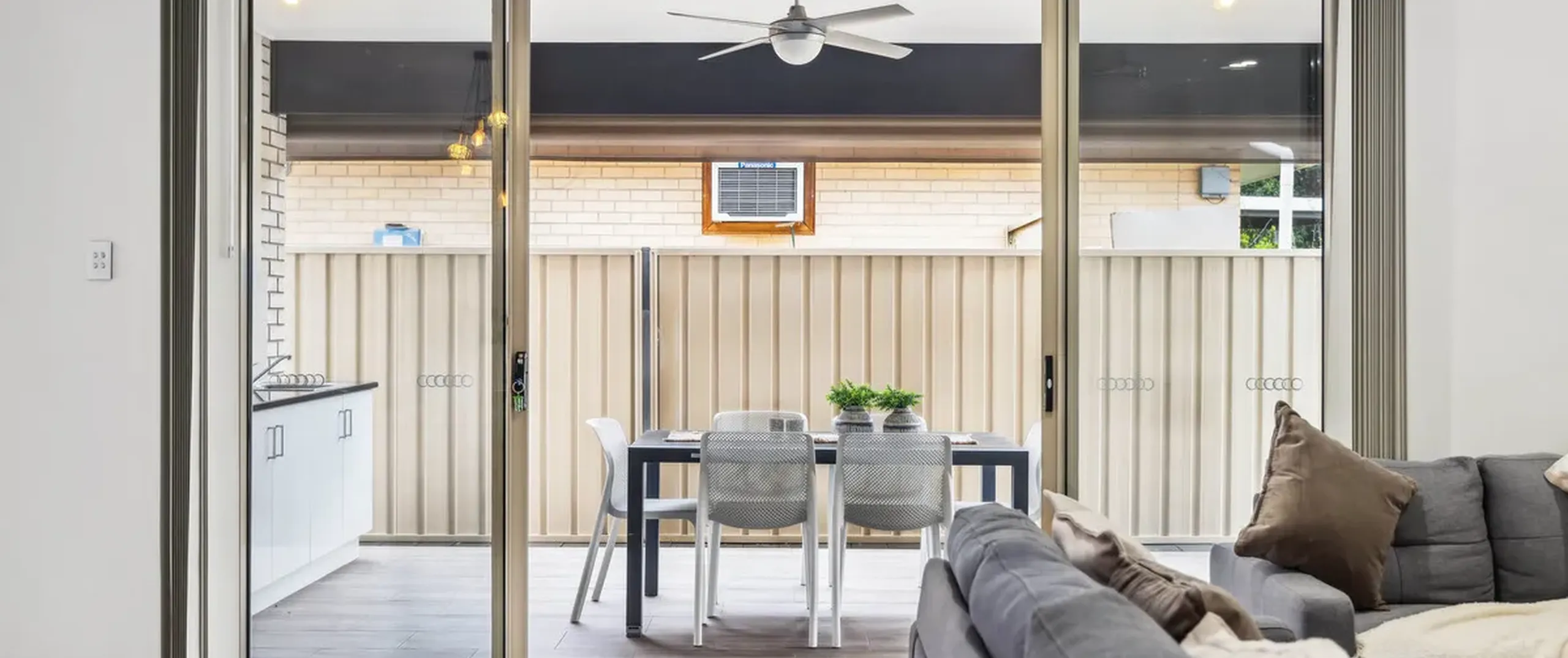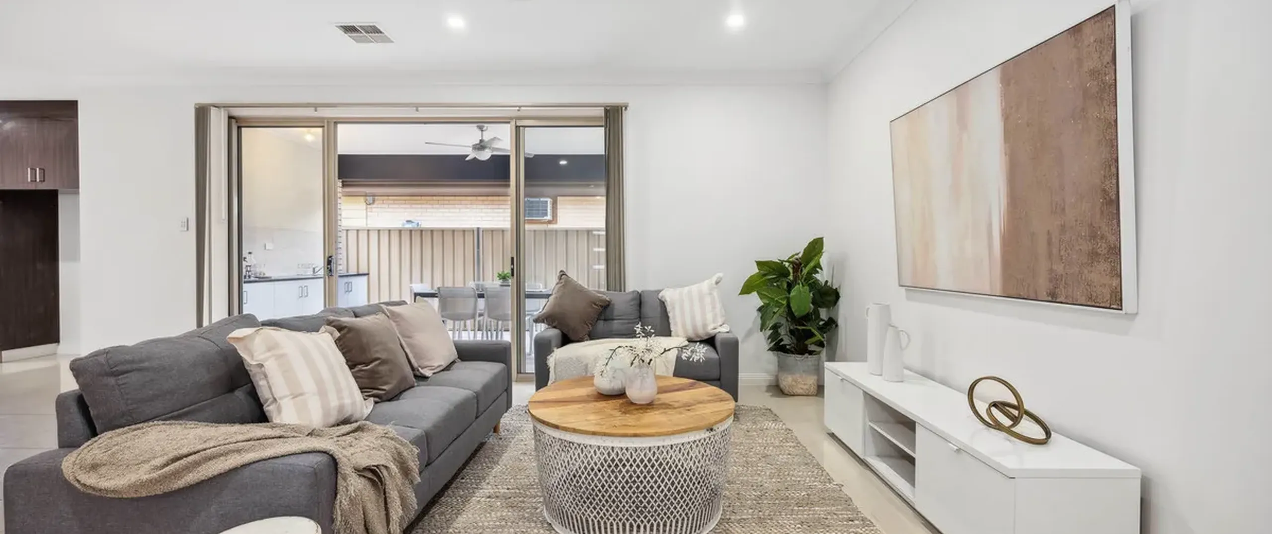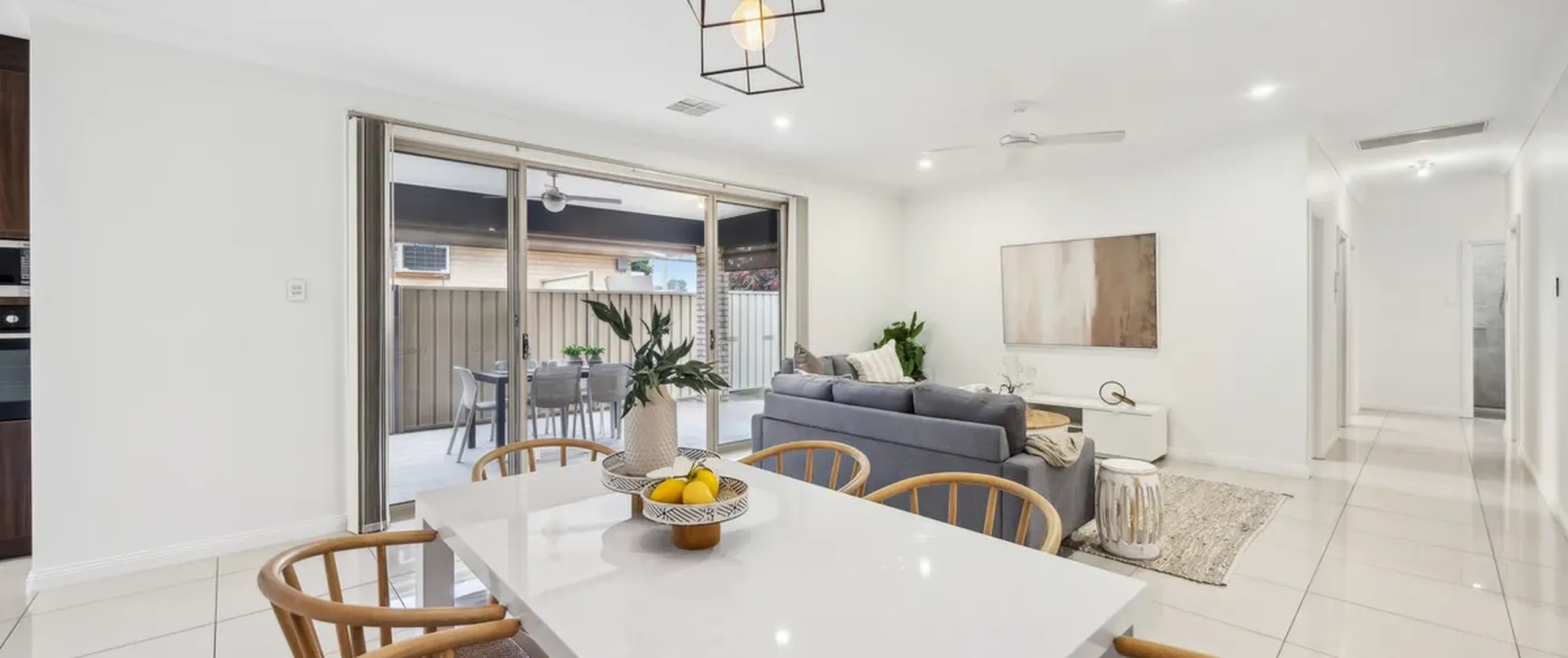 - Bright and airy open-plan living and dining space with ceiling fan
