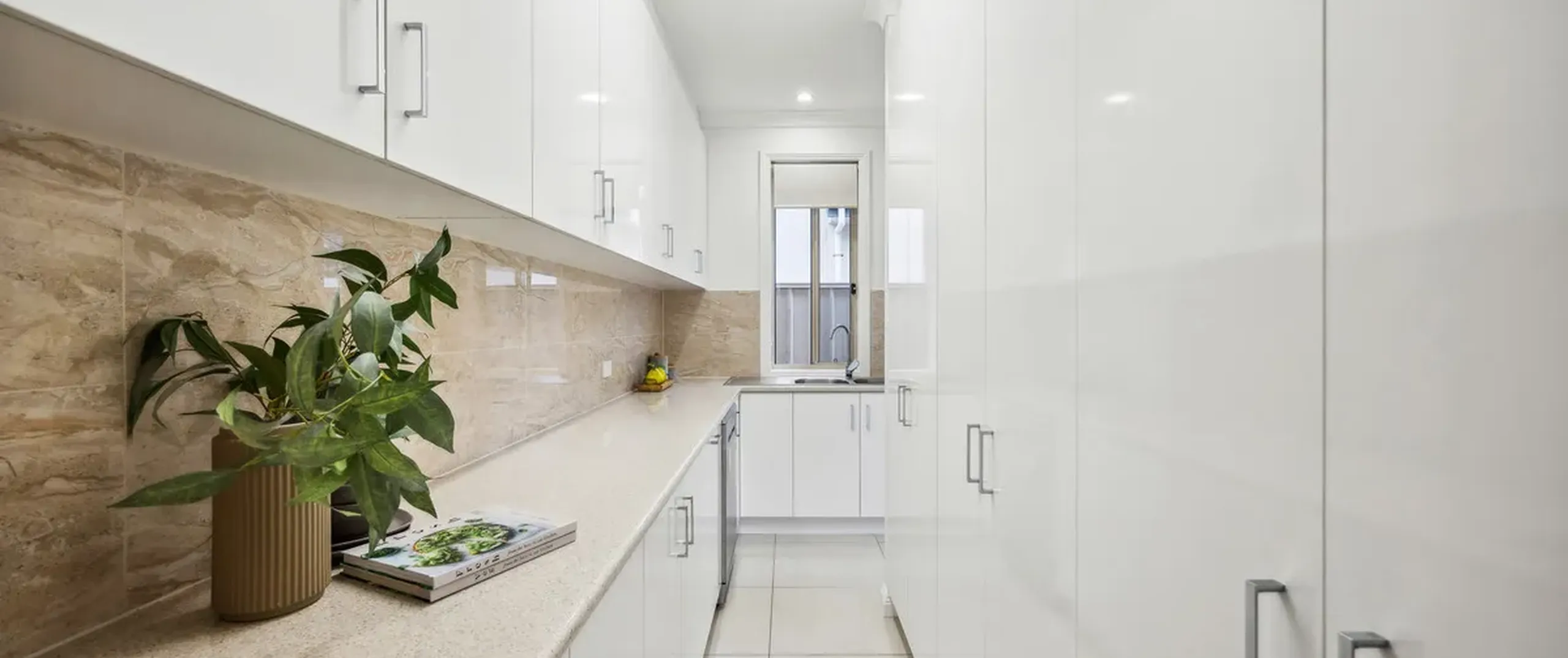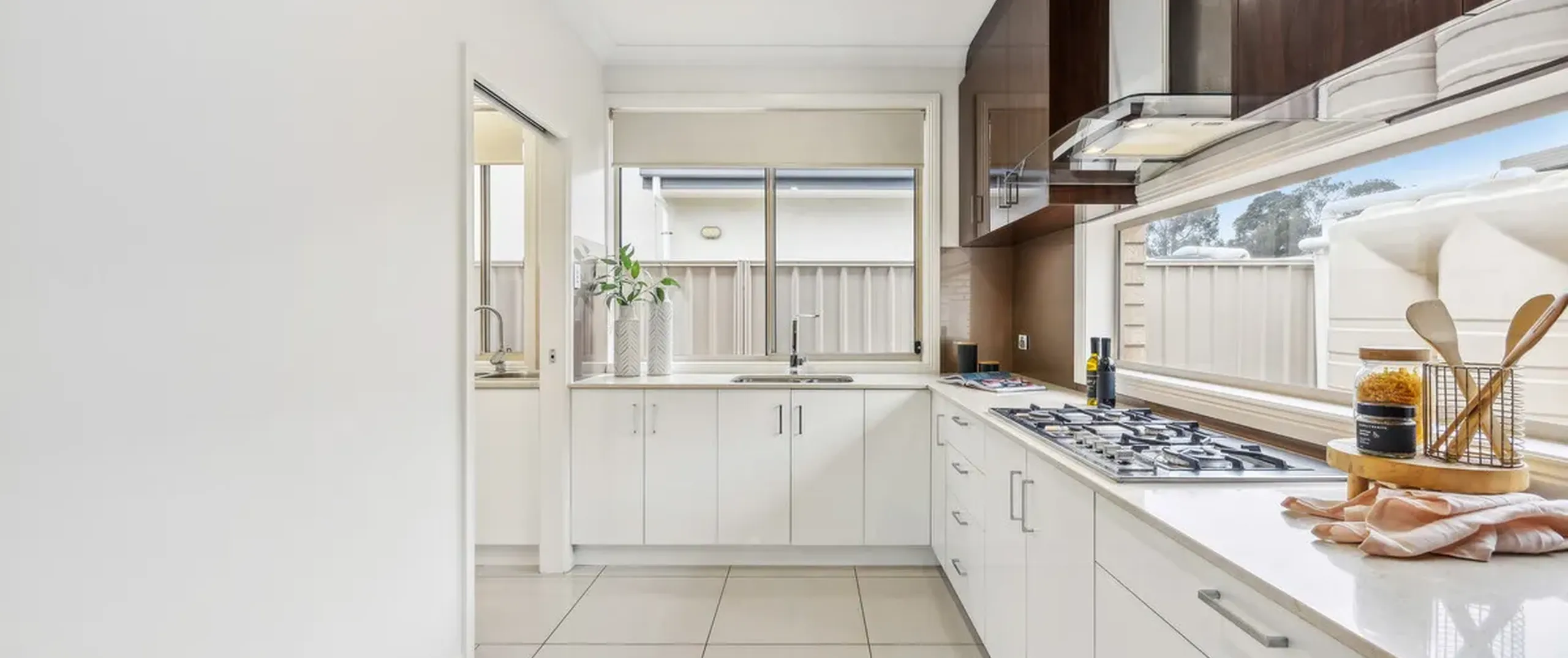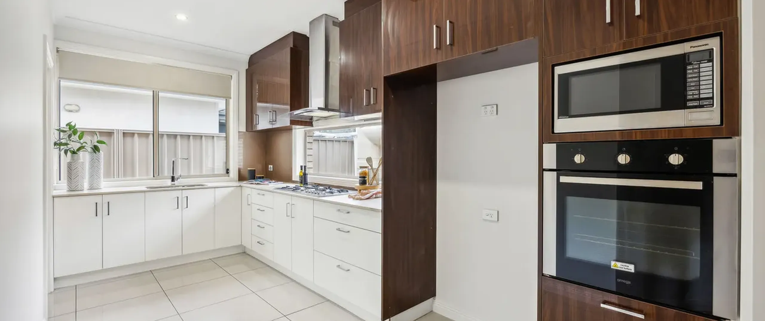 - Modern kitchen with gas cooktop, Omega electric oven, Omega dishwasher, Panasonic microwave and butler’s pantry featuring an additional sink and ample cupboard and bench space