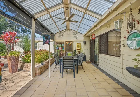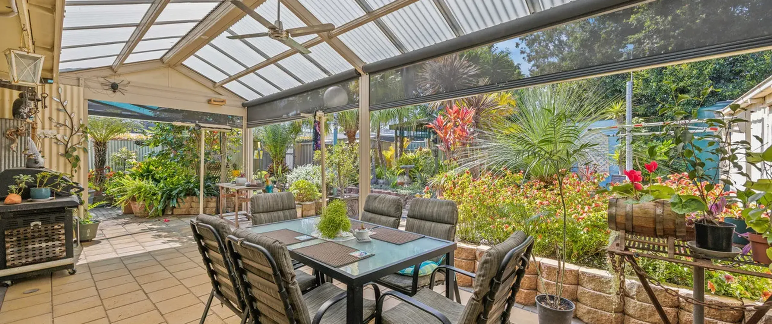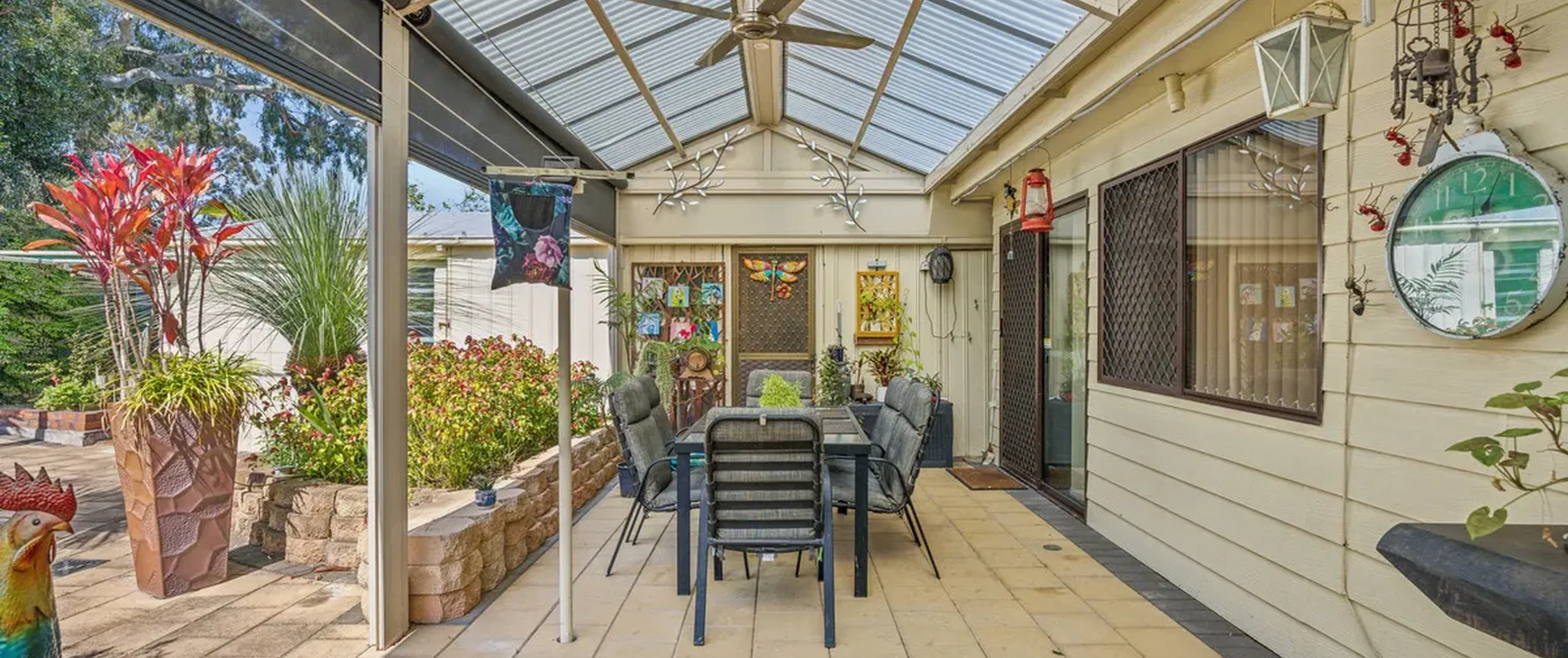 - Large verandah with pitched roof, ceiling fan and café blinds, ideal for outdoor entertaining