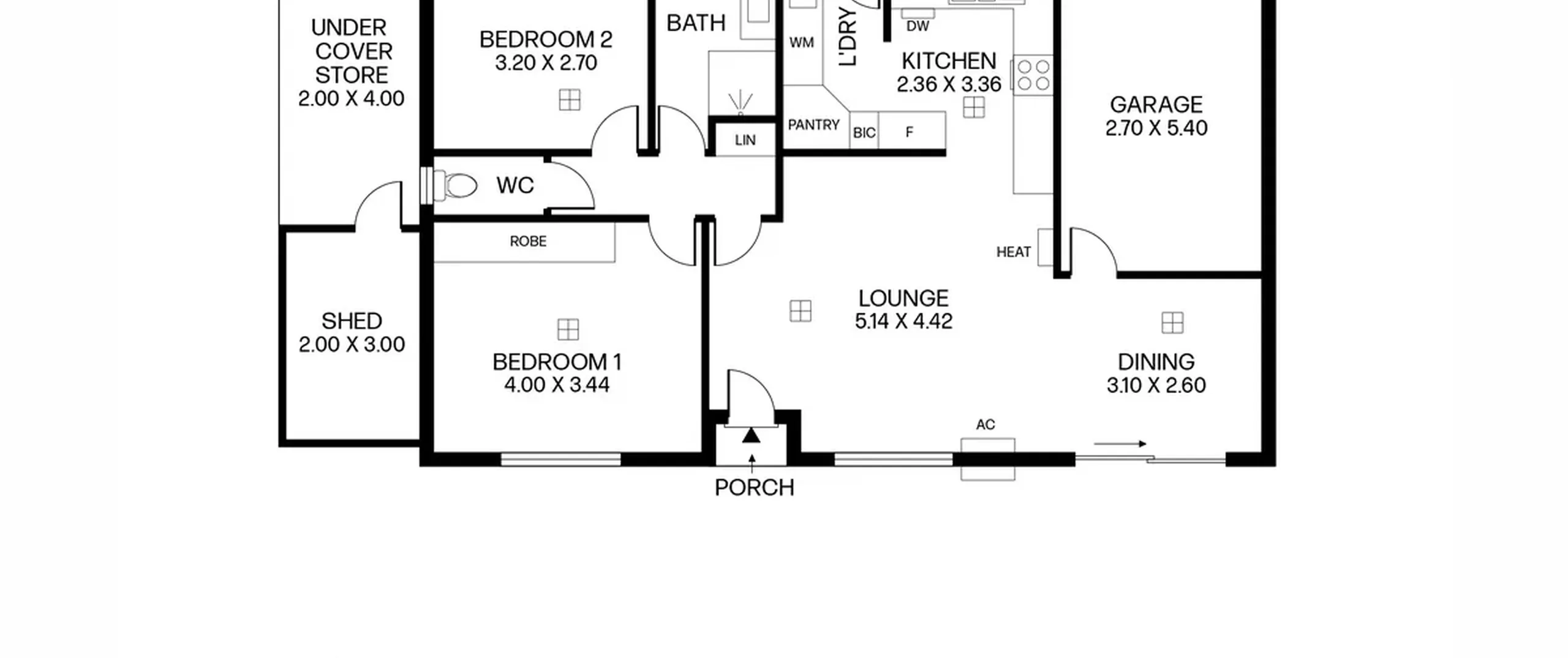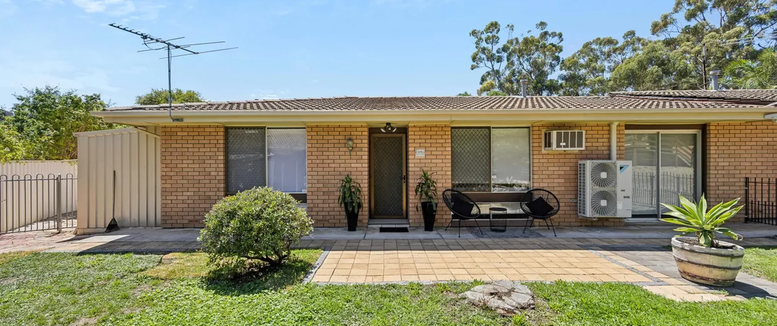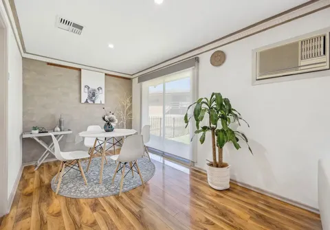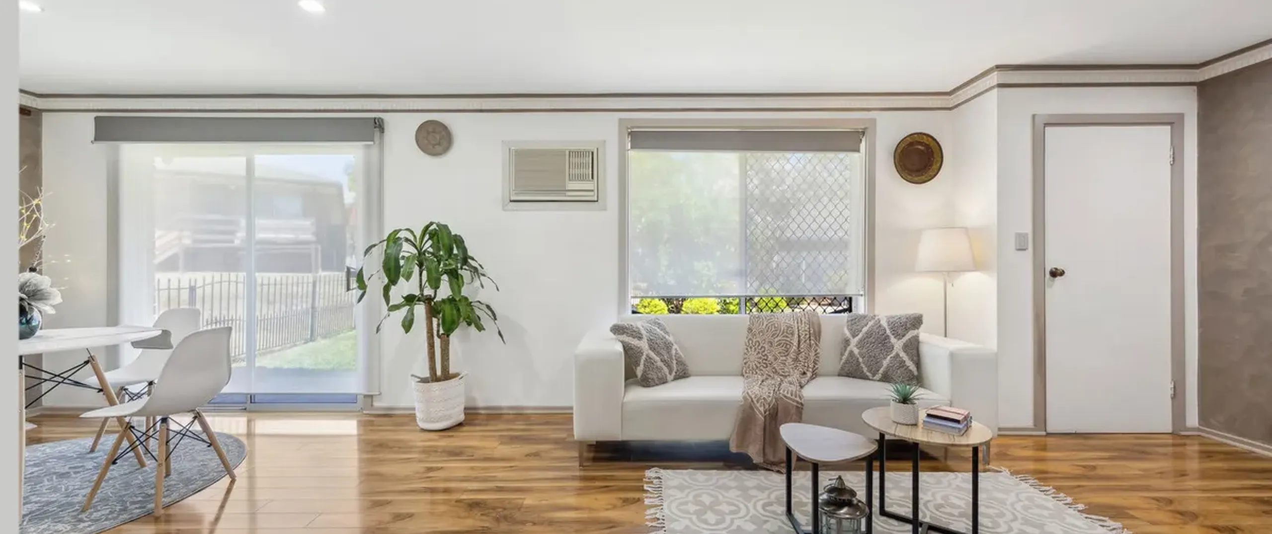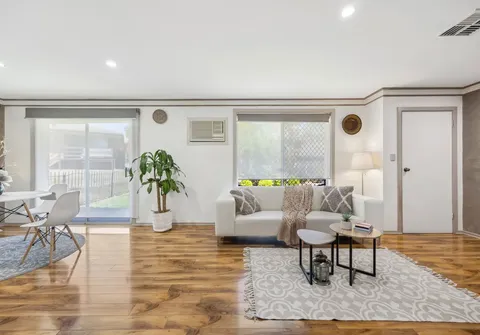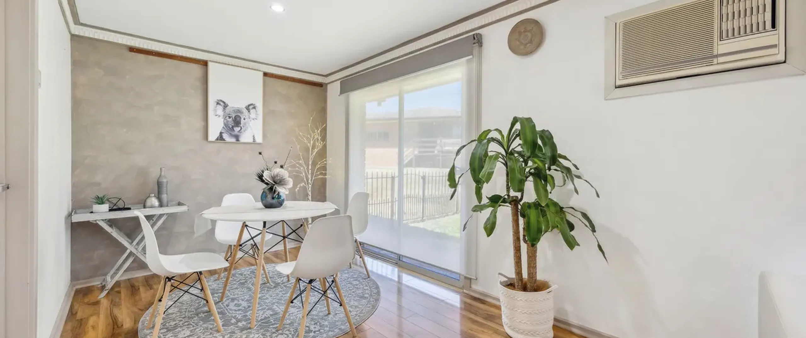 - Open-plan living and dining with LED downlights, gas wall heater, window wall air conditioner and direct access through sliding glass door to large enclosed front yard with both paving and grass