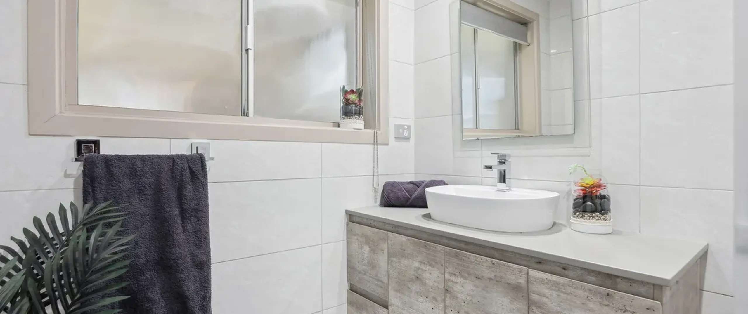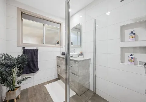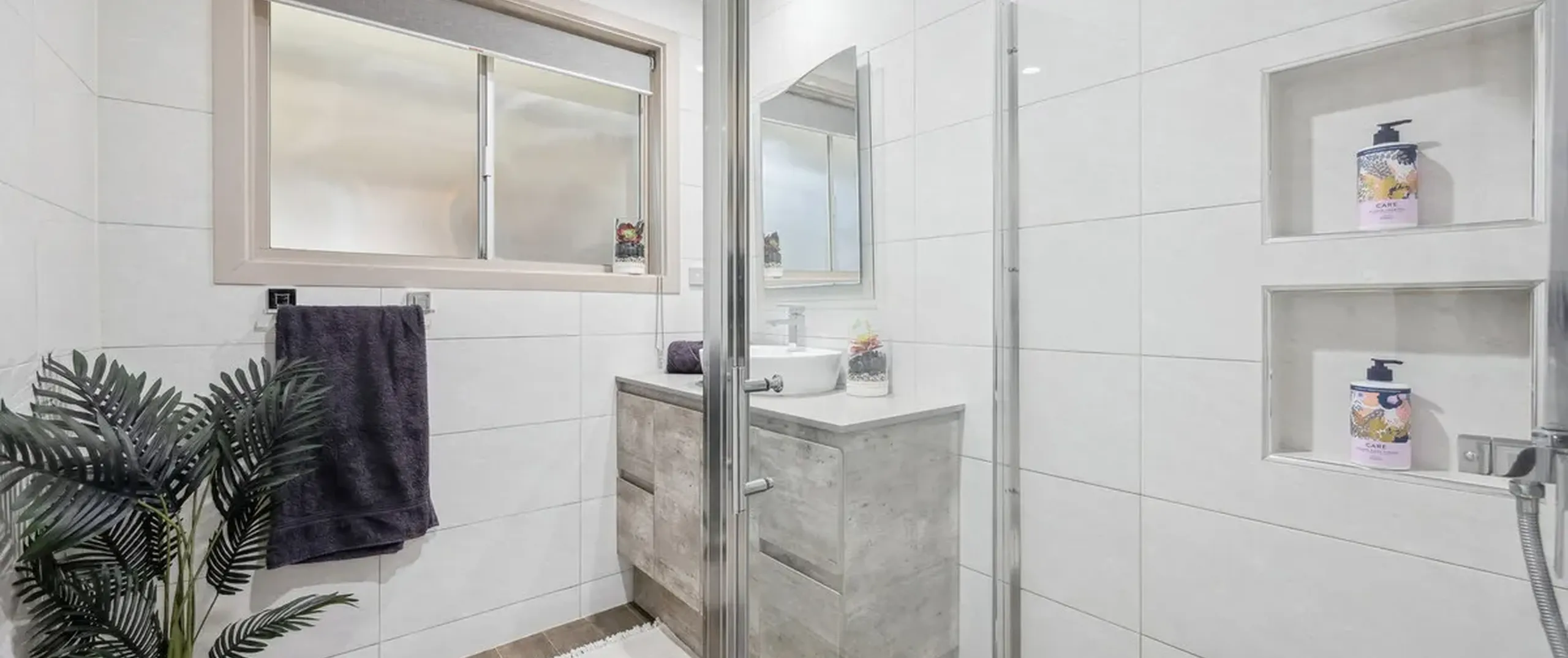 - Stylish main bathroom with floor-to-ceiling tiles and dual shower niches