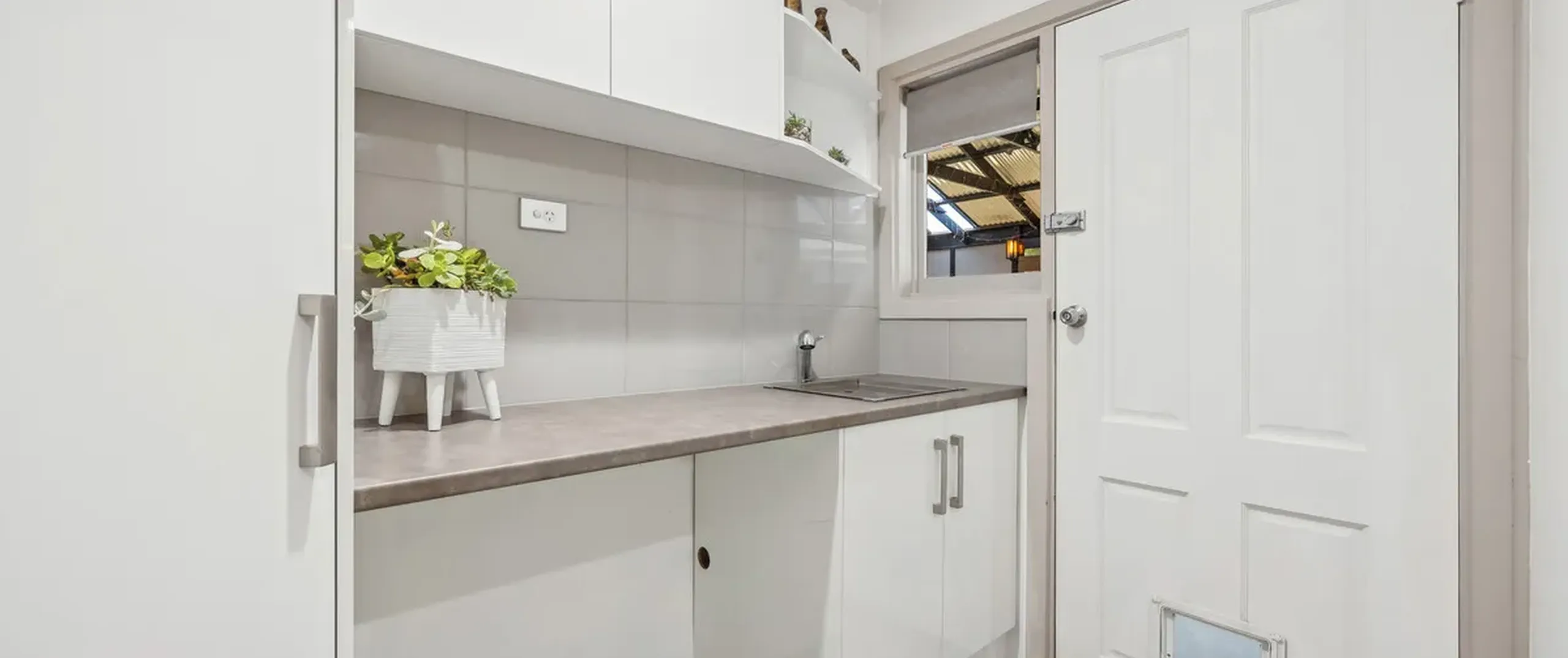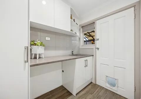 - Laundry with under-counter recess for washing machine, ample cupboard space and dog door installed