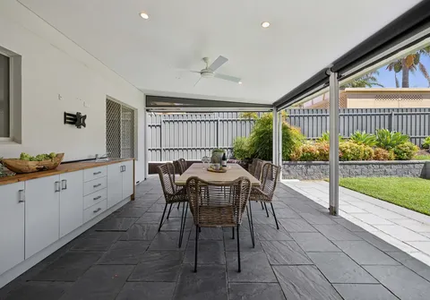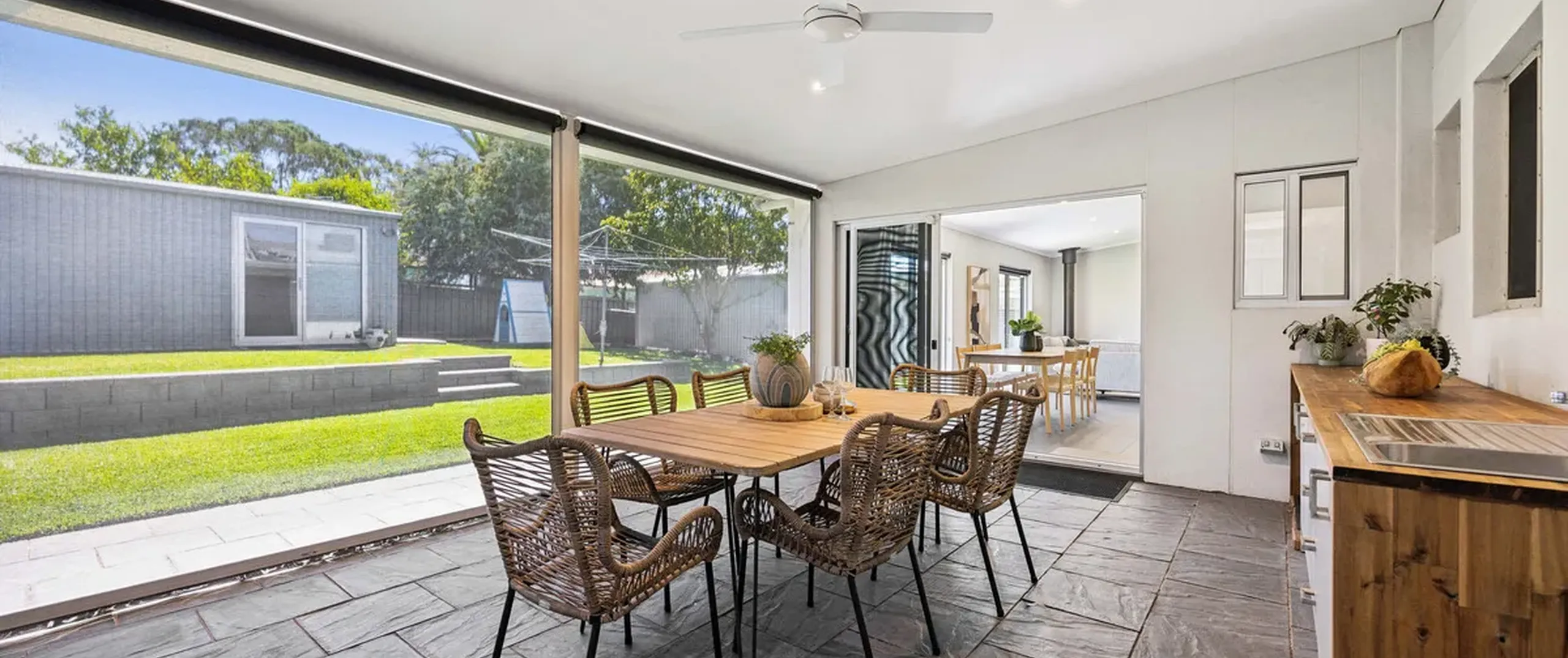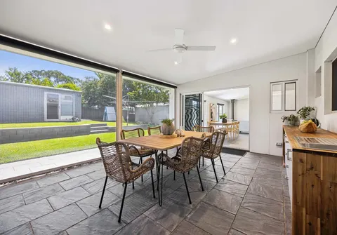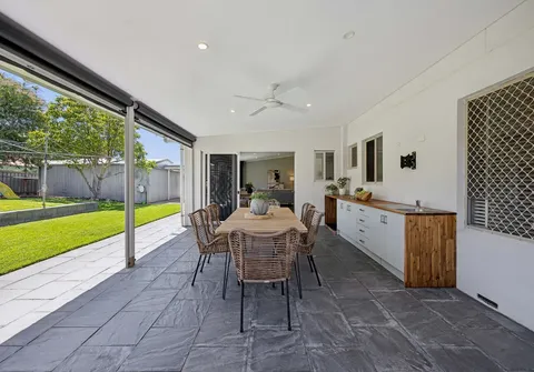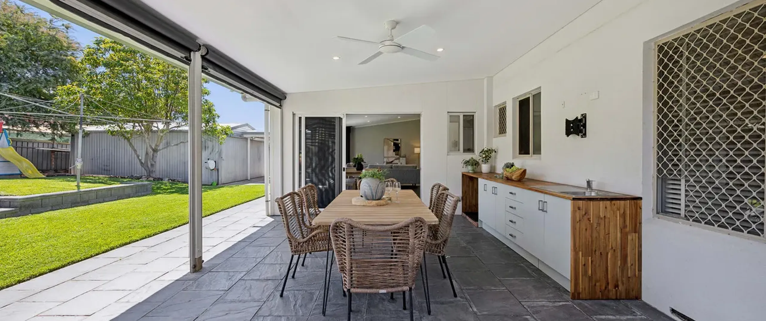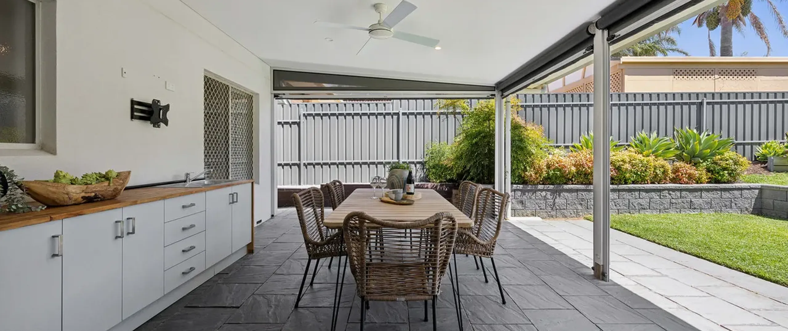 - Impressive outdoor entertaining area with blinds, ceiling fan and an outdoor kitchen including sink and ample bench and cupboard space